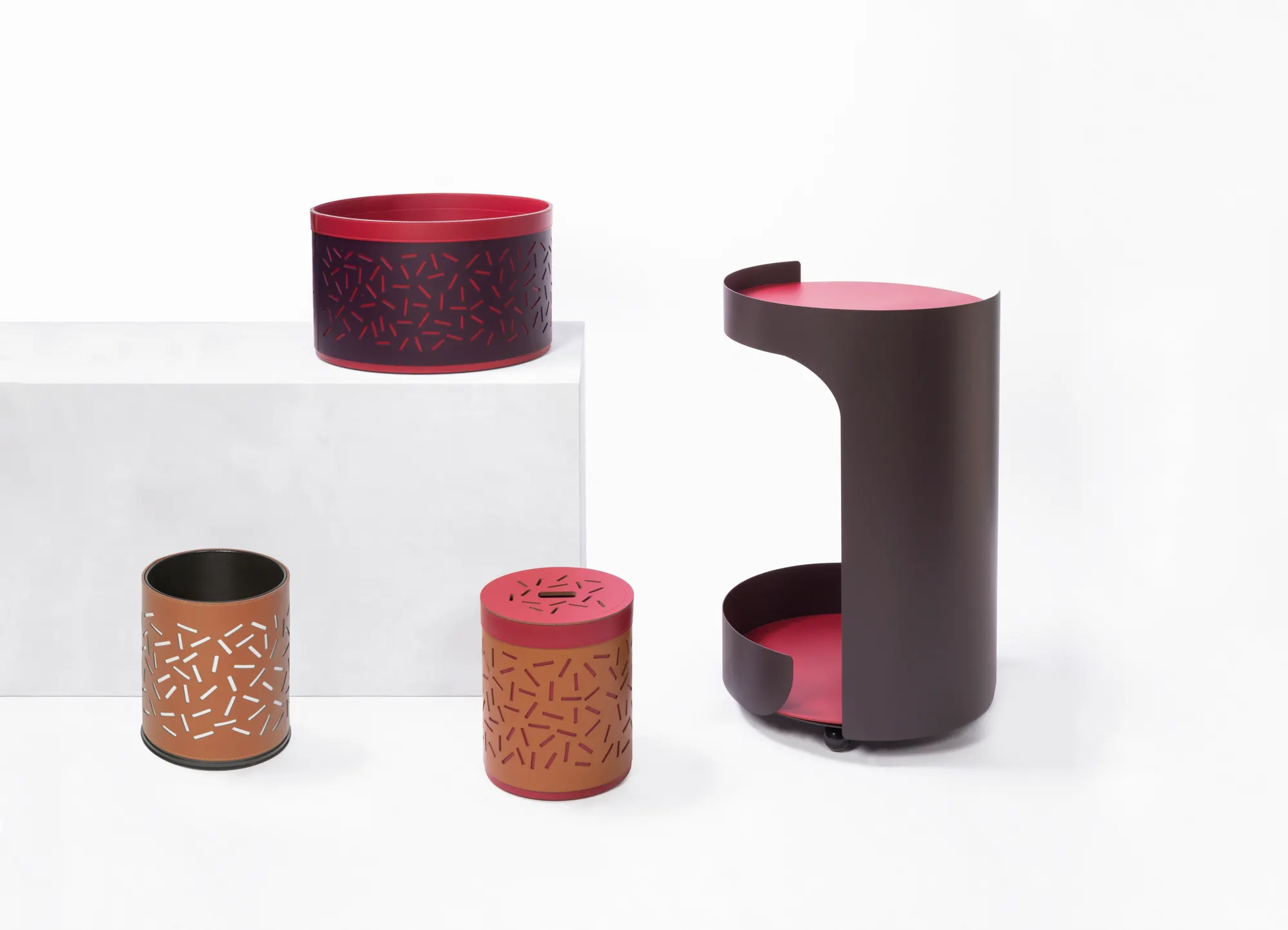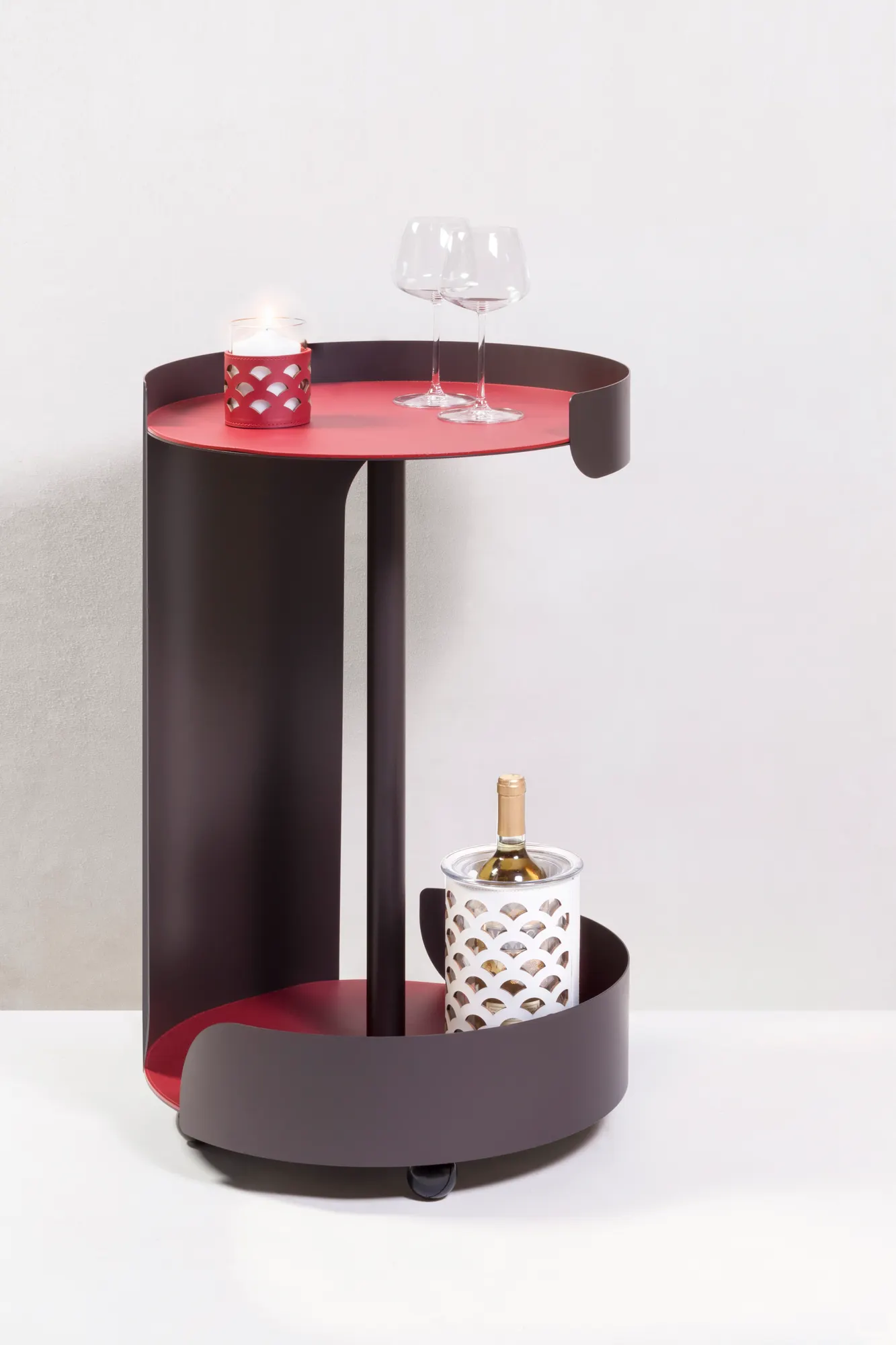 This trolley is provided with wheels and features a coated metal structure and support surfaces made of finest regenerated leather with water-resistant and UV-resistant finish. The elegant yet dynamic lines and contained size make Carousel ideal for any kind of environment.