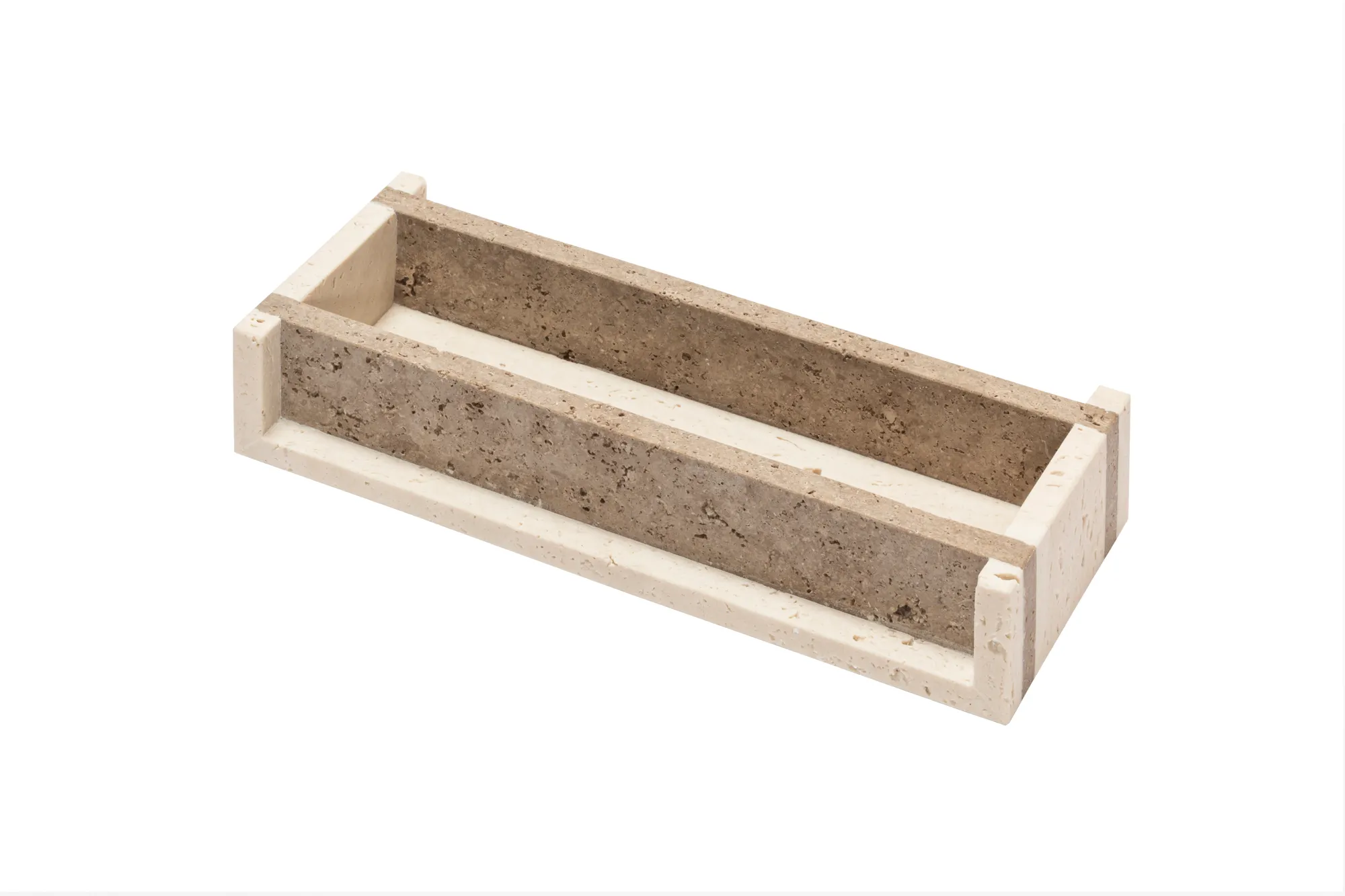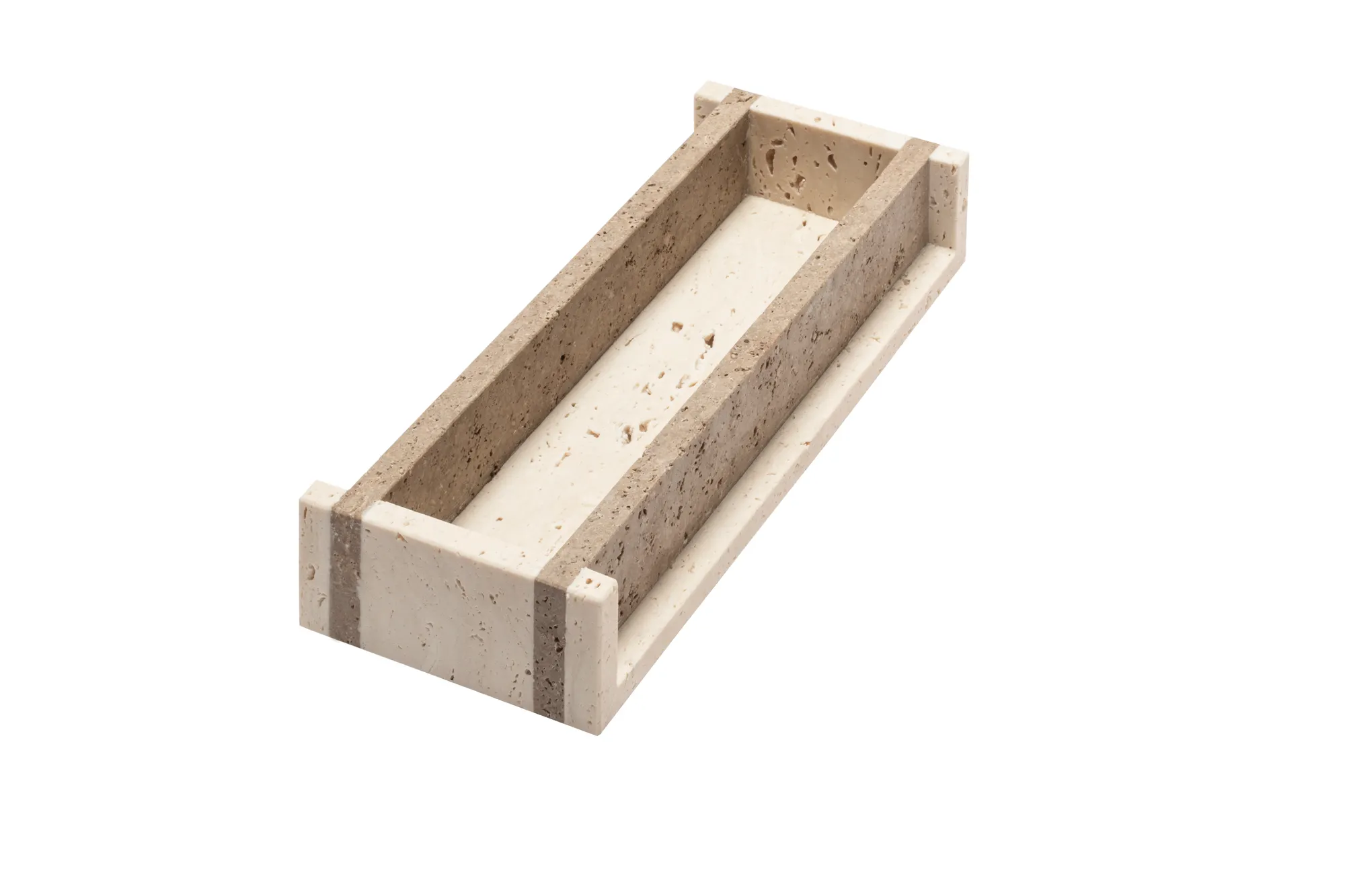 With its monolithic, purely geometric volumes, this collection for the office is characterized by graphic details born from the juxtaposition of two nuances of travertine, which creates a distinctive visual contrast with the material and porous aspect of such marble. Design by Simone Fanciullacci.