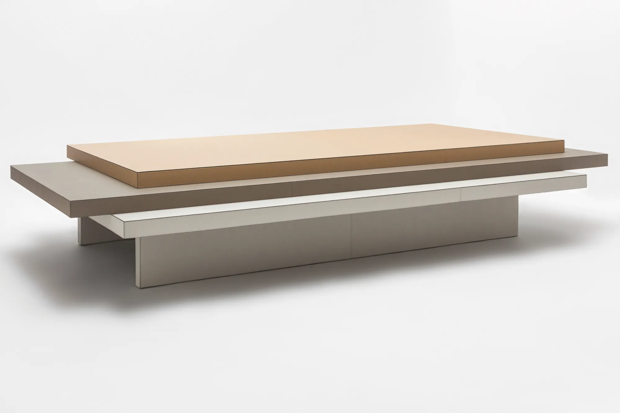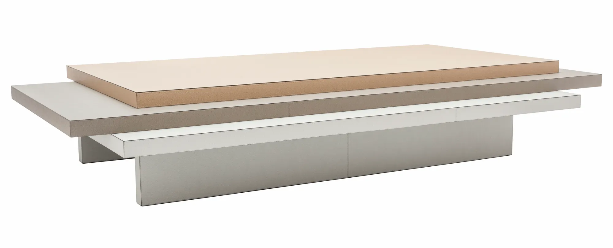 As in the iconic architectural masterpiece of Frank Lloyd Wright, cantilevered leather covered layers seem to float in the air above metal legs, creating coffee tables that are expression of a research of dynamism and rhythm.