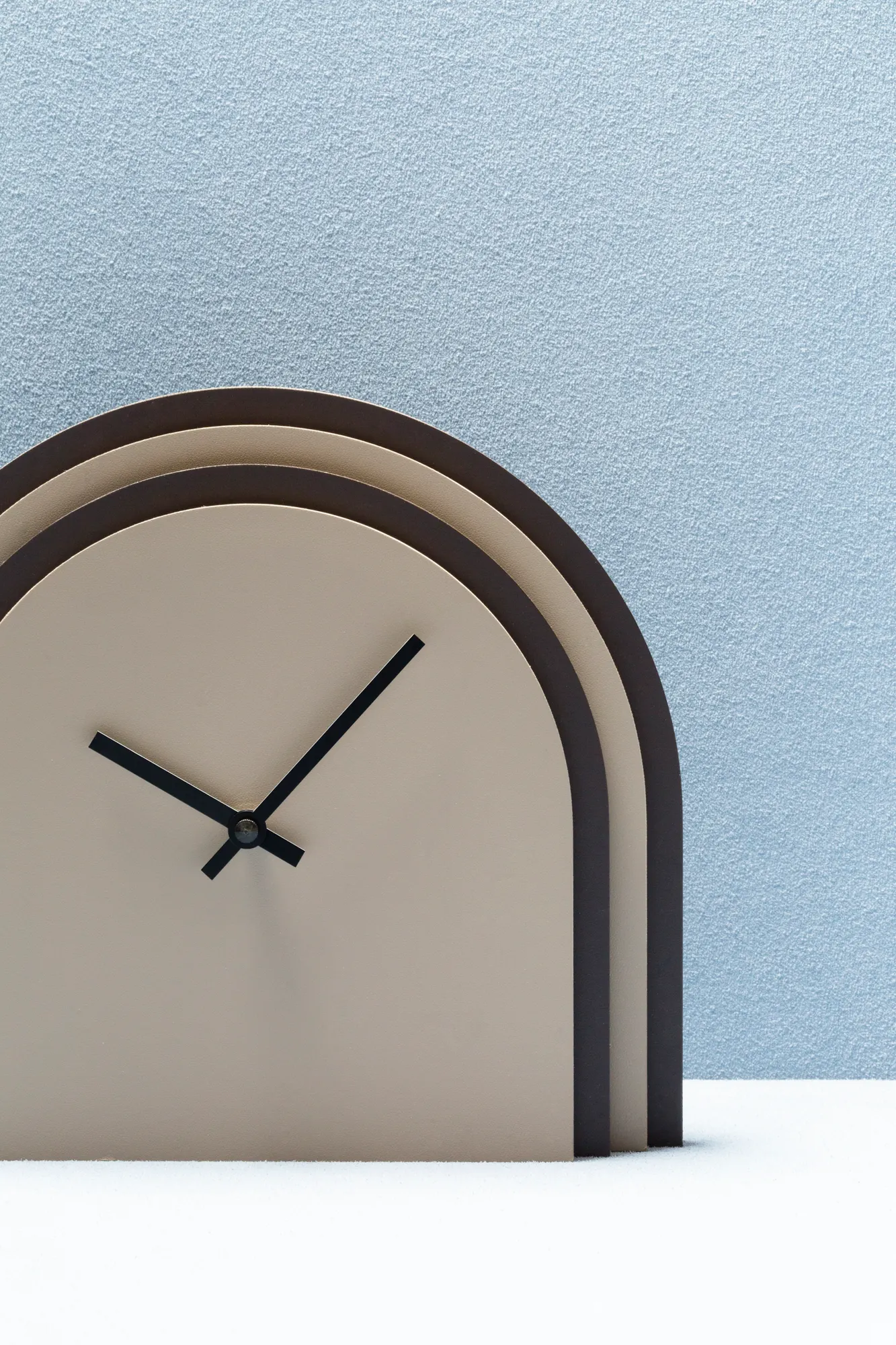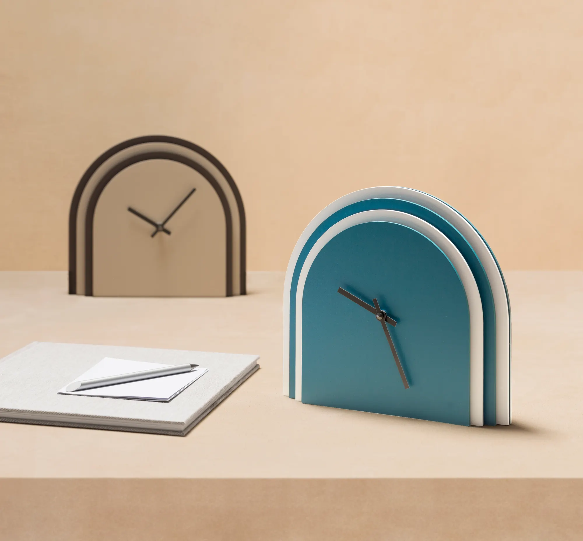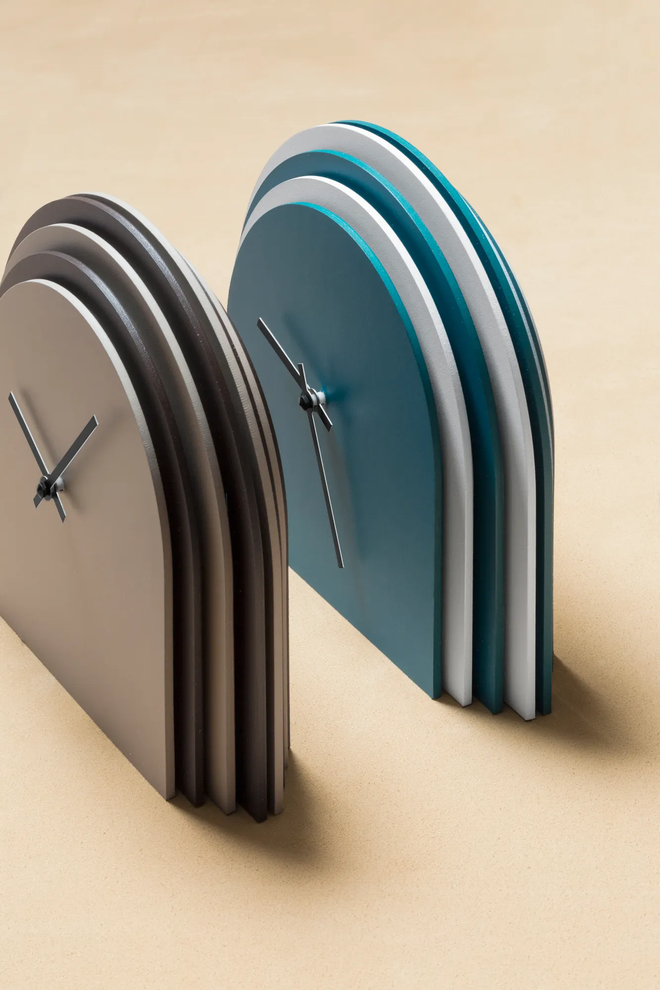 Desk clock made of several overlaying sheets of Tecnocuoio®. As a sort of miniature architectural element, it provides the shapes with rhythm and lightness by playing with color, repetition and shadows that generate between one layer and the other. It is possible to choose any color combination from our chart for the desk clock's bicolor version.