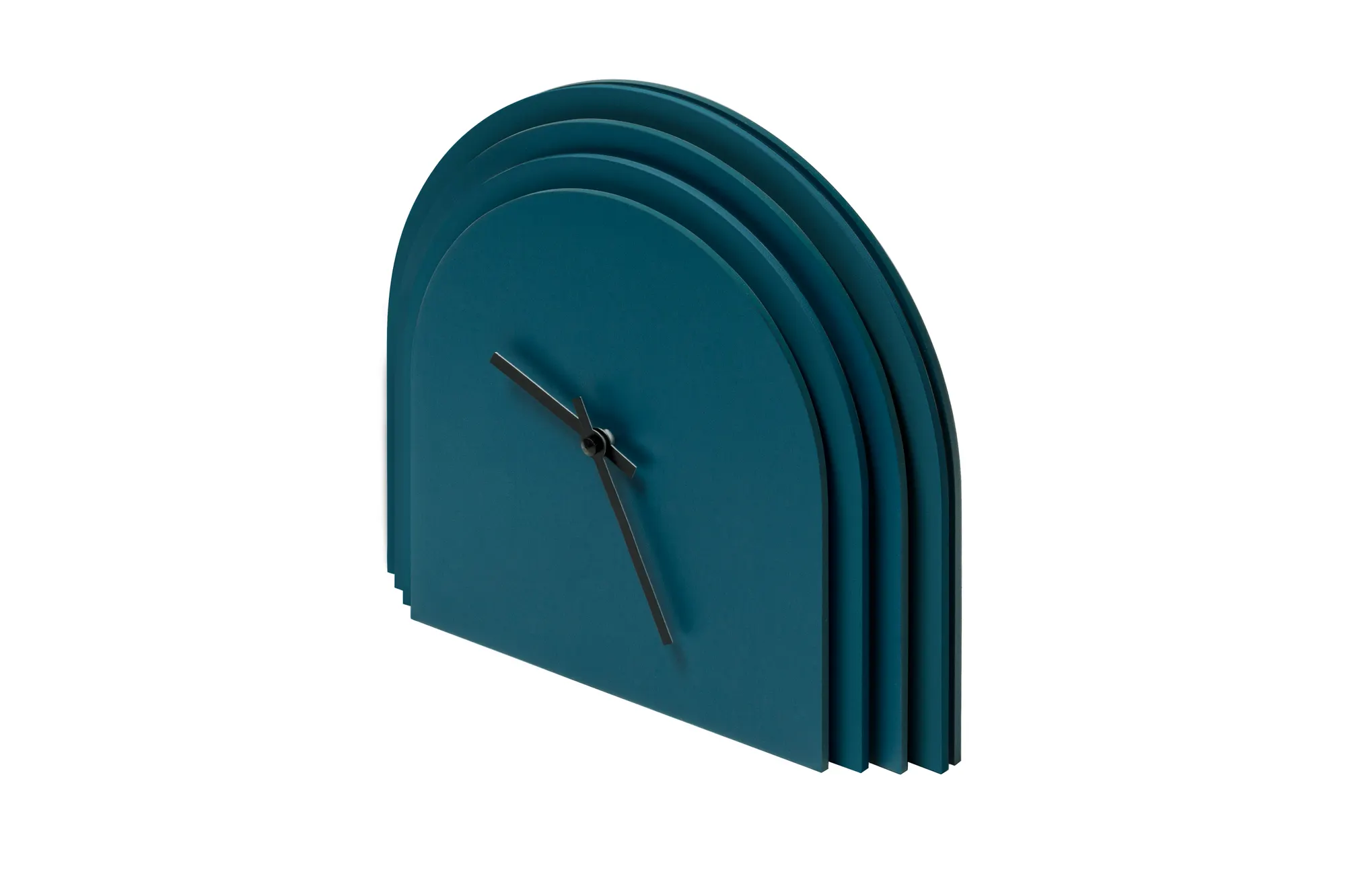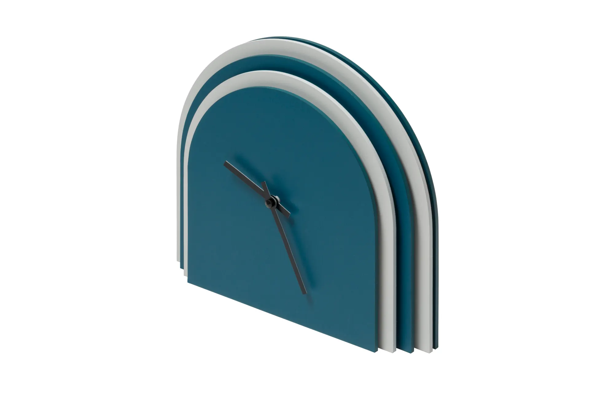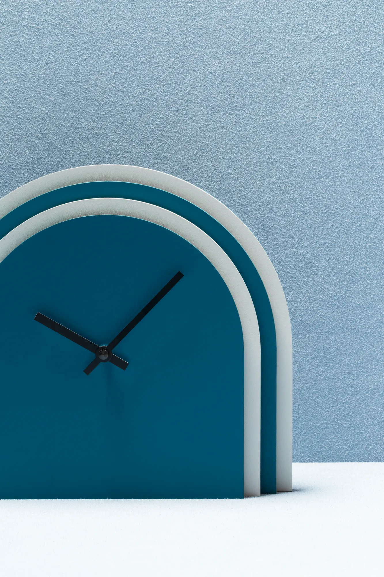 Desk clock made of several overlaying sheets of Tecnocuoio®. As a sort of miniature architectural element, it provides the shapes with rhythm and lightness by playing with color, repetition and shadows that generate between one layer and the other. It is possible to choose any color combination from our chart for the desk clock's bicolor version.