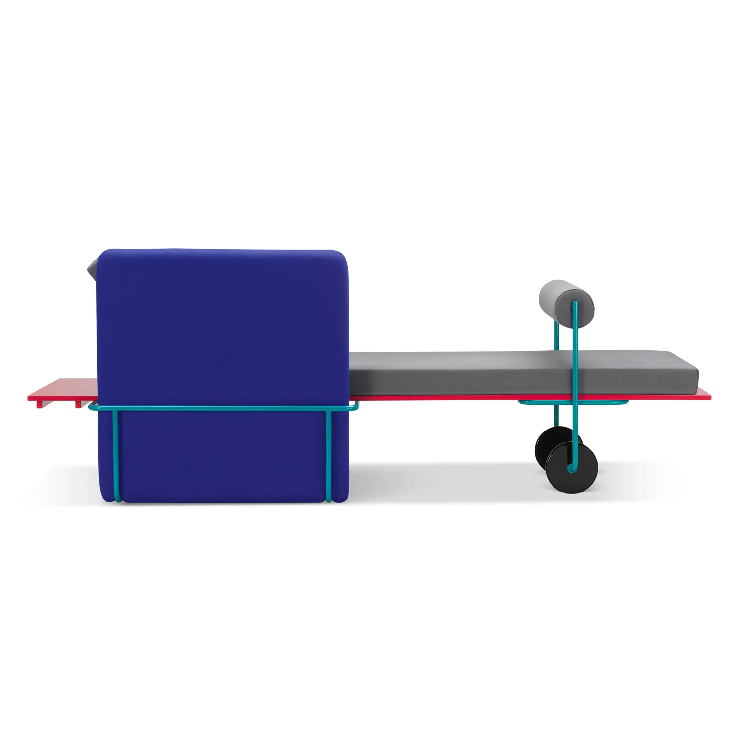 The essential forms and elegant volumes of Century travel on a pair of wheels. The aqua green structure in metal tubing, a reminder of the famous Bauhaus furnishings, has been ironically reinterpreted by Andrea Branzi in a playful but also iconic way: at one point, it bends over a set of wheels. In a skillful game of interlocking geometric planes, the designer reformulates the idea of the chaise longue. The various parts are emphasized by precise choices of colors and materials: the support surface in red painted wood, the seat, armrest and back padded with wool and covered in gray and blue fabric. A desire to astonish, but with an awareness of functional needs.