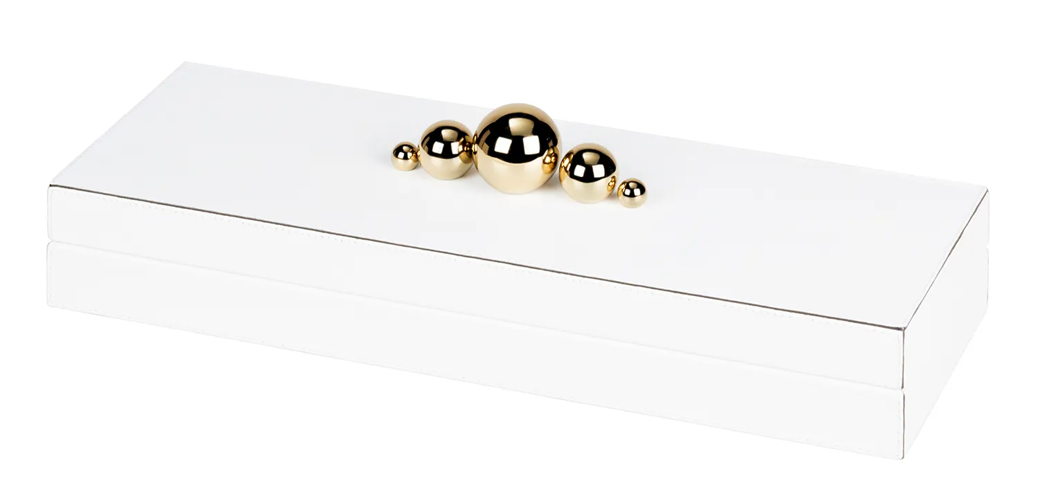 The contrast between pure geometric forms, such as the prism and the sphere, has always fascinated the human being. In a game of references between the architecture of Etienne-Louis Boullée and the surrealist sculptures of Pol Bury, the golden spheres of this collection transform the simple handle of a box into an element of high decoration that invites to come closer and explore its shape and function.