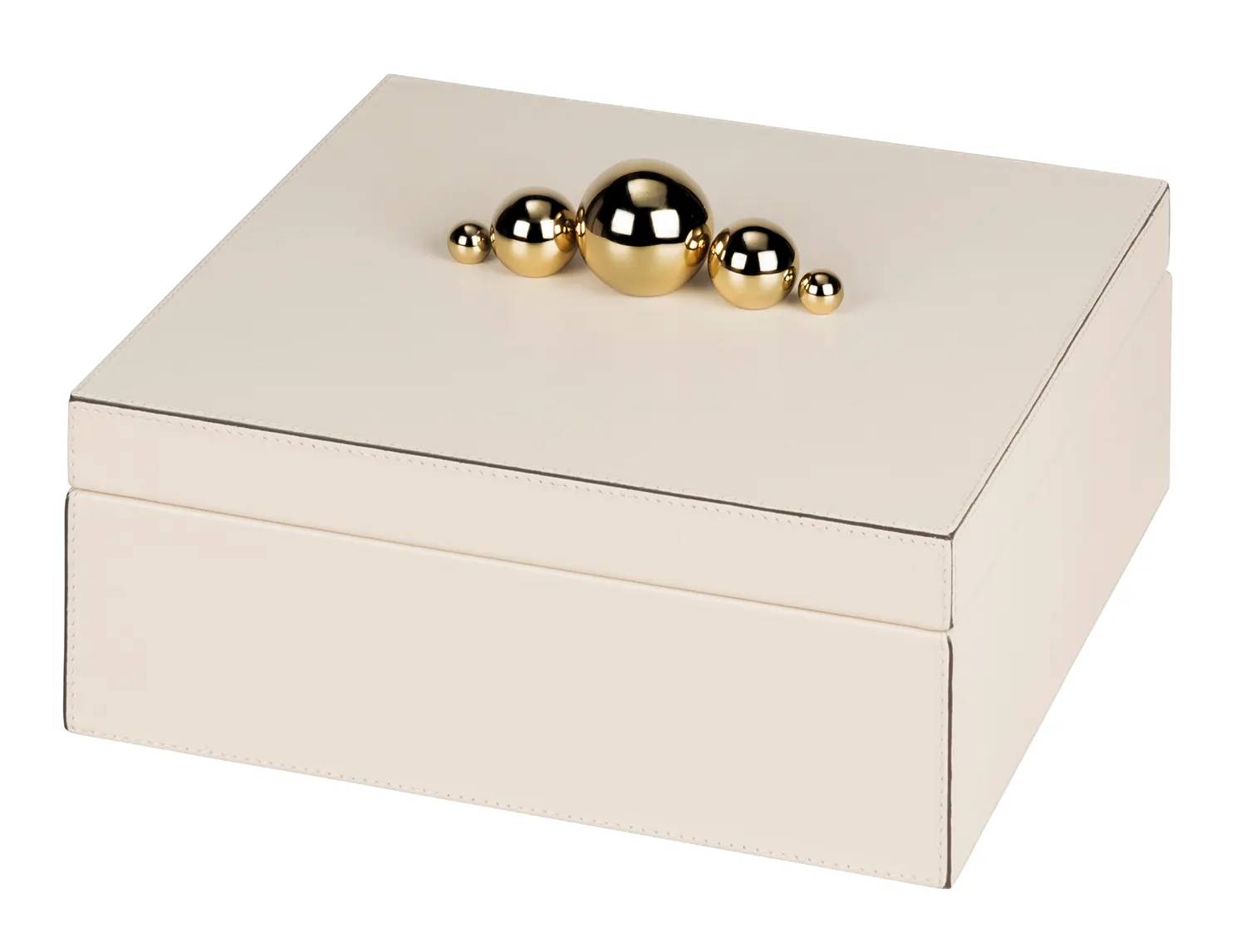 The contrast between pure geometric forms, such as the prism and the sphere, has always fascinated the human being. In a game of references between the architecture of Etienne-Louis Boullée and the surrealist sculptures of Pol Bury, the golden spheres of this collection transform the simple handle of a box into an element of high decoration that invites to come closer and explore its shape and function.