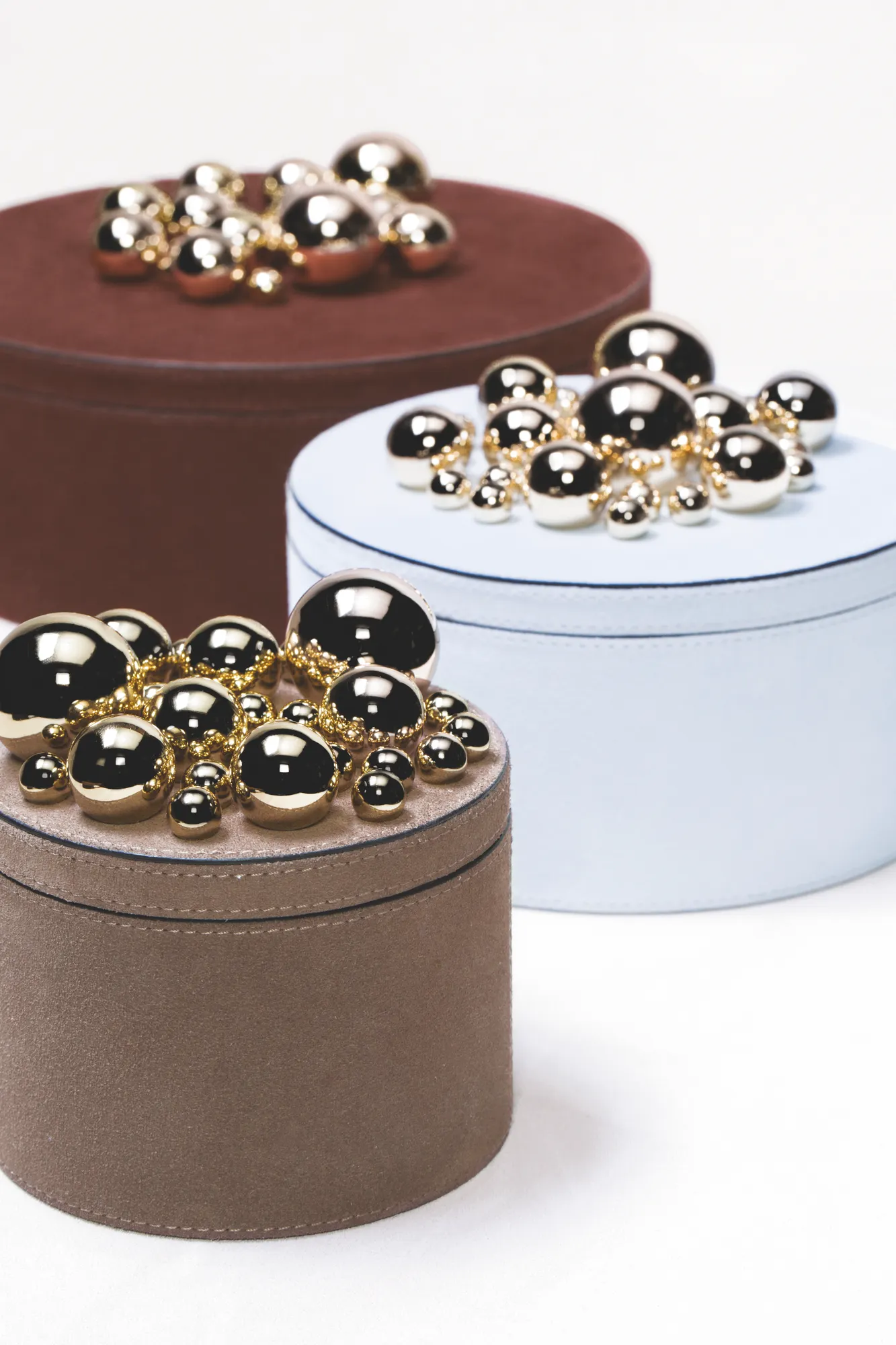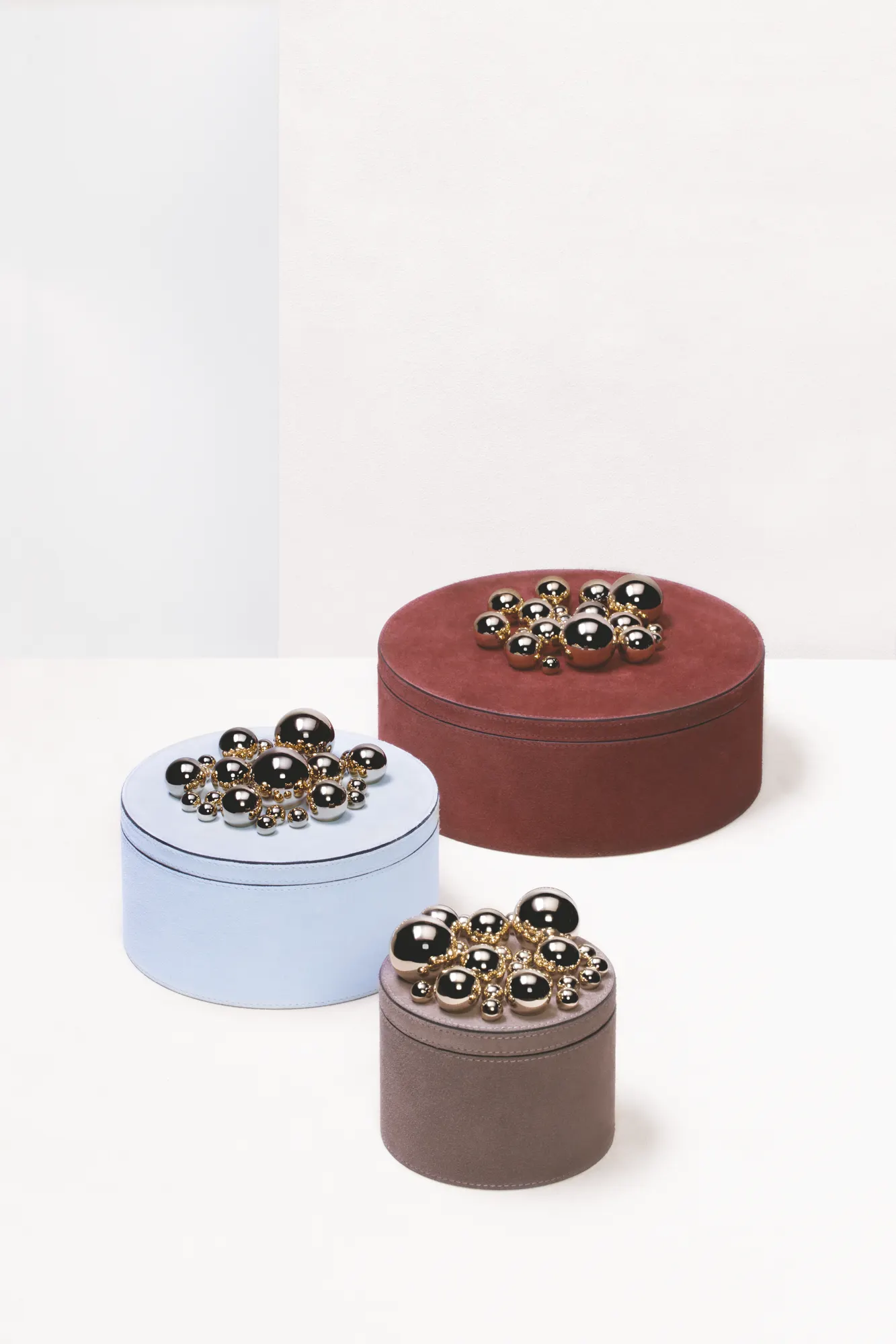 The contrast between pure geometric forms, such as the prism and the sphere, has always fascinated the human being. In a game of references between the architecture of Etienne-Louis Boullée and the surrealist sculptures of Pol Bury, the golden spheres of this collection transform the simple handle of a box into an element of high decoration that invites to come closer and explore its shape and function. The same spheres, scattered on trays, take us on a travel through metaphysical landscapes.