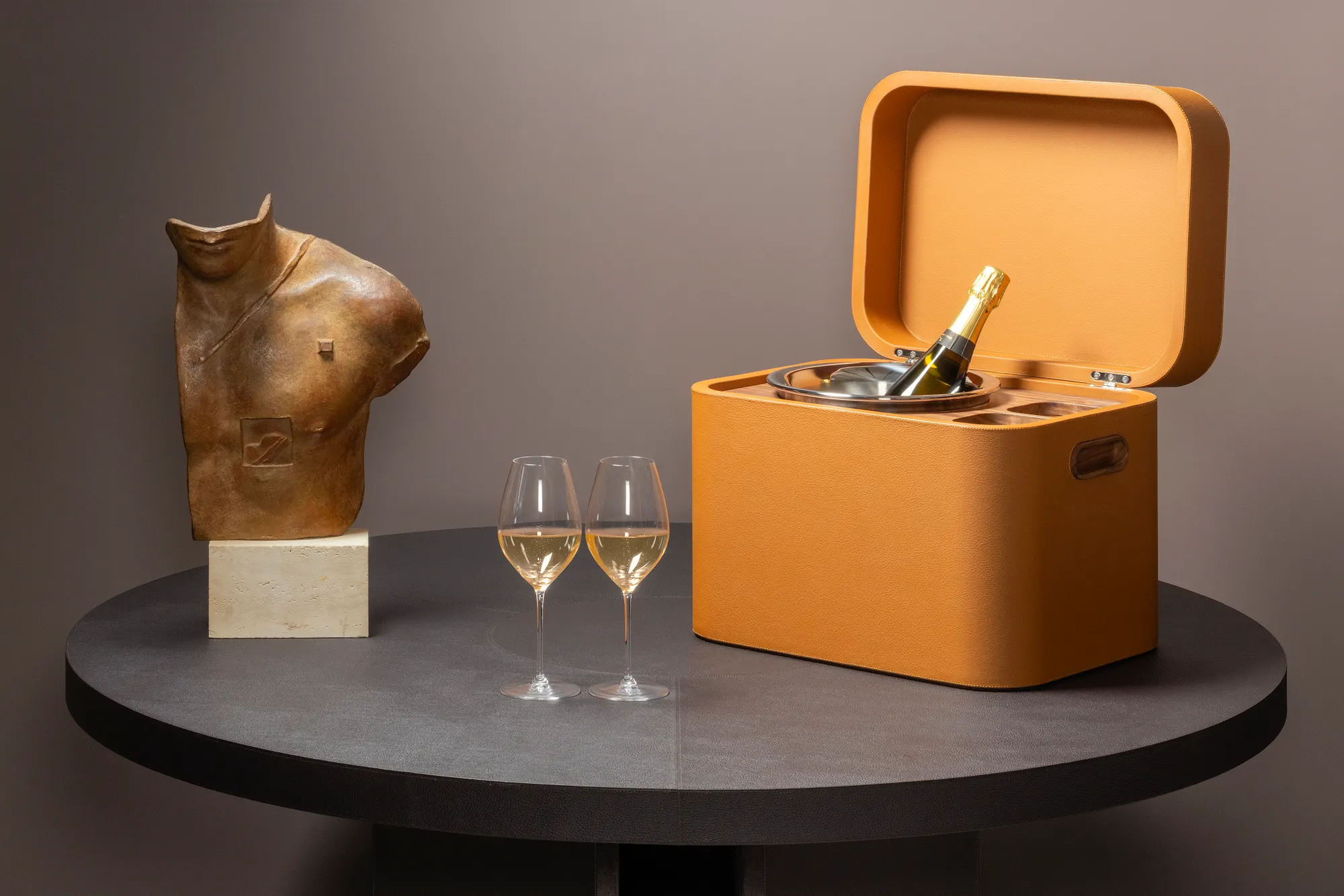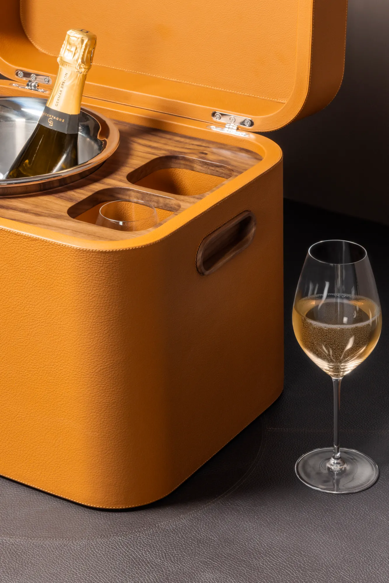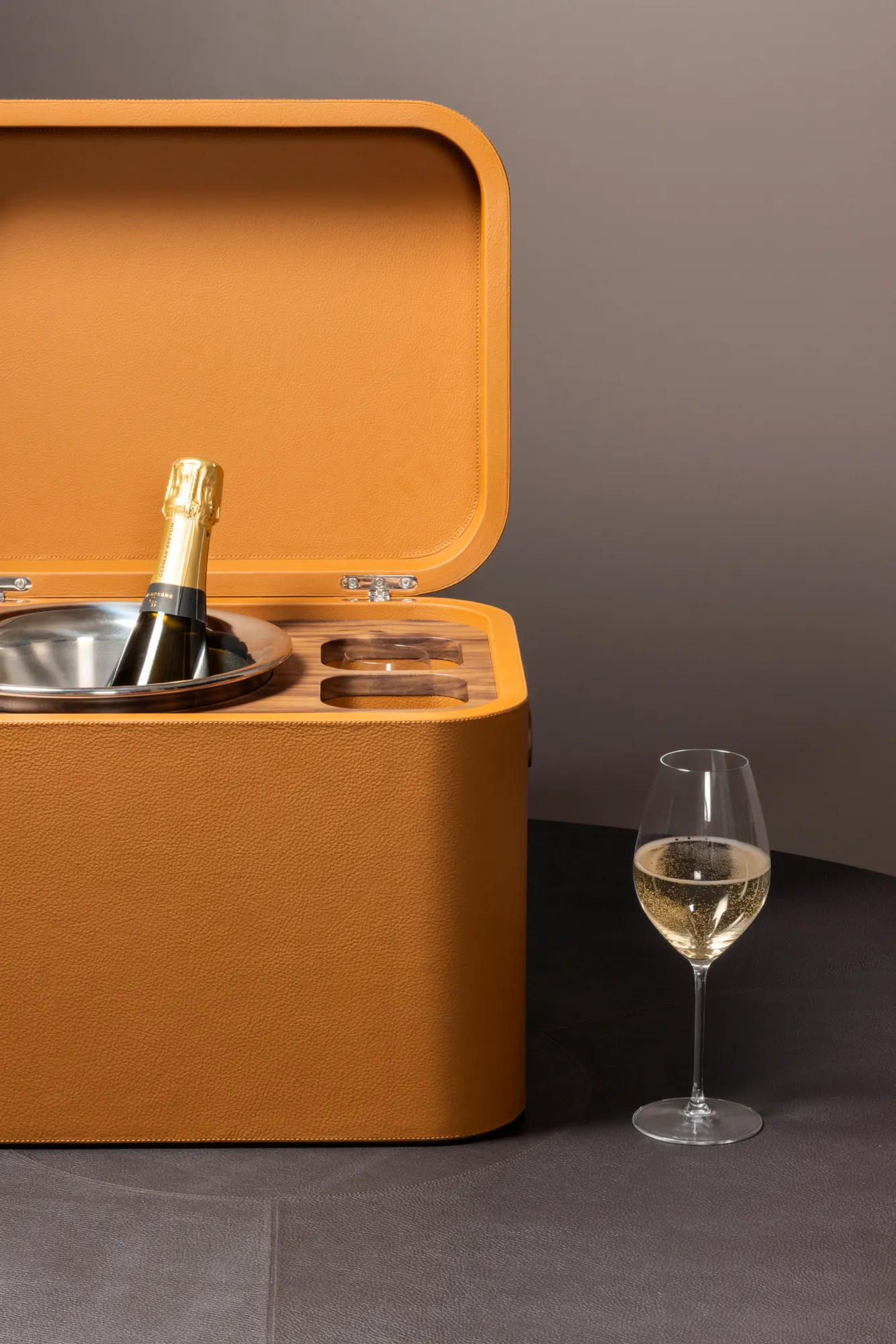 Leather-covered structure featuring a hinged lid and walnut wood inlay and details. The set includes two master glasses and a champagne bucket with an insulated double-chamber polished steel structure and rich leather detailing. Entirely made in Pelle Frau®.