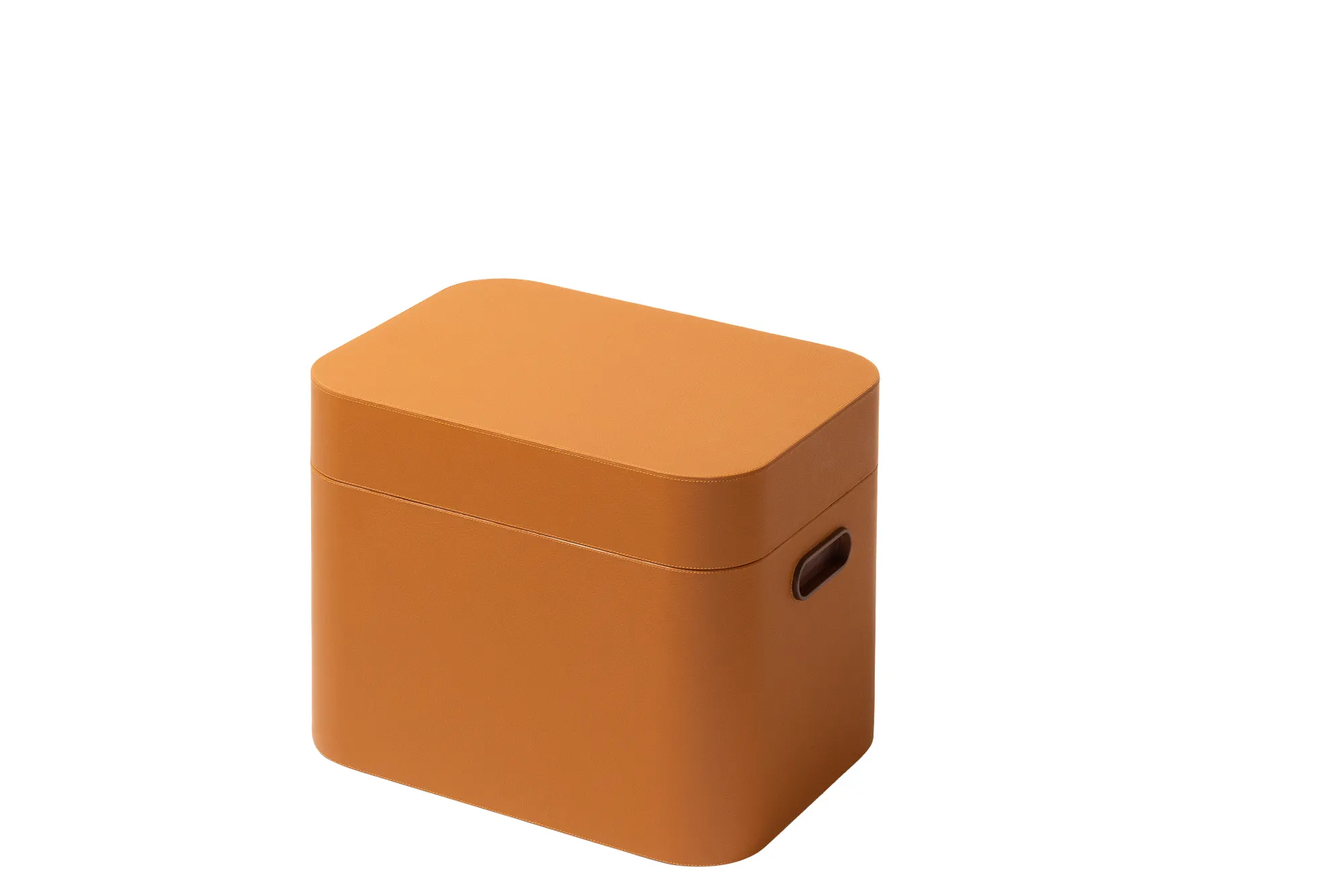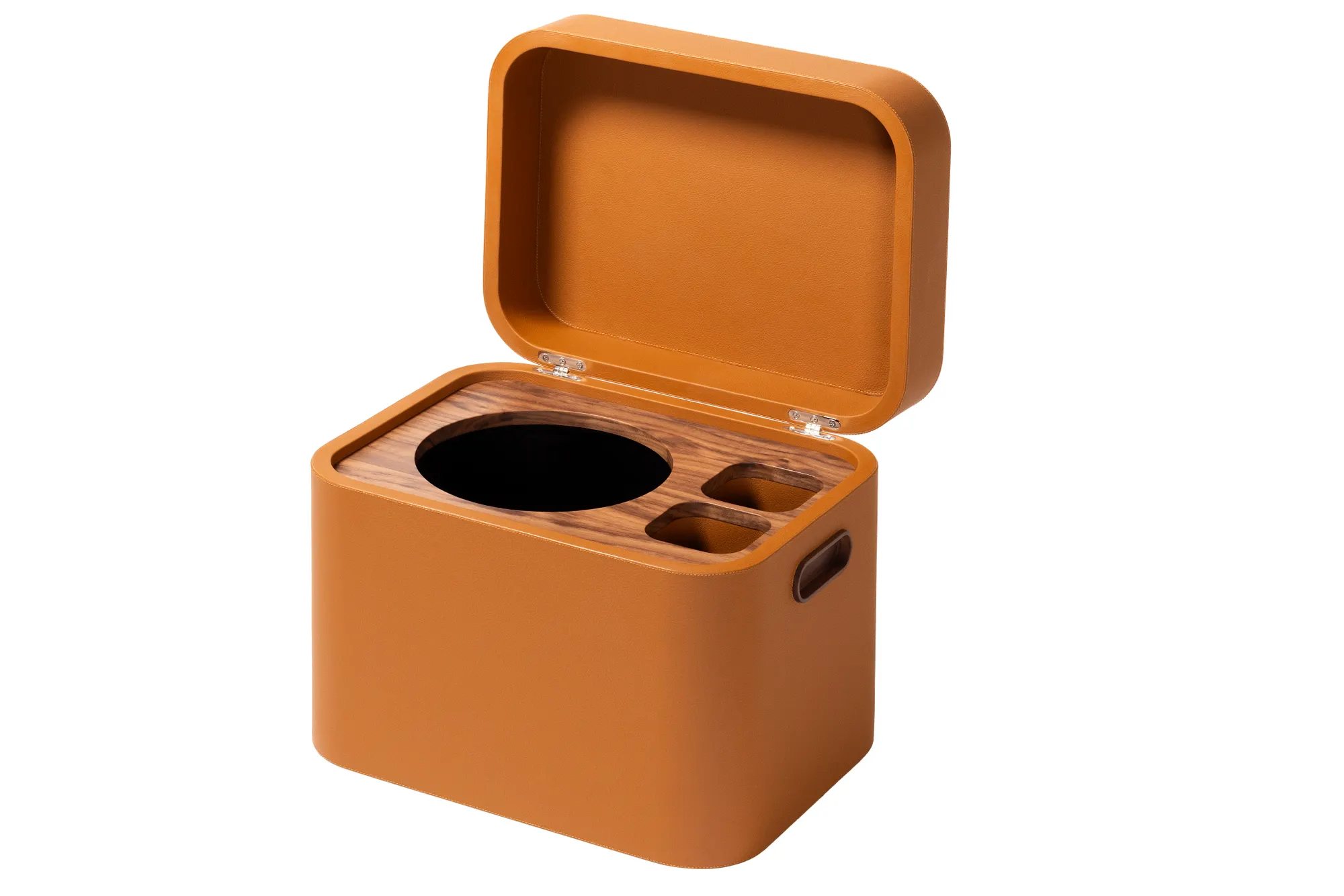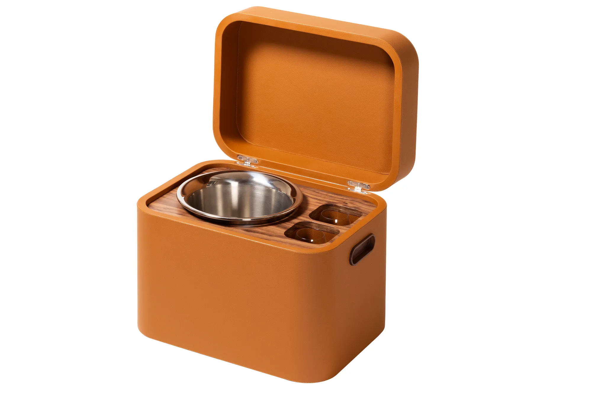 Leather-covered structure featuring a hinged lid and walnut wood inlay and details. The set includes two master glasses and a champagne bucket with an insulated double-chamber polished steel structure and rich leather detailing. Entirely made in Pelle Frau®.