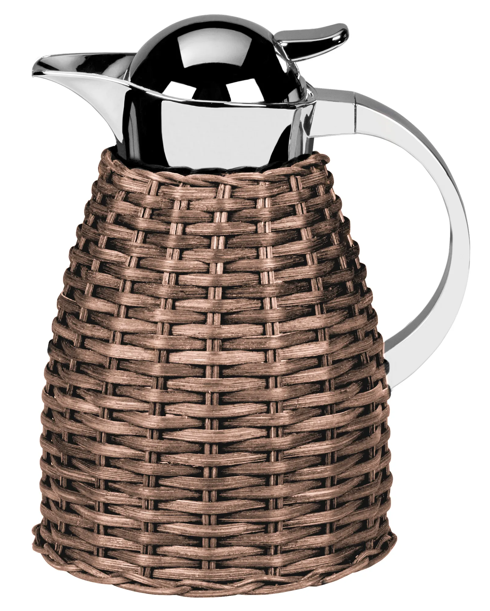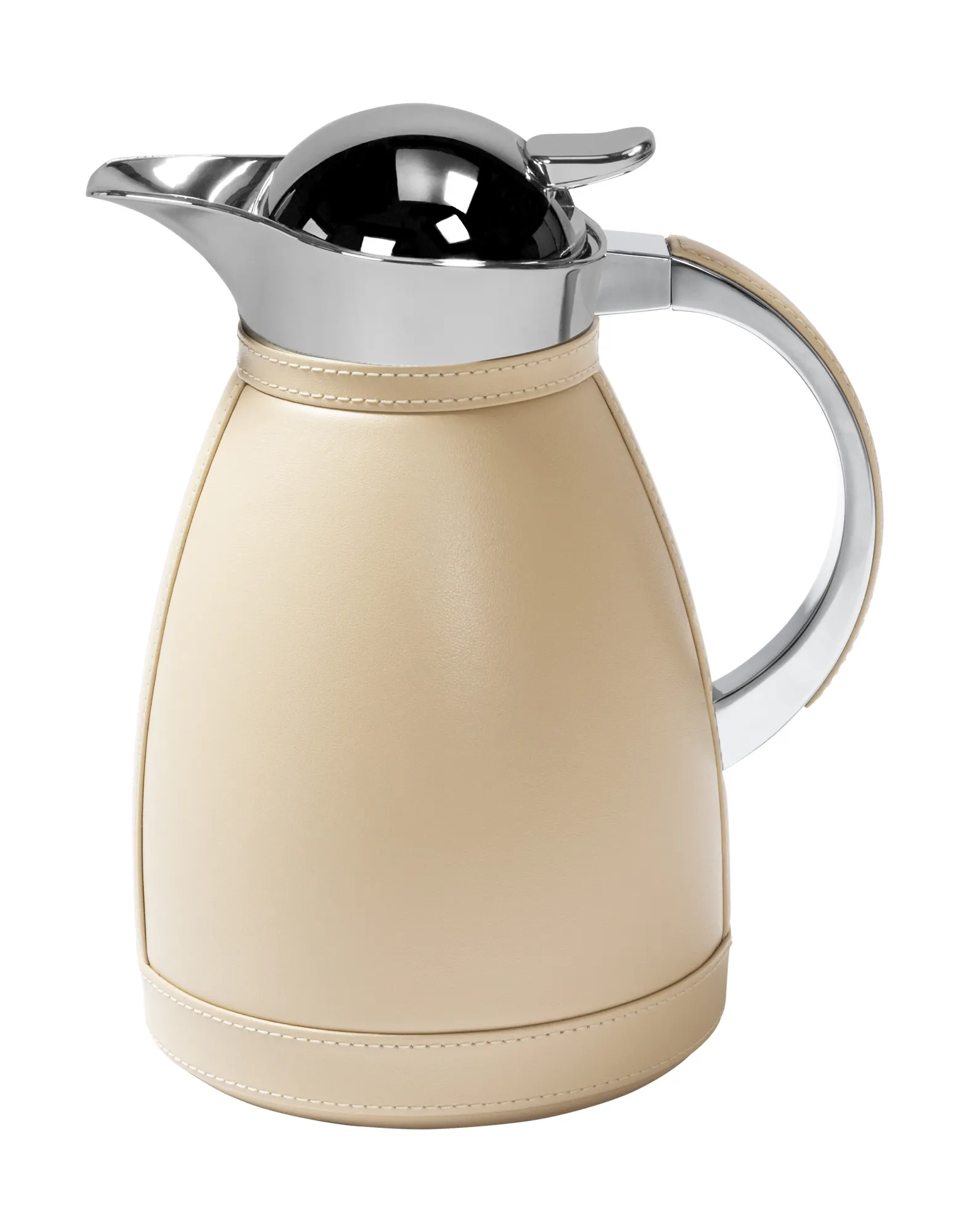 Partially leather covered insulated stainless steel carafes with chrome-plated finish. Two-chamber stainless steel structure able to maintain the liquids warm temperatures for up to 12 hours and cold temperatures for up to 24 hours. Precise pouring thanks to the specially developed lid with one-hand operation.