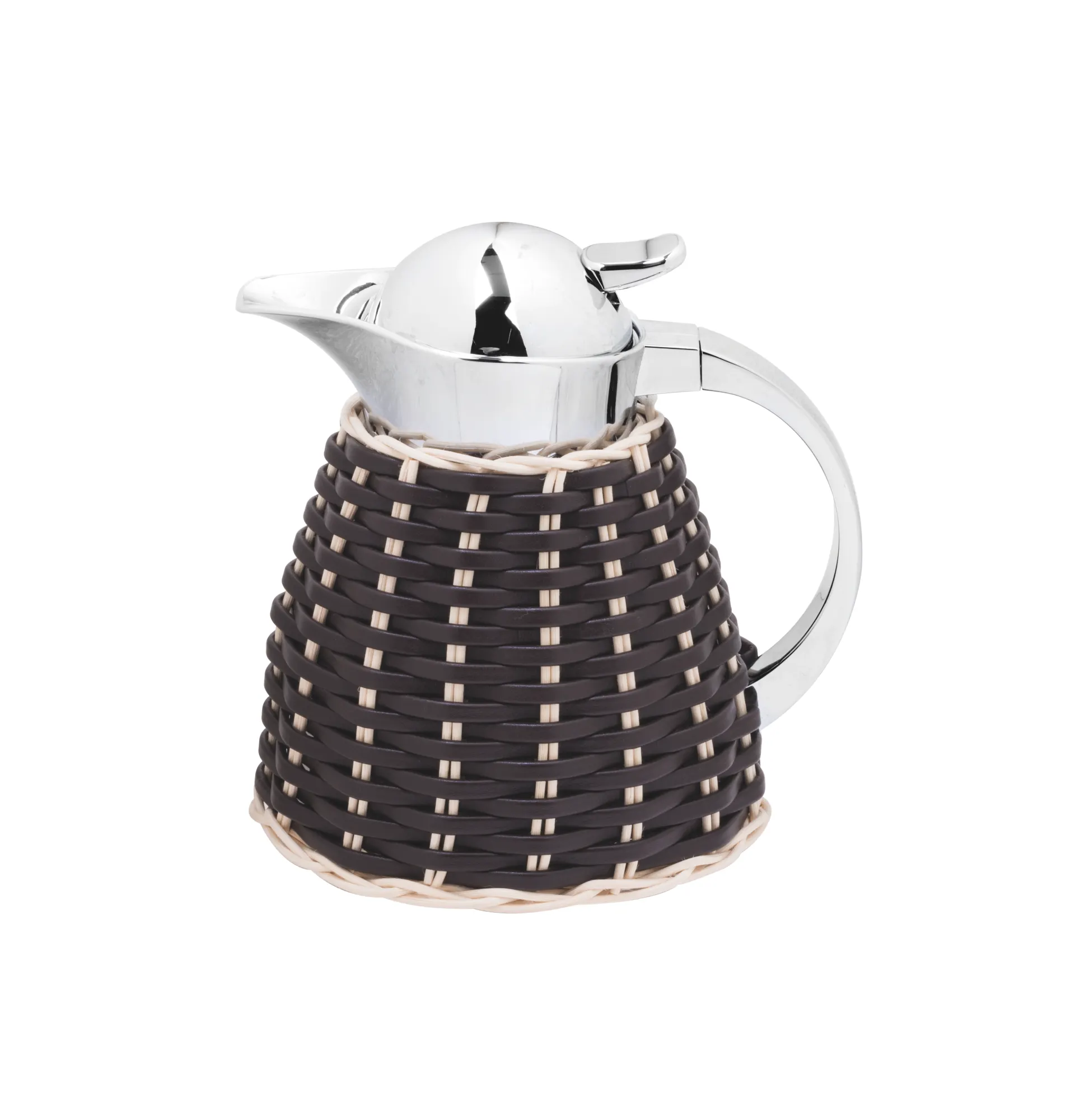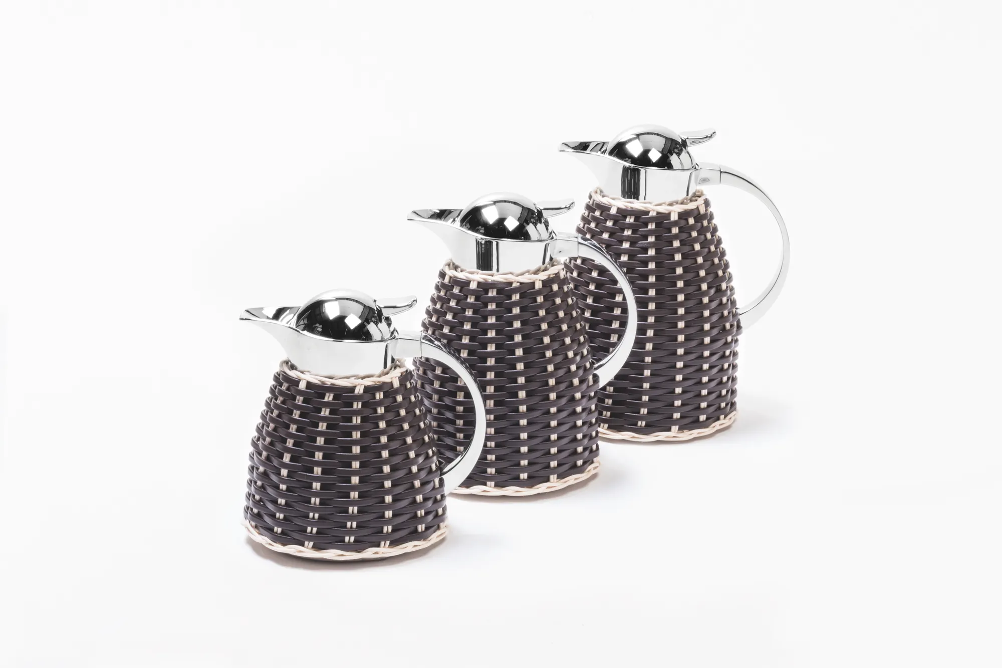 Insulated stainless steel carafes partially covered in woven leather and rattan with chrome-plated finish. Two-chamber stainless steel structure able to maintain the liquids warm temperatures for up to 12 hours and cold temperatures for up to 24 hours. Precise pouring thanks to the specially developed lid with one-hand operation.