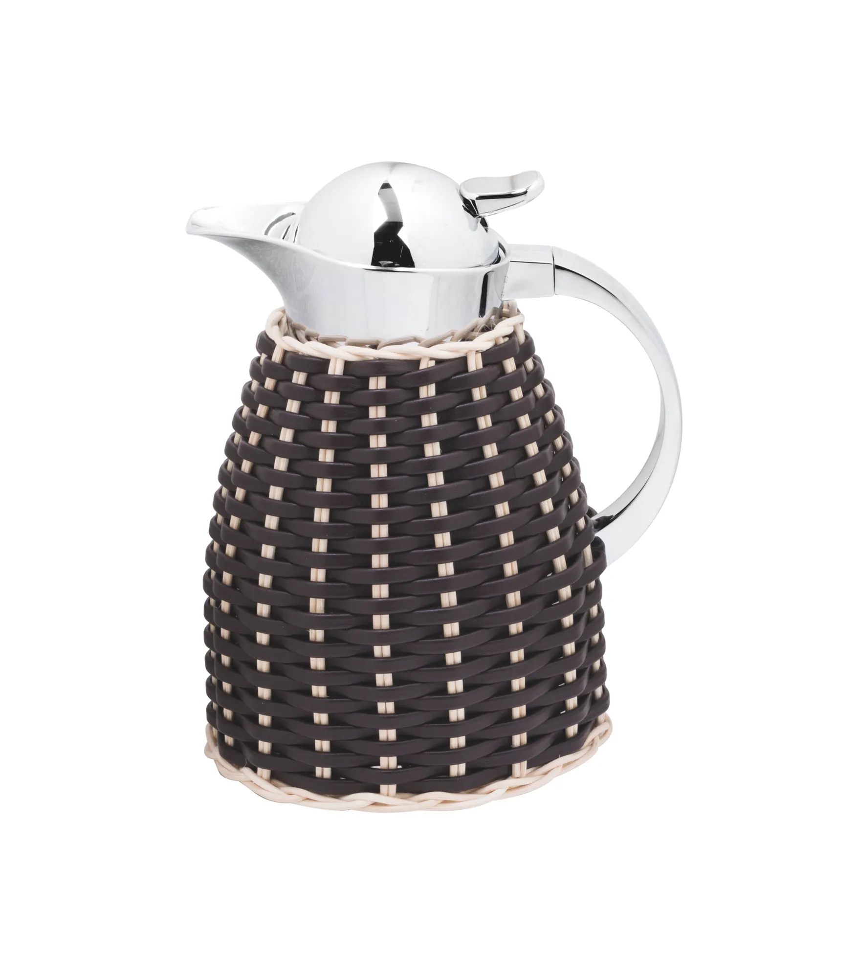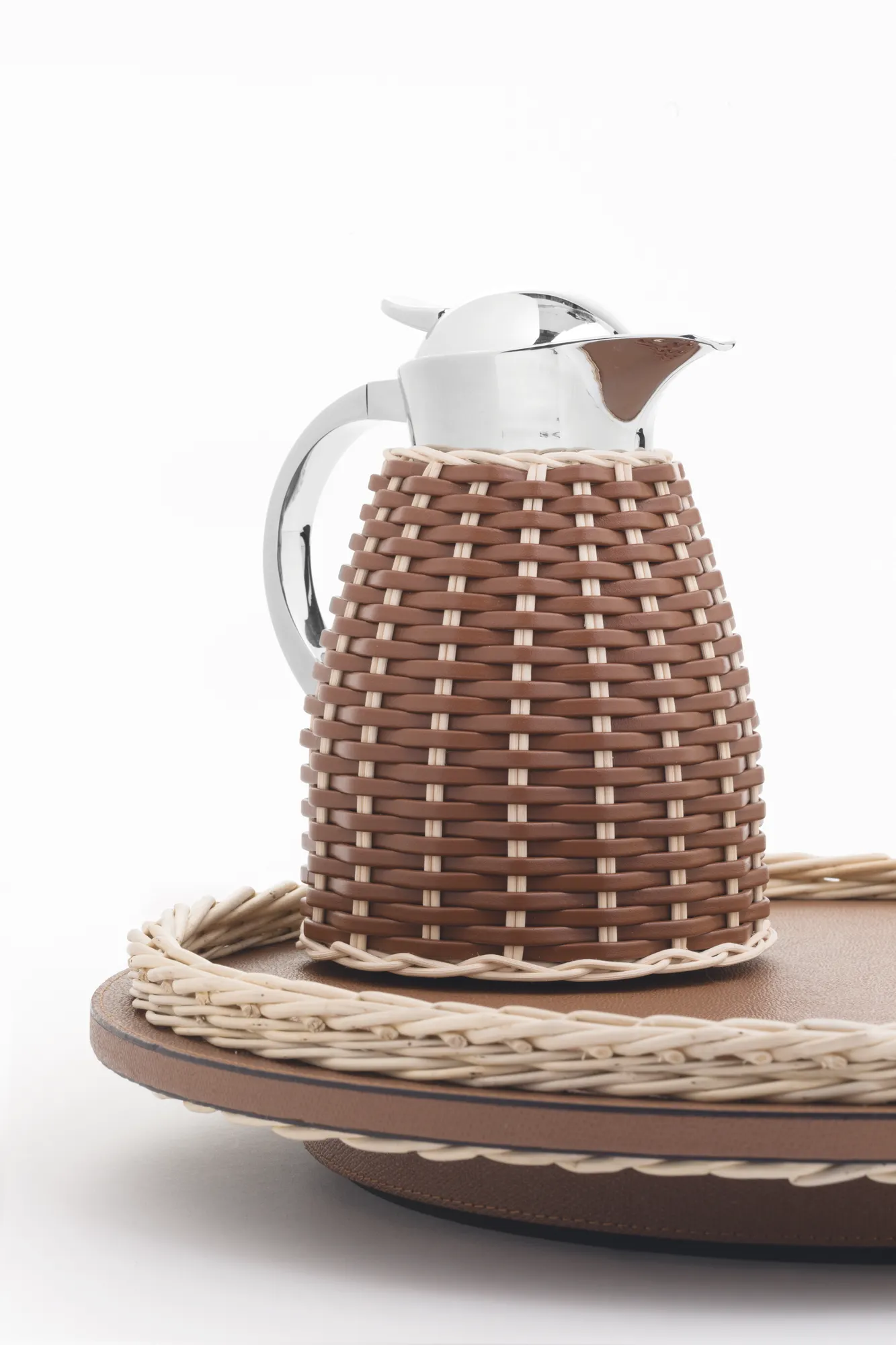 Insulated stainless steel carafes partially covered in woven leather and rattan with chrome-plated finish. Two-chamber stainless steel structure able to maintain the liquid’s warm temperatures for up to 12 hours and cold temperatures for up to 24 hours. Precise pouring thanks to the specially developed lid with one-hand operation.