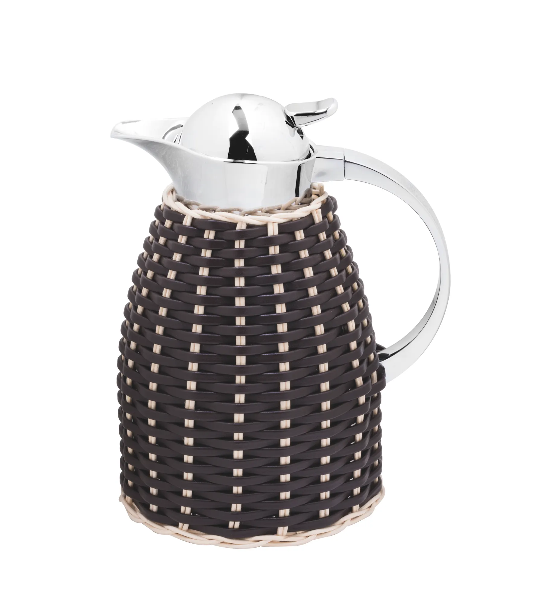 Insulated stainless steel carafes partially covered in woven leather and rattan with chrome-plated finish. Two-chamber stainless steel structure able to maintain the liquid’s warm temperatures for up to 12 hours and cold temperatures for up to 24 hours. Precise pouring thanks to the specially developed lid with one-hand operation.
