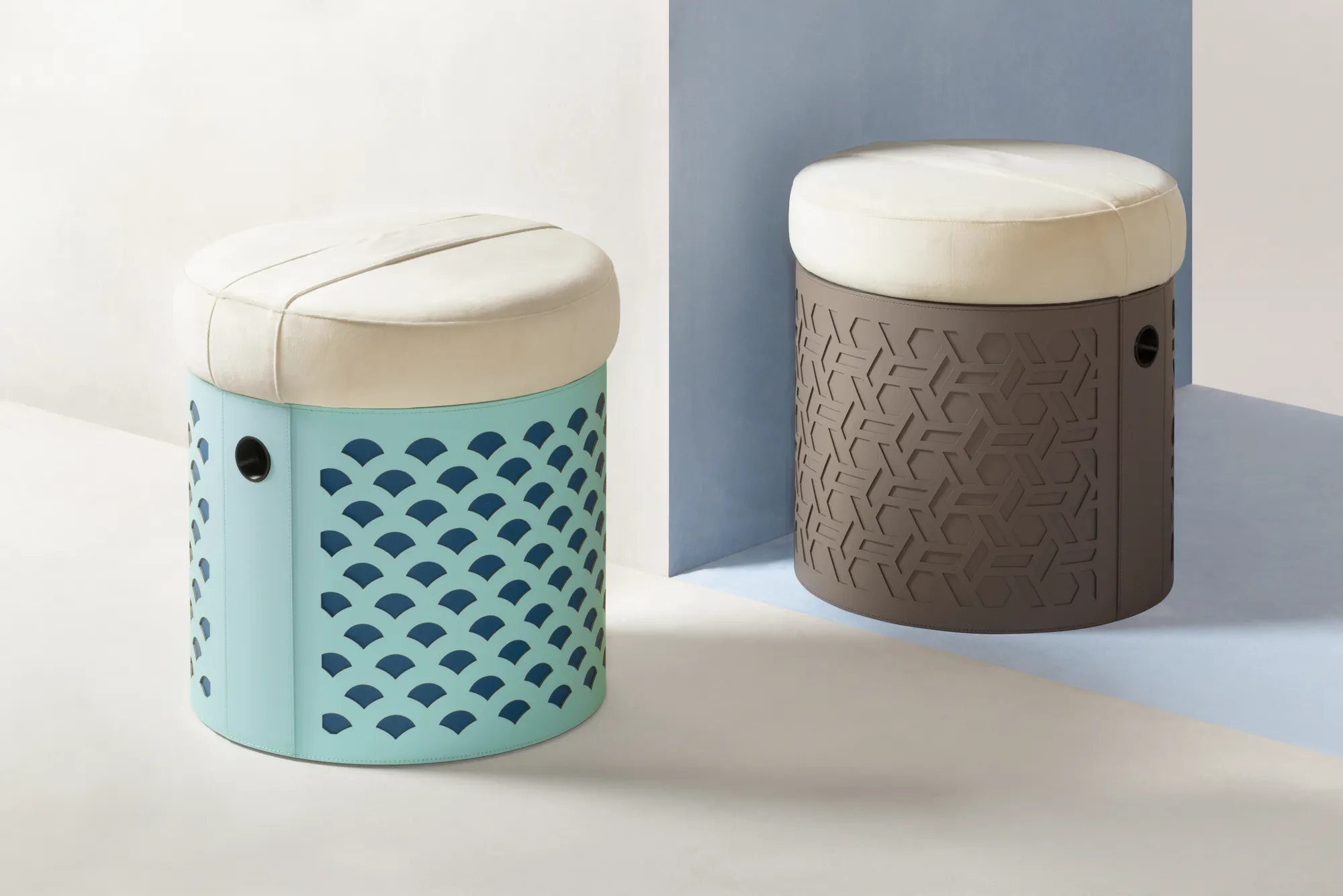 Wood structure featuring a finest regenerated reinforced leather cover with water-resistant and UV-resistant finish. Provided with coated metal feet and an upholstered fabric cushion on top. Available with a smooth surface or with a pattern of choice among Vienna, Venezia, Sugar, Promenade. Design by Simone Fanciullacci.