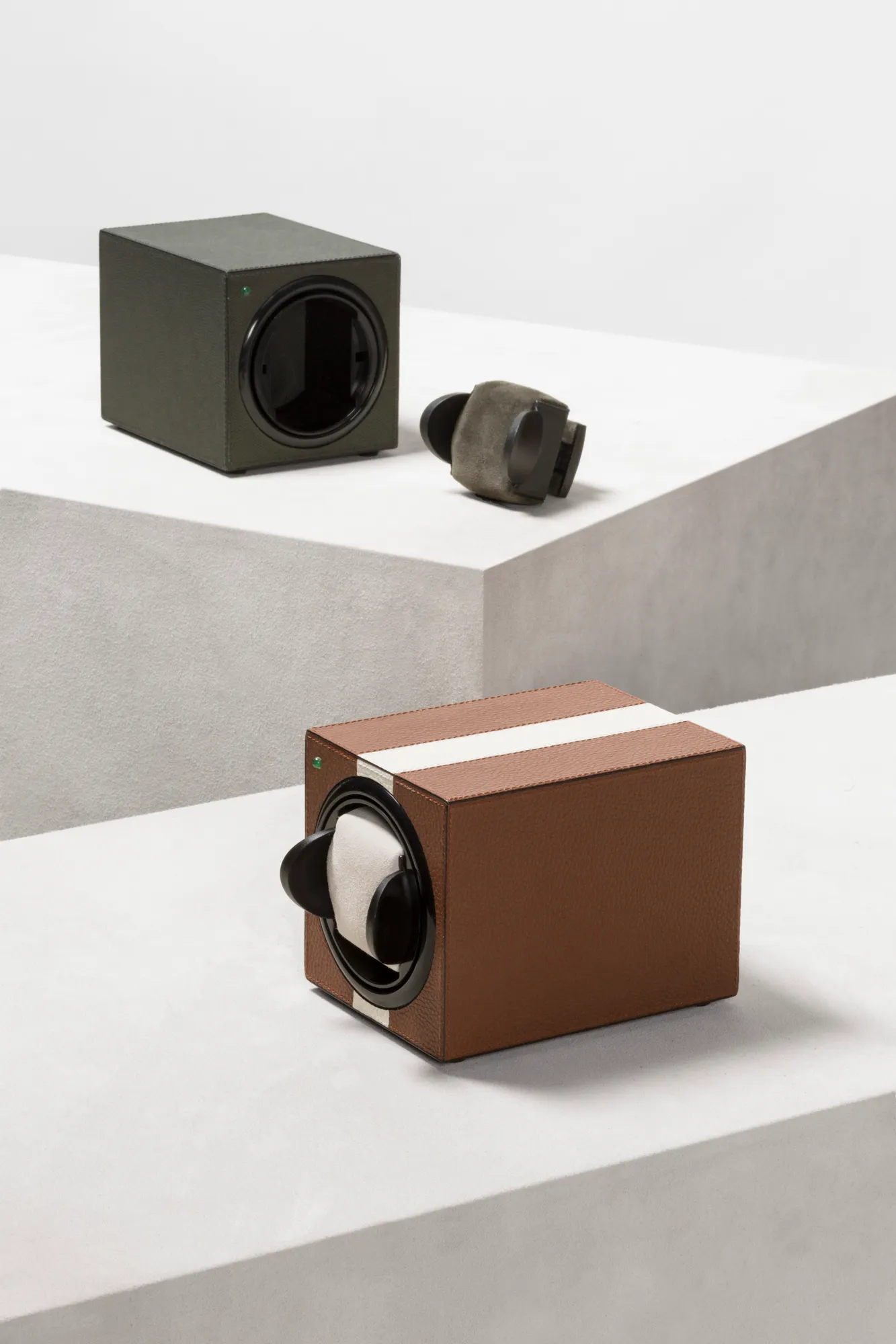 Leather-covered structure. It is sufficient to apply a slight pressure to detach the rotating part, which is provided with a watch strap extender. It works with 2 AA batteries. Multiple rotation settings: clockwise, counterclockwise or alternating. Chronos operates on a basis of gentle rotation, ensuring a consistent movement over a longer period of time that won't over-wind one's watch.