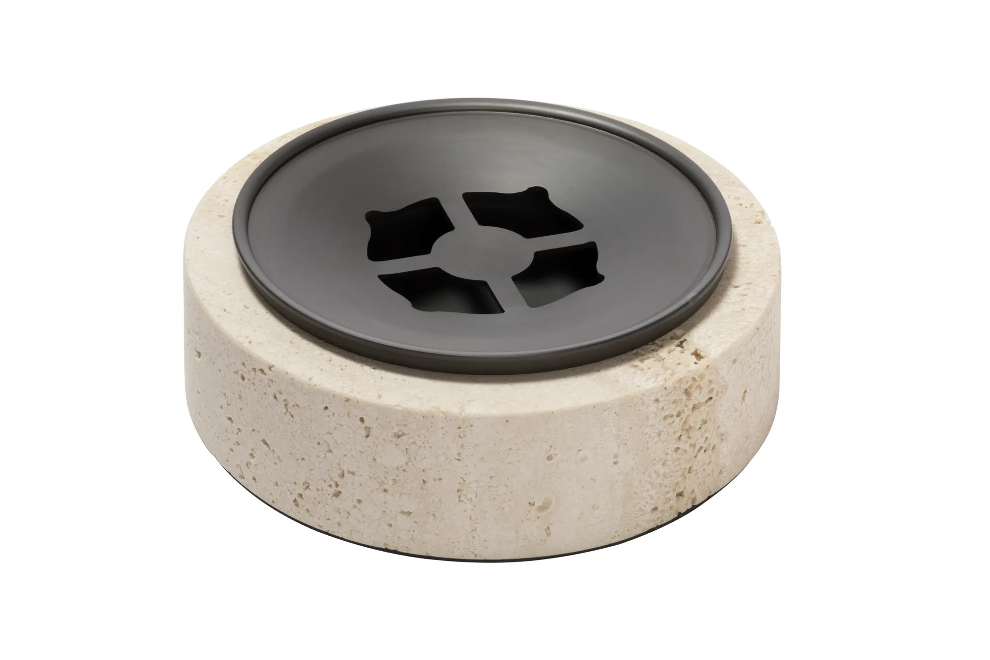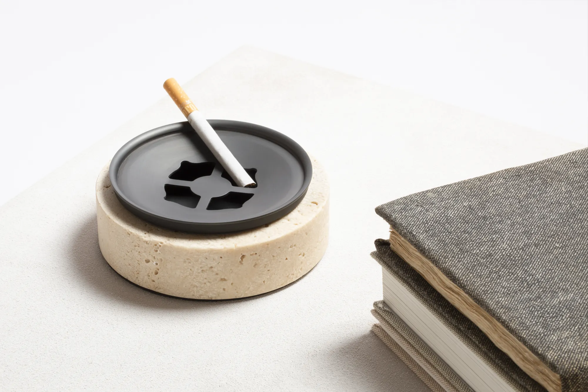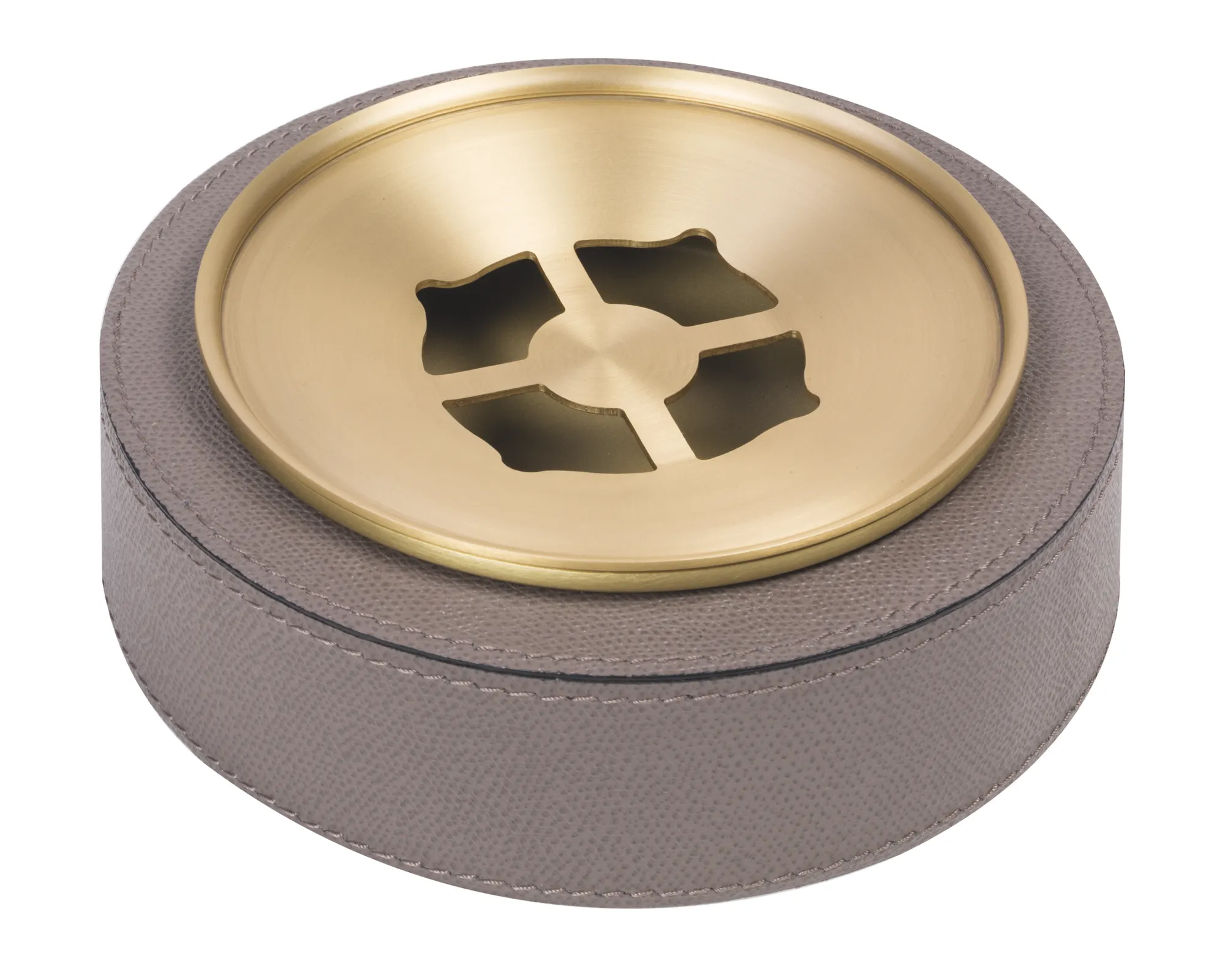Leather covered wood structure. Removable brass ashtray available in three finishes.