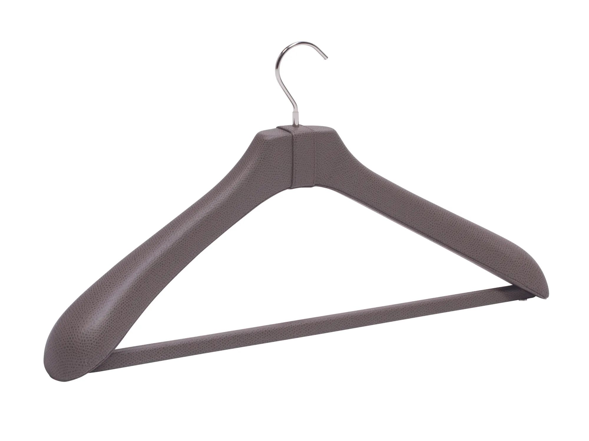 Leather covered wood structure. Suit hanger that provides optimum shoulder support. Also available provided with trousers holder on request. No 'clanking'. Perfect for airplanes and yachts.