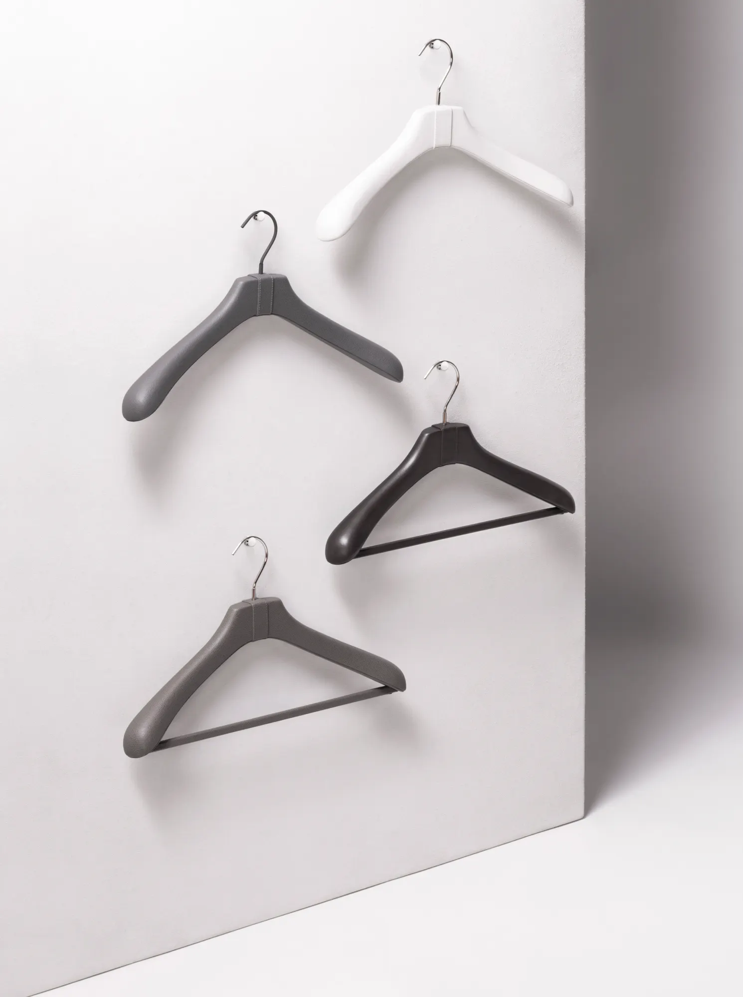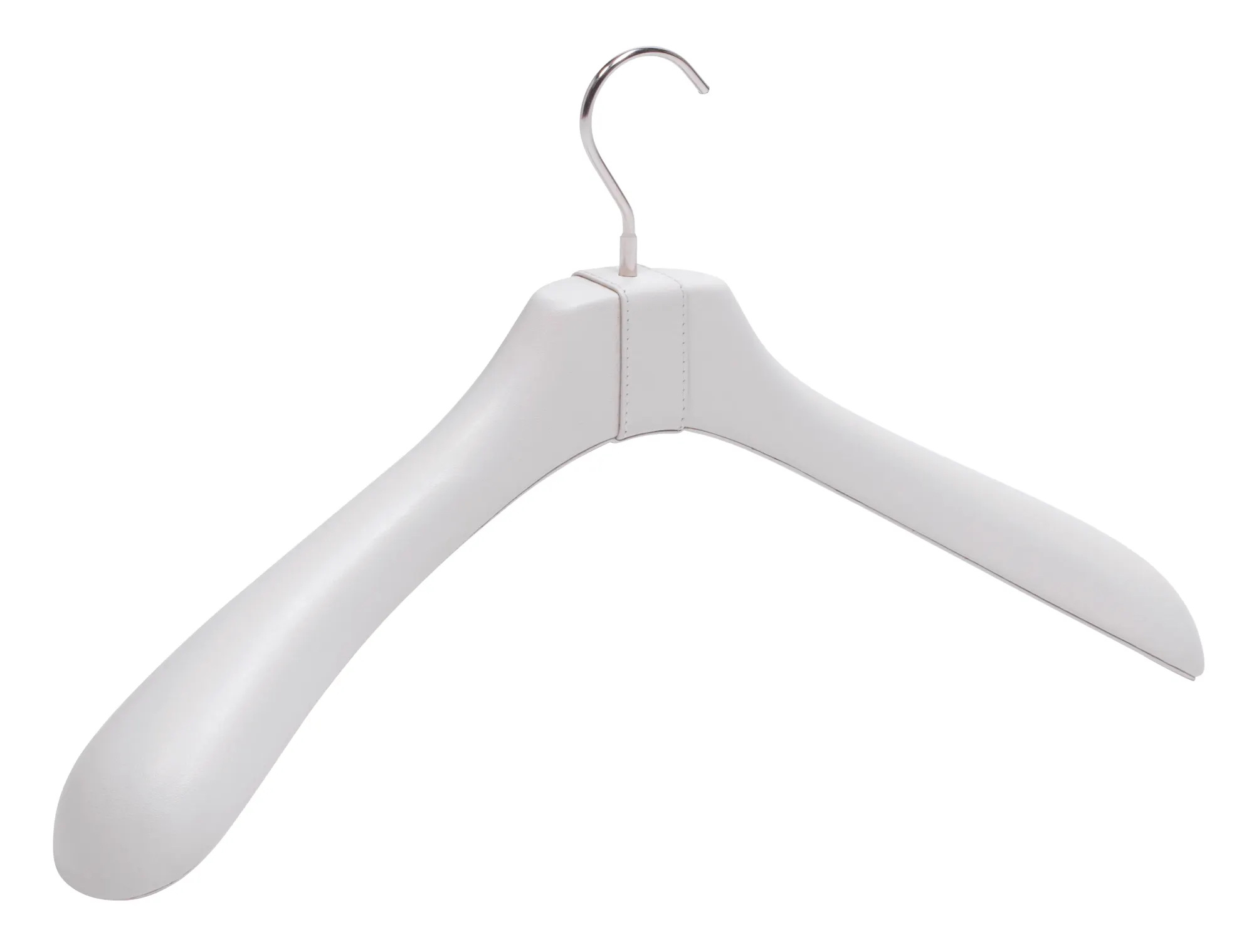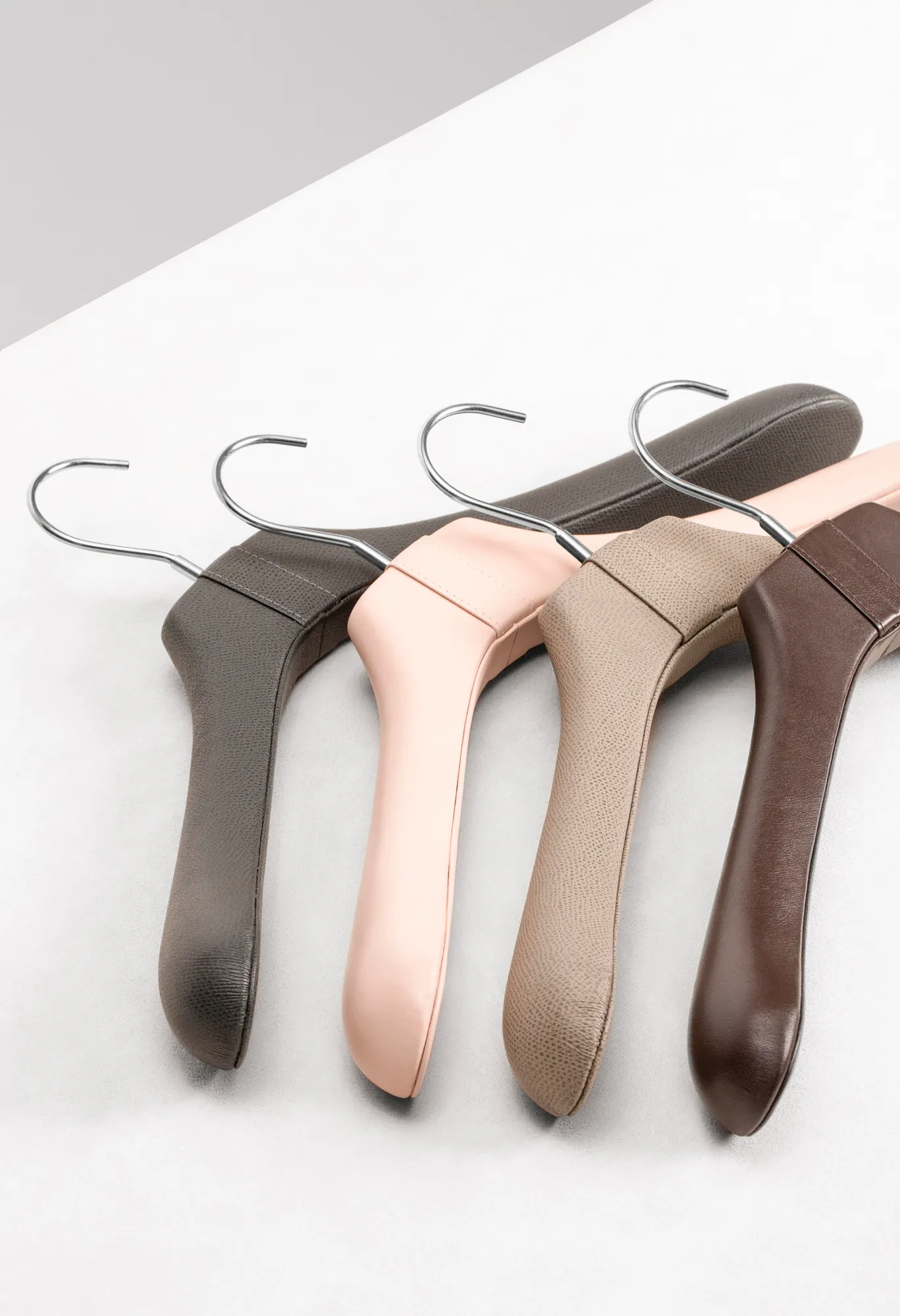 Leather covered wood structure. Suit hanger that provides optimum shoulder support. Also available provided with trousers holder on request. No 'clanking'. Perfect for airplanes and yachts.