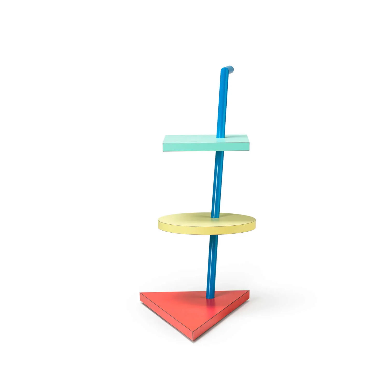 Javier Mariscal designed the Colon table for the very first Memphis collection, dating back to 1981. The apparently unstable interlocks of the geometry and its proportions seem to defy the force of gravity. Three multicolored horizontal planes slip over a tubular post – central, slightly sloping, in sky blue – to generate this eccentric but functional table that never fails to catch the eye. The tops, arranged in a column, link back to pure geometric forms: the square, the circle and the triangle, enhanced by primary colors. Nevertheless, the “functionalist grid” is transformed by an aerodynamic spirit.
