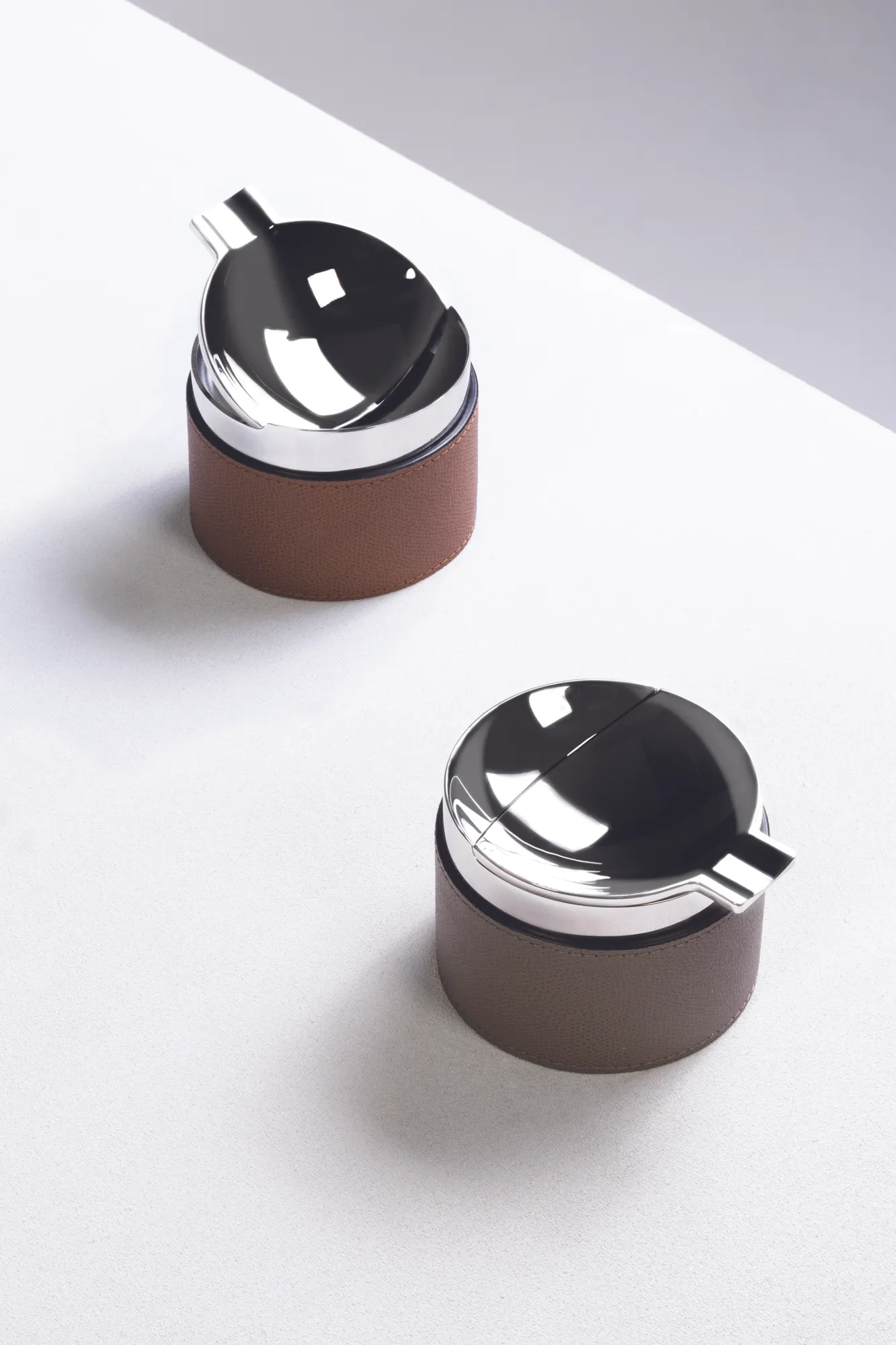 Chrome plated brass structure with leather band. Featuring an easy-to-clean ash basin, this windproof ashtray keeps spaces tidy by enclosing cigarette butts and ashes in a sealed removable chamber, which can be emptied when needed.