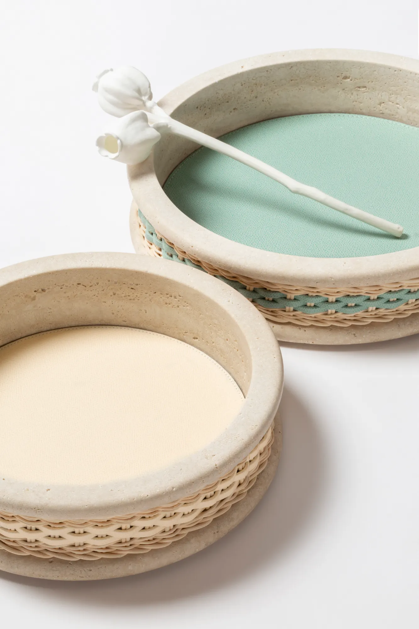 Travertine structure with removable leather inner placemat and outer insert made in handwoven leather and rattan.