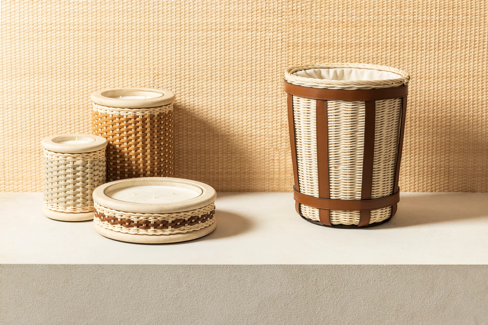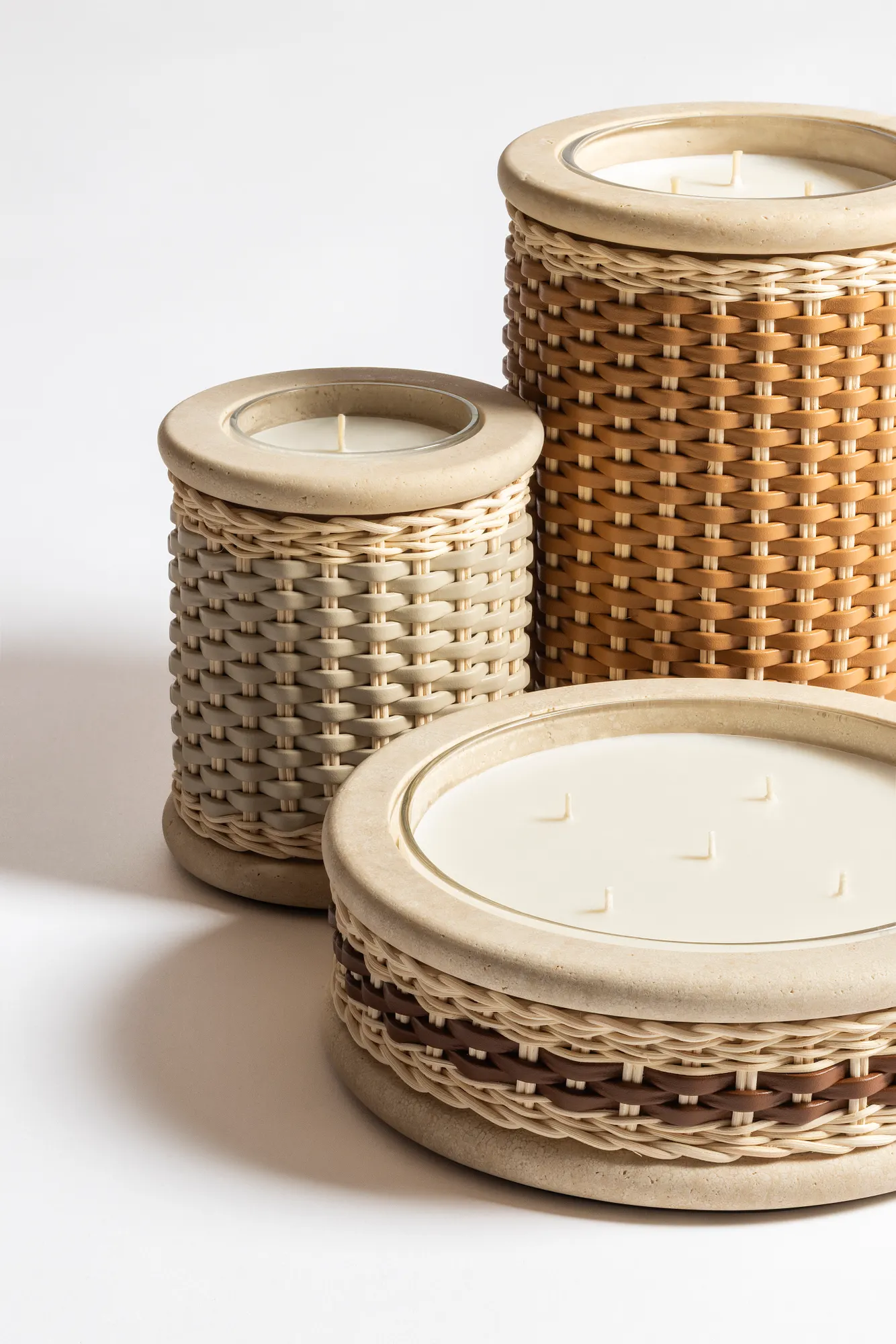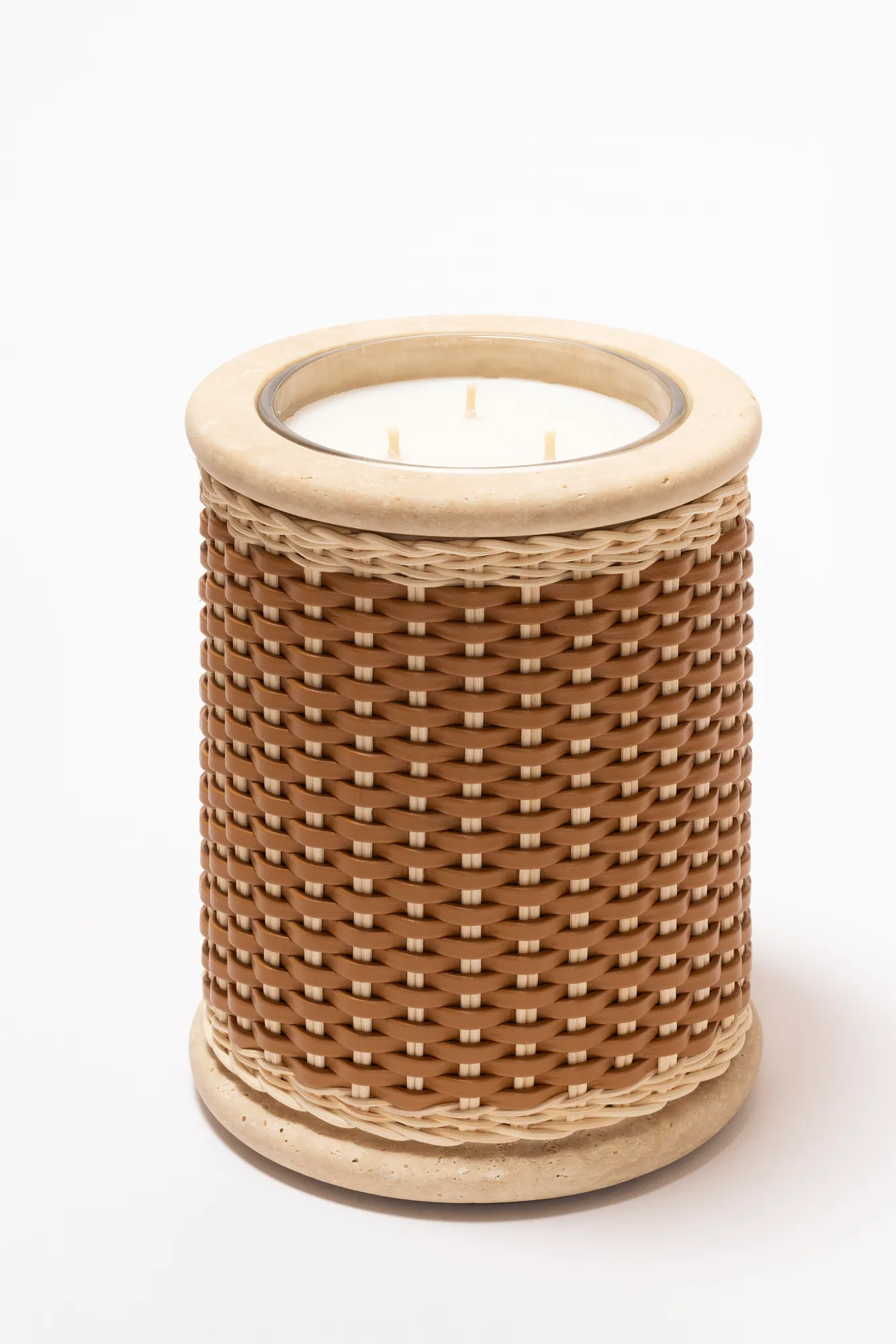 Marble structure partially covered in woven leather and rattan with removable wax candle.