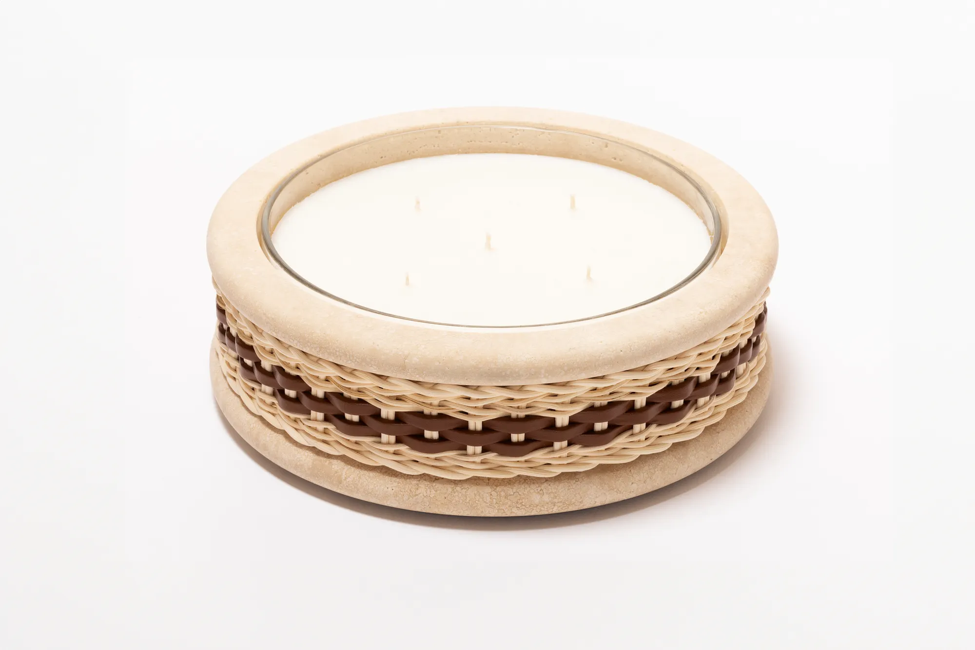 COURBET LEATHER & RATTAN TRAVERTINE CANDLE HOLDER LOW LARGE