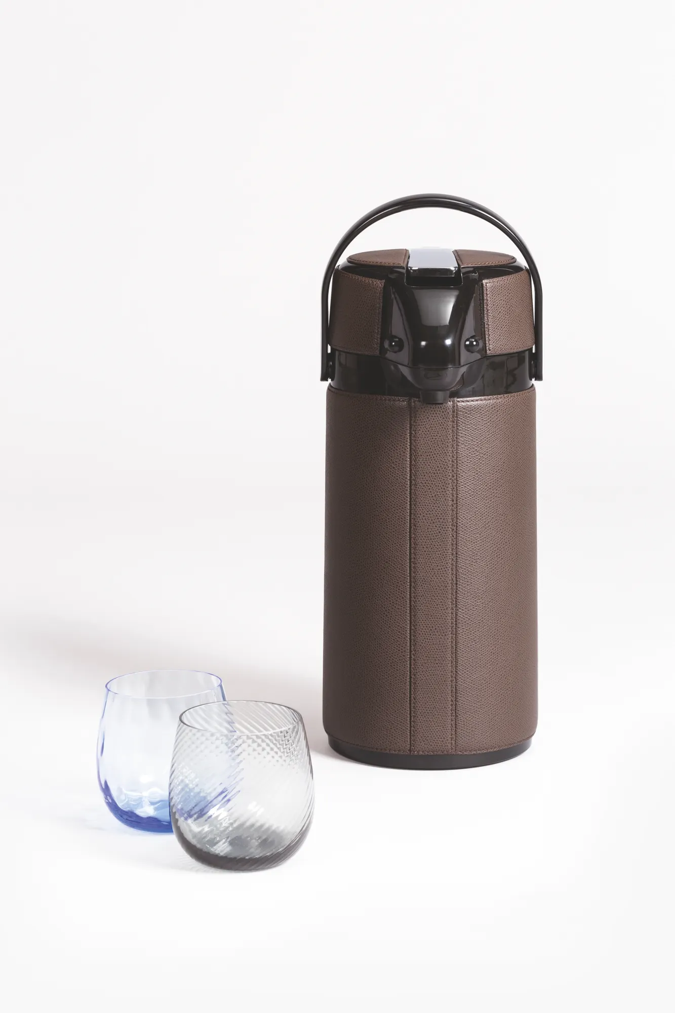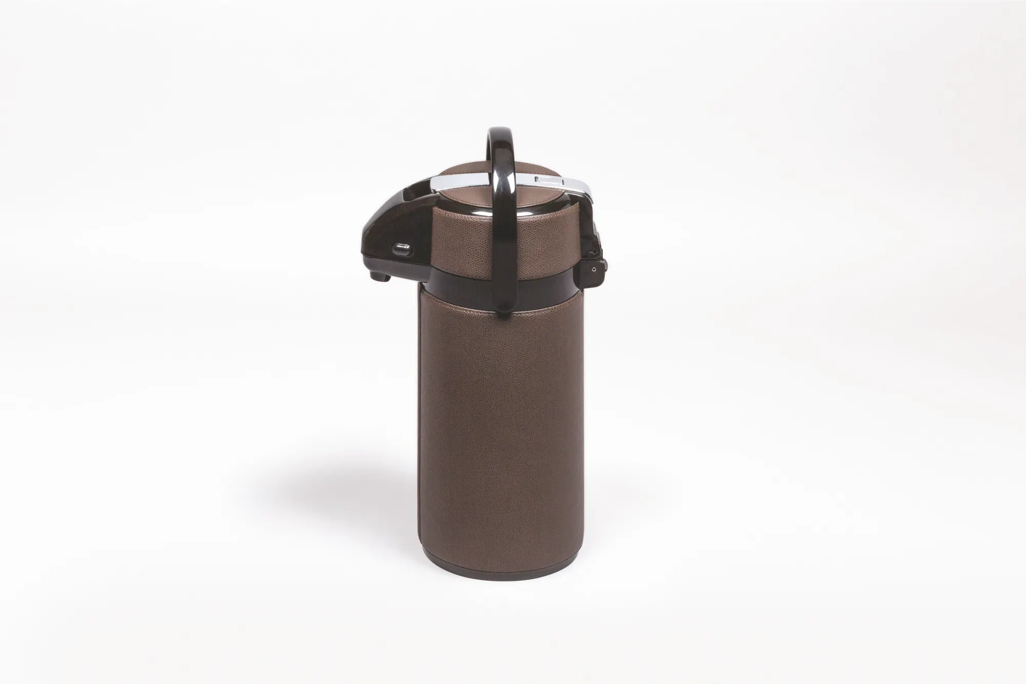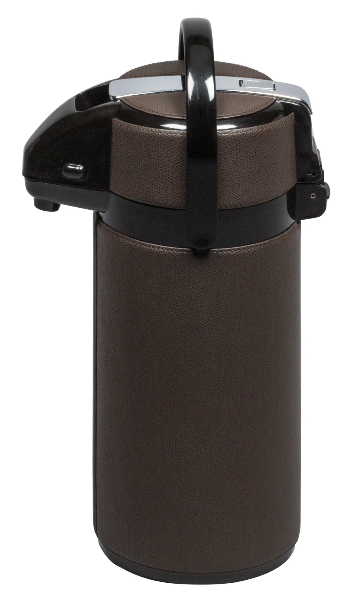 Leather covered insulated stainless steel airpot that features a pour-through stopper and a removable head. Double wall stainless steel liner with vacuum. Head and handle in polished black PP, chrome plated lever and rotating base for multi-directional cup filling. Able to maintain hot or cold beverages' temperature for up to 24 hours.