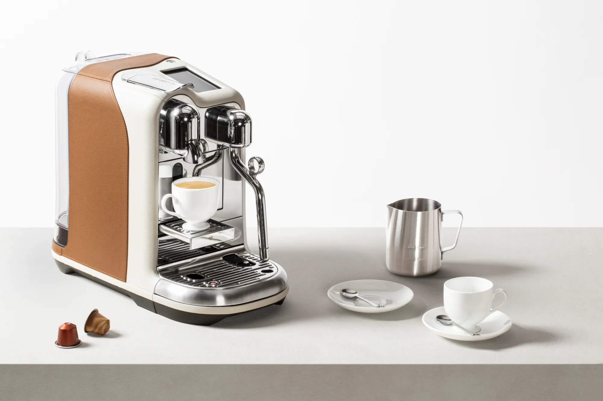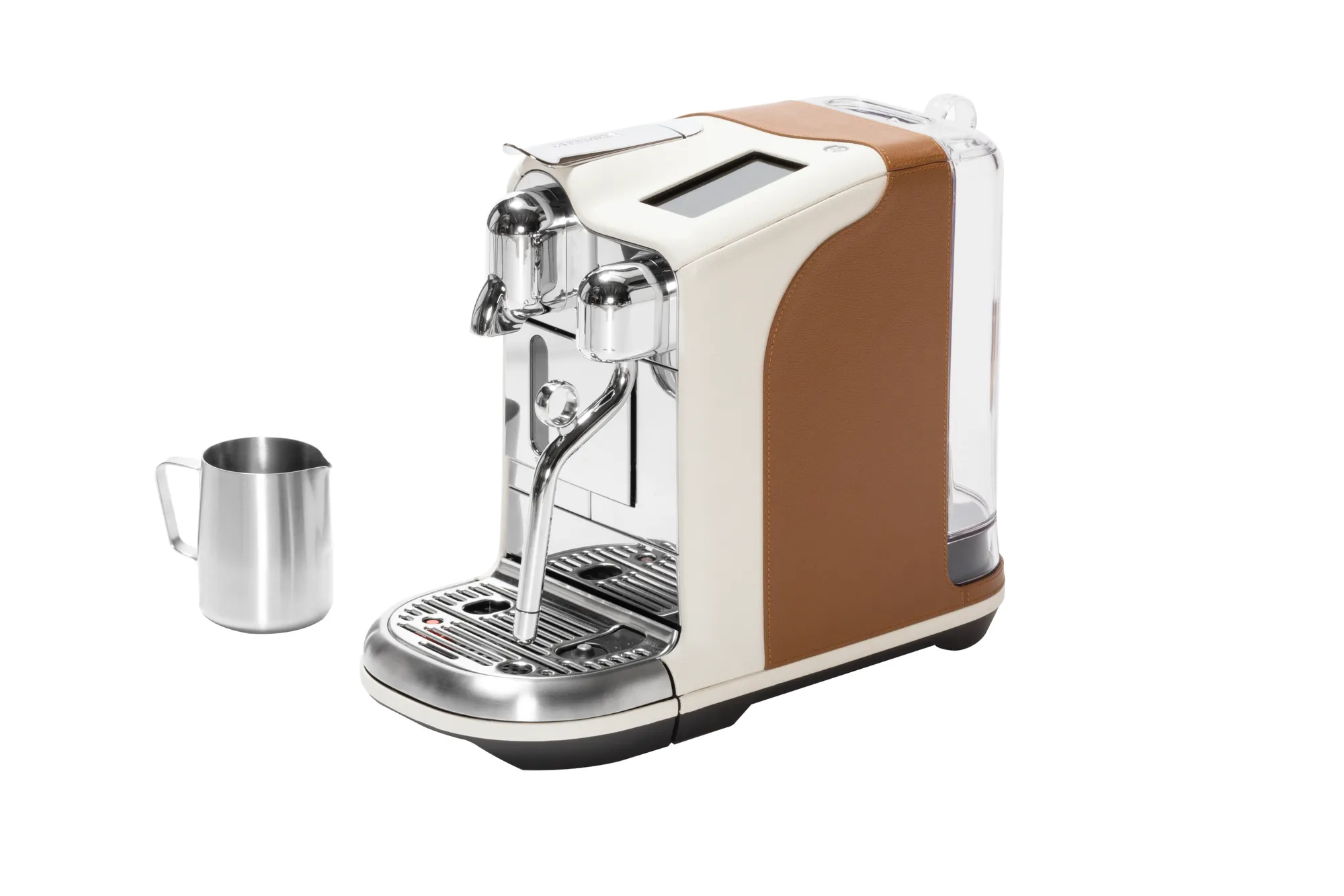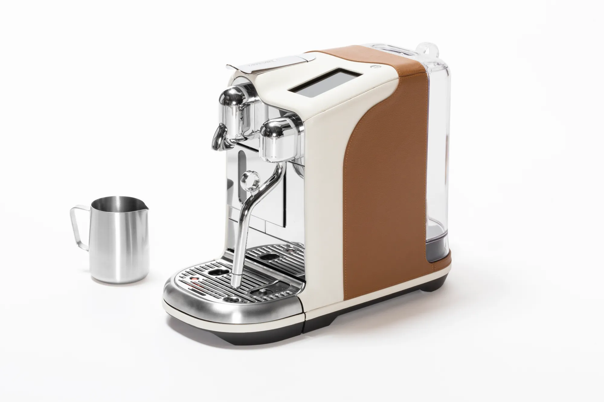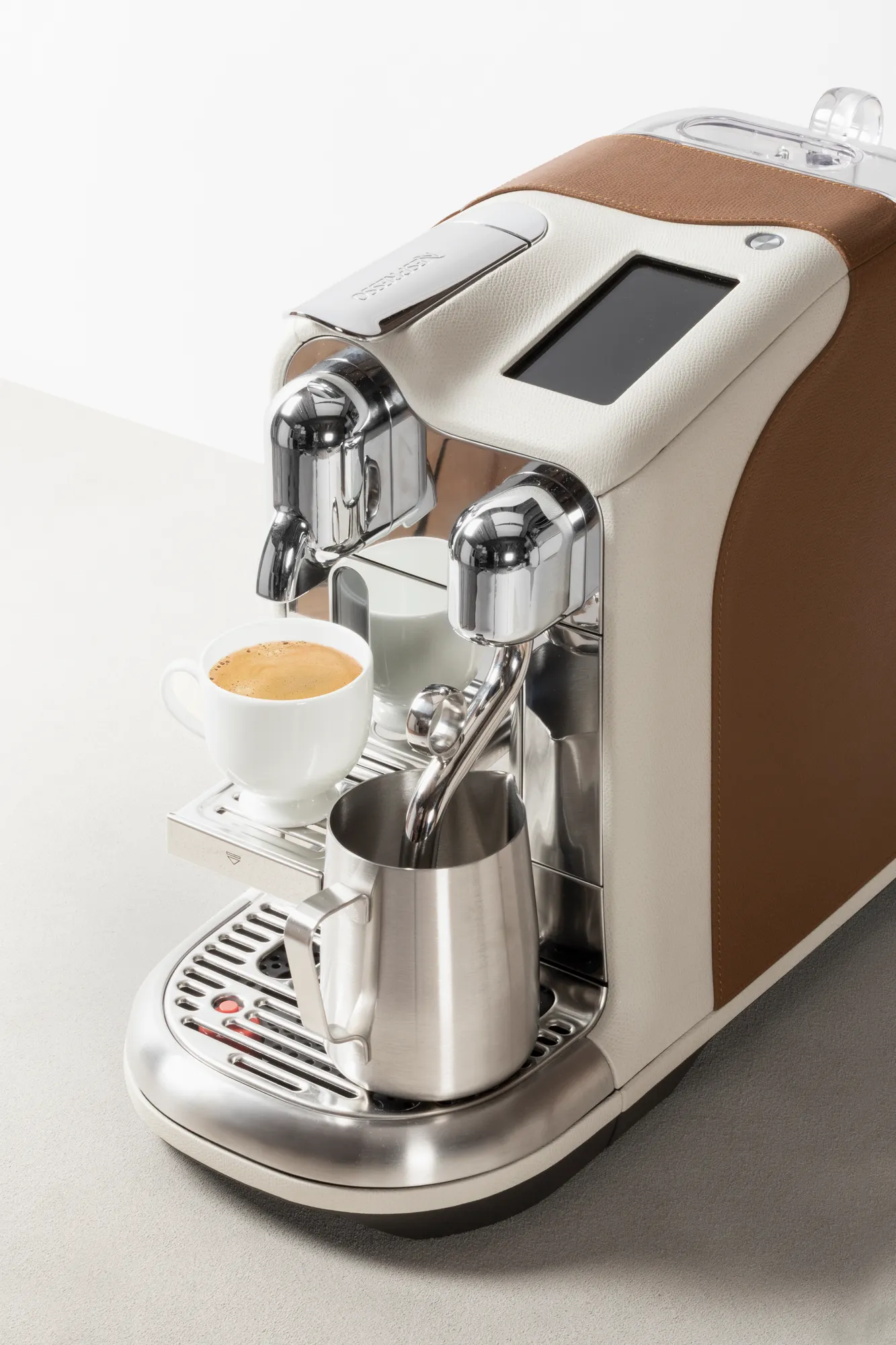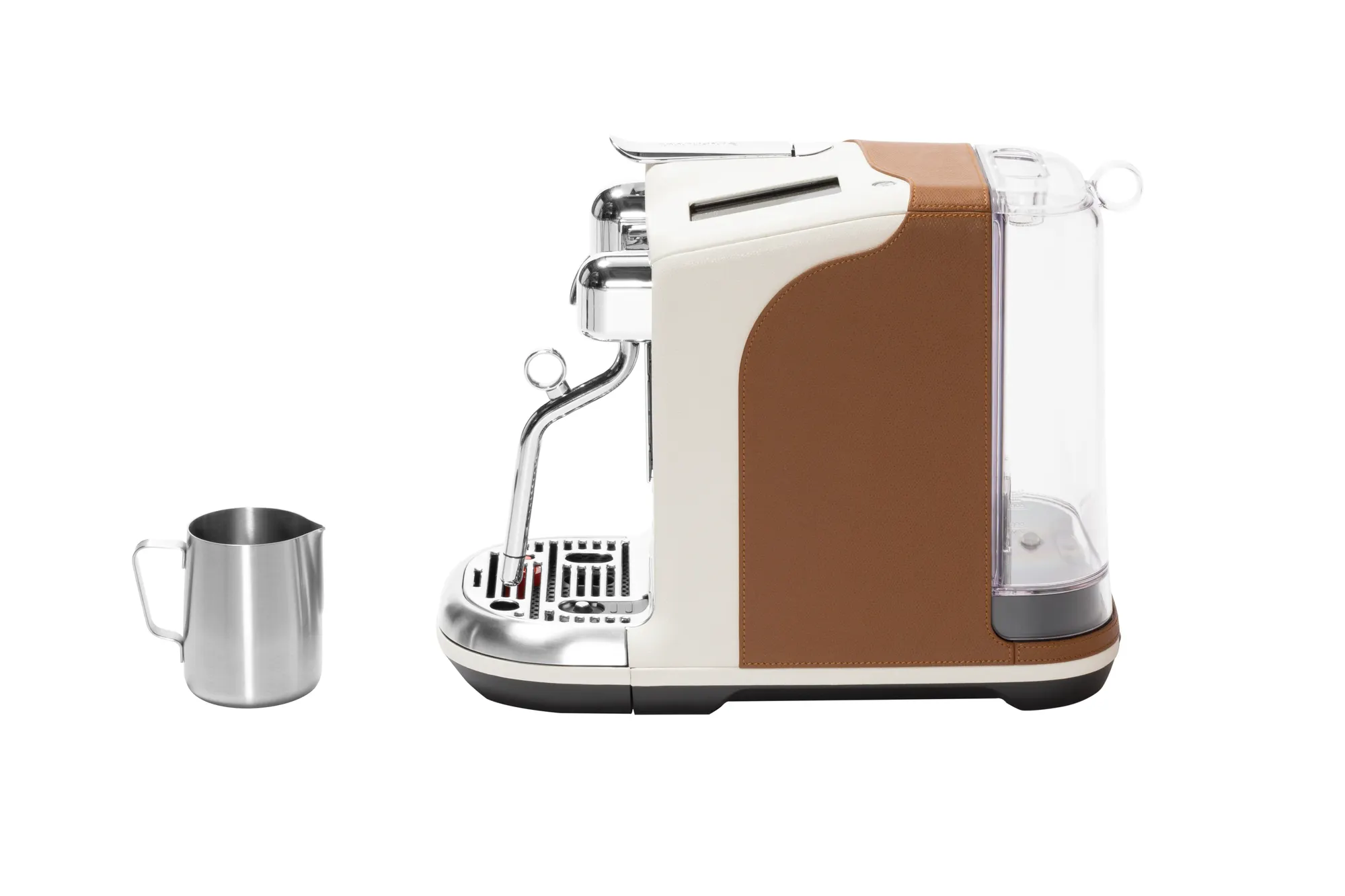 Leather-bound Nespresso machine with a smooth, wavy decorative motif. It uses Nespresso classic capsules and includes the possibility to pour just hot water. It boasts an array of different milk recipes thanks to its built-in milk frother and the interactive touch screen, which allows to customise settings at will to make one's own signature coffee. Personalised drinks can be saved to the drinks menu. It comes with a stainless steel milk jug. It is possible to choose between the monochrome or bicolor version. Voltage available: 220V.