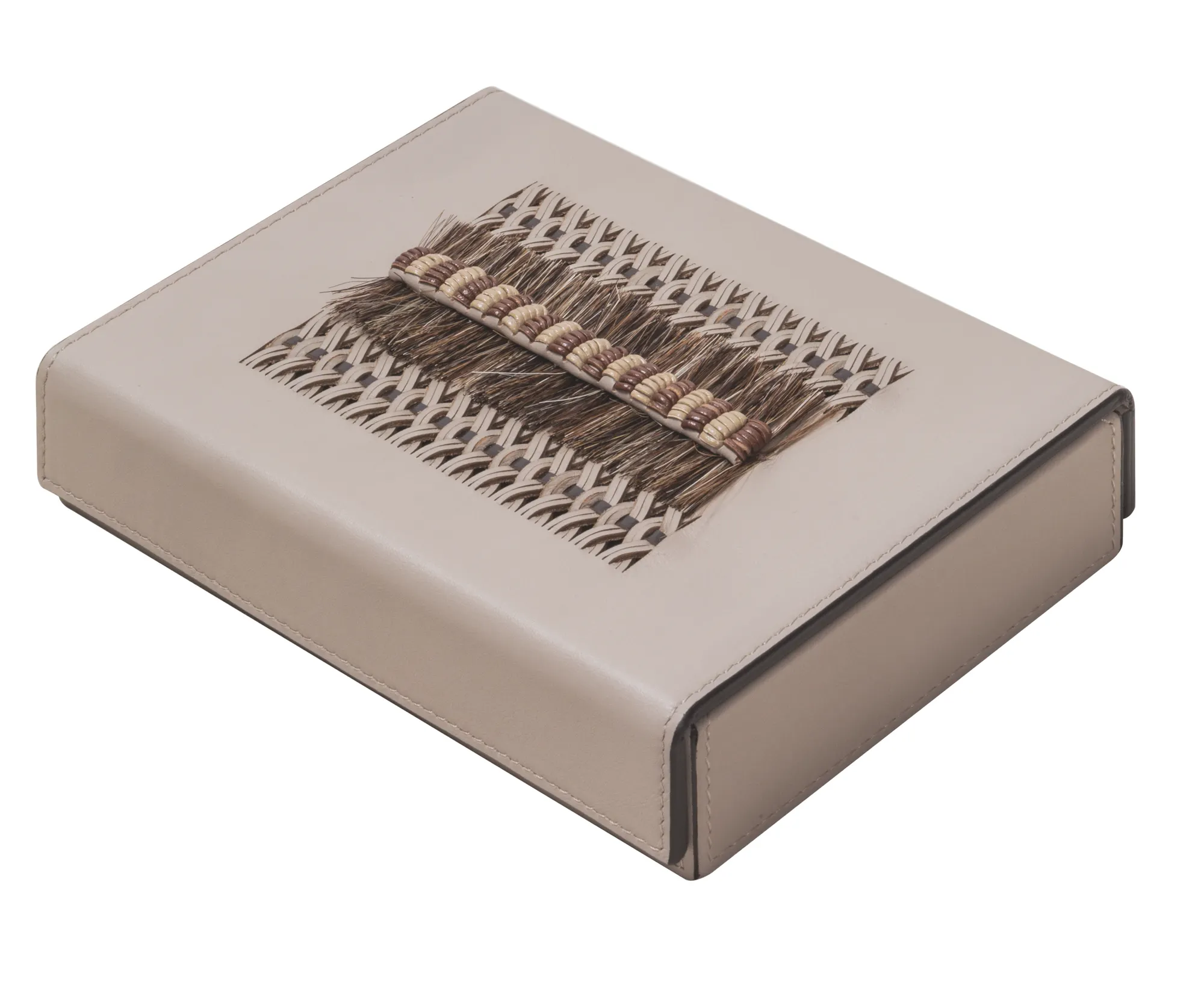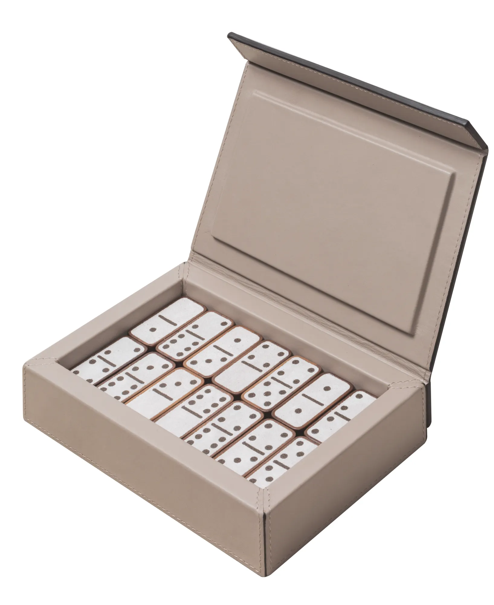 Leather covered wood case with magnetic closing. Includes one set of high quality bakelite dominos. Special decoration made with horsehair and woven. Customizable walnut and leather domino leather.