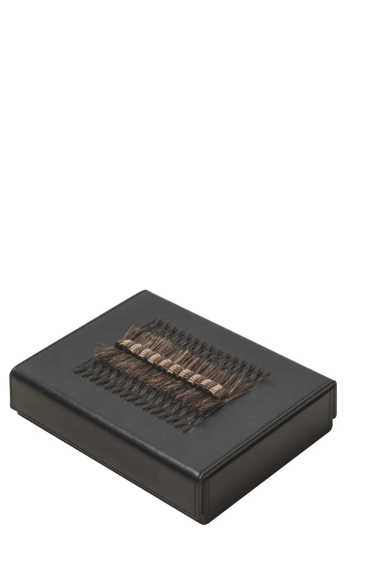 Leather covered wood case with magnetic closing. Special decoration made with horsehair and woven leather. Available only in nappa leather in the following color finishes: black (F20), brown (F09), stone (F83), ivory (F06), off-white (F95), mango orange (F04), siena (F08).