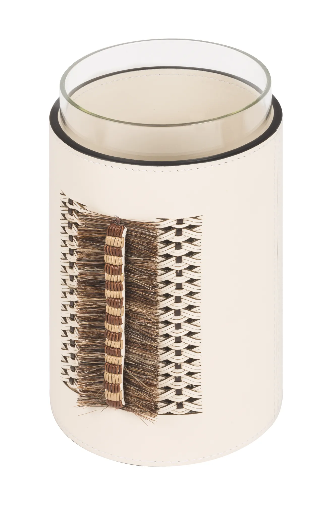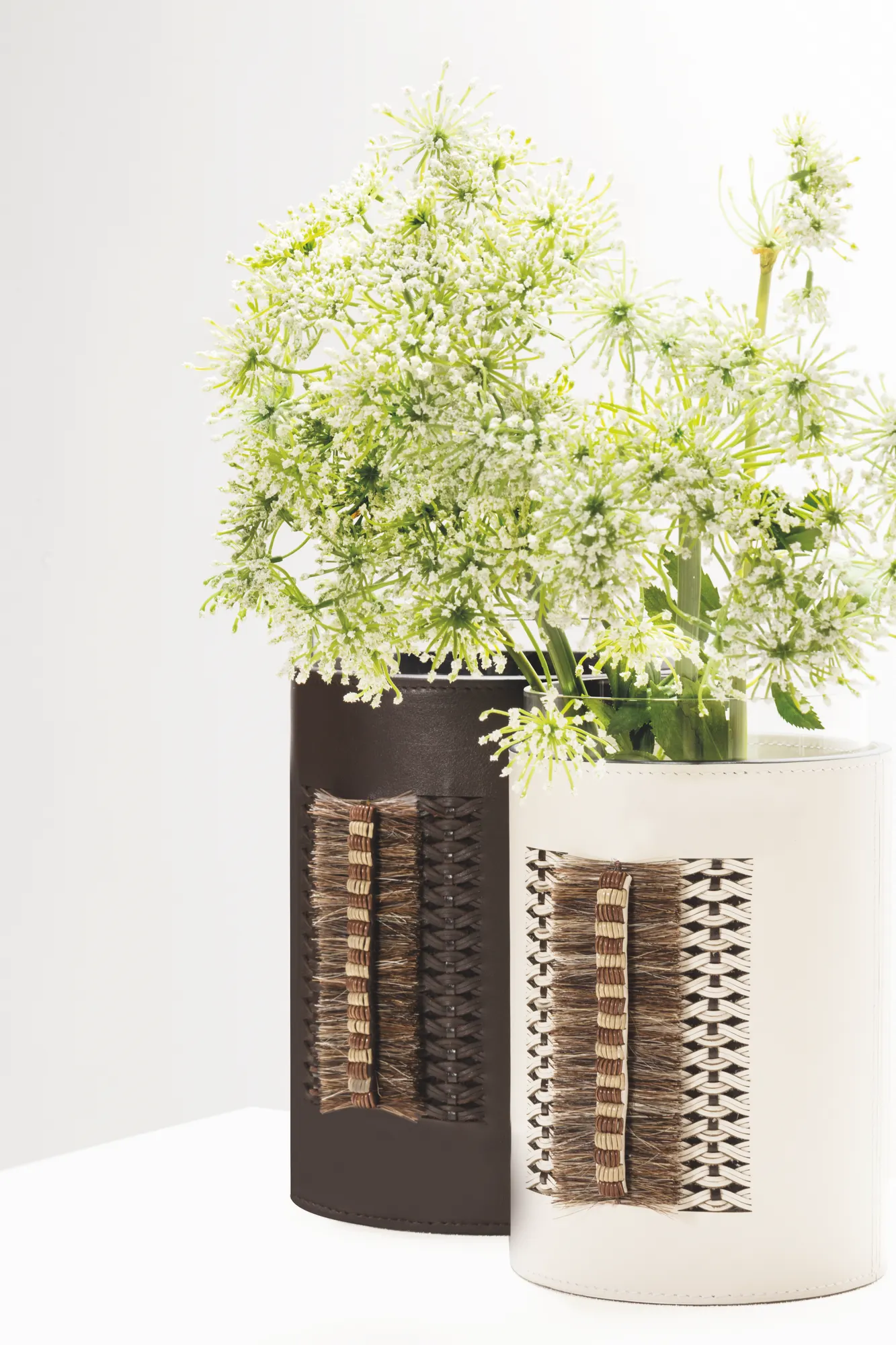 Partially leather-covered transparent borosilicate glass, removable for an easy cleaning. Special decoration made with horsehair and woven leather. Available only in nappa leather in the following color finishes: black (F20), brown (F09), stone (F83), ivory (F06), off-white (F95), mango orange (F04), siena (F08).