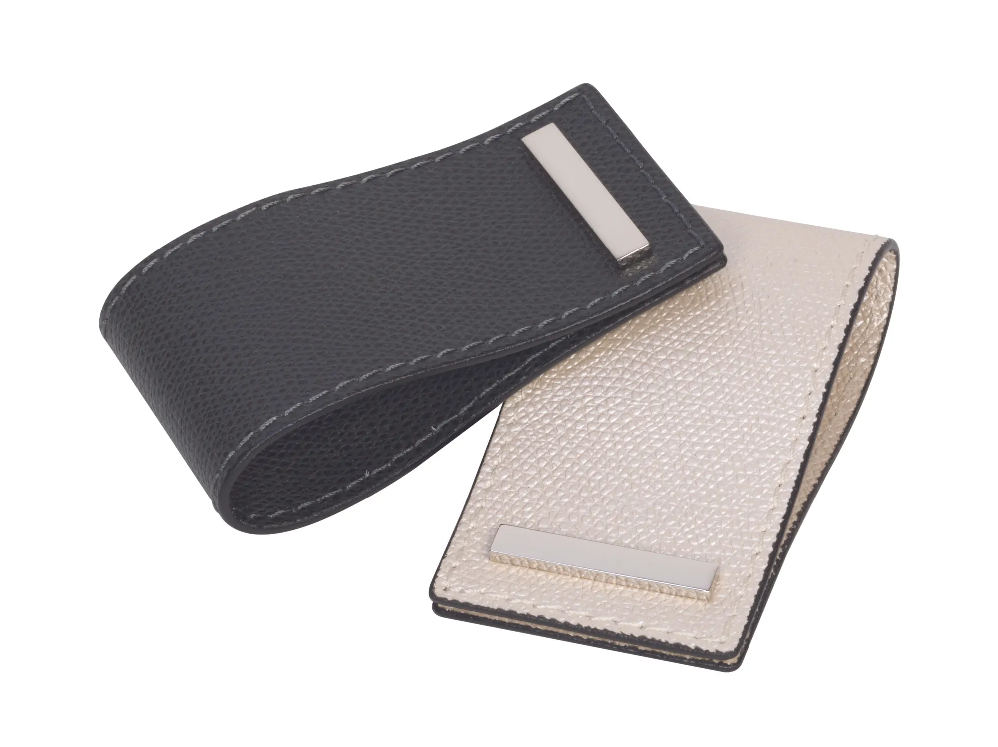 All-leather structure with chrome closing. Leather covered brass structure with palladium-plated and PVD coating. Hypoallergenic. Black PVD finish is additional to the classic palladium-plated and gold-plated finishes.