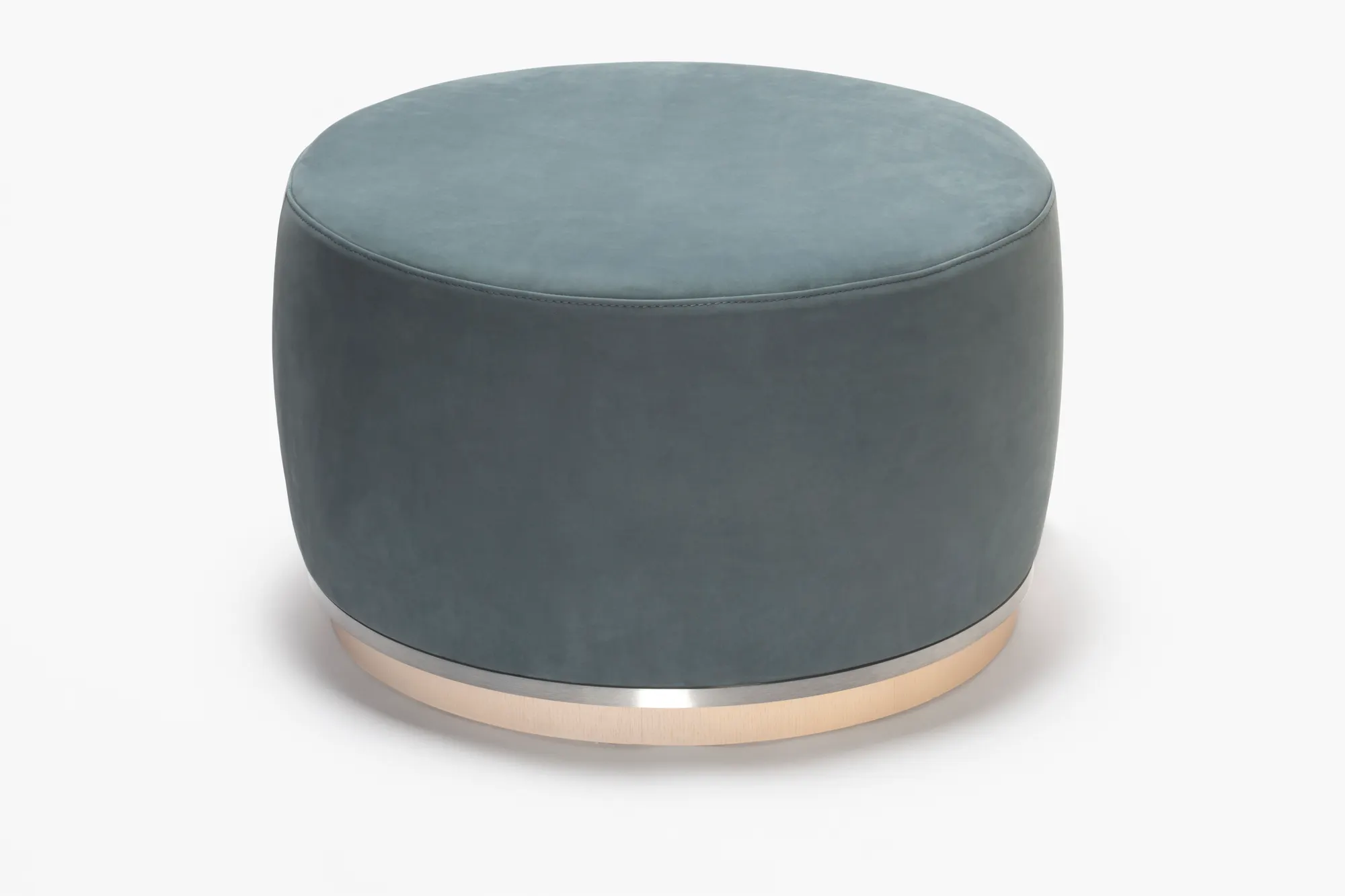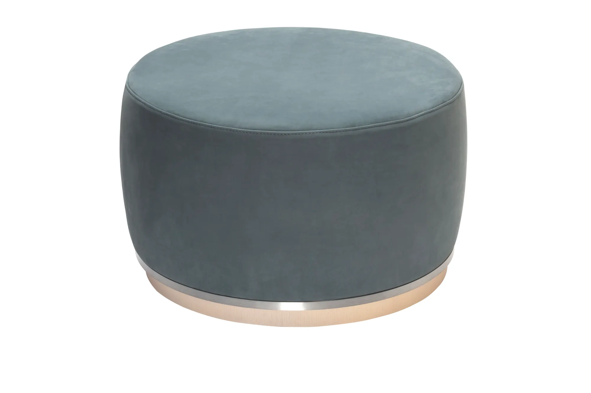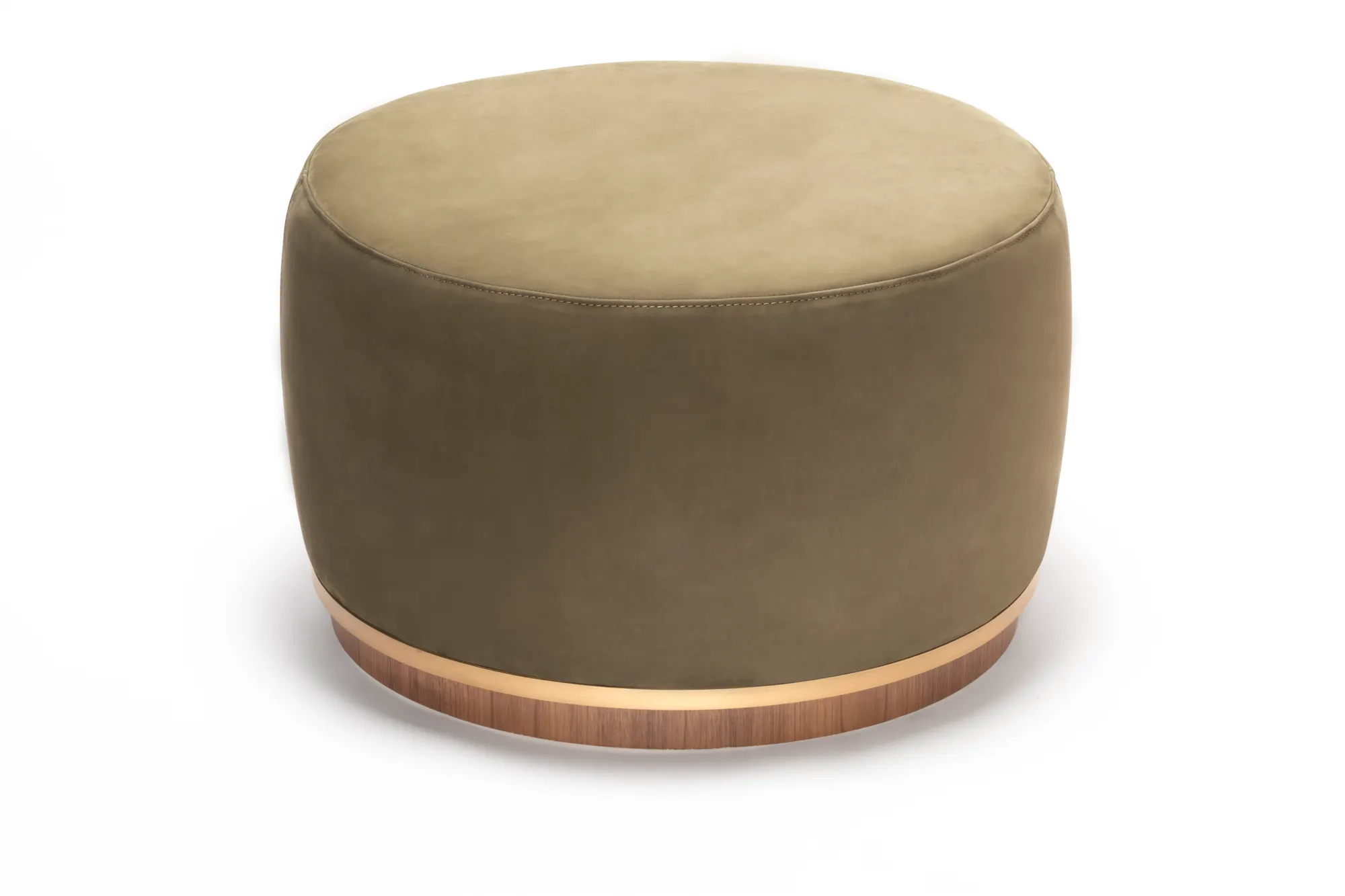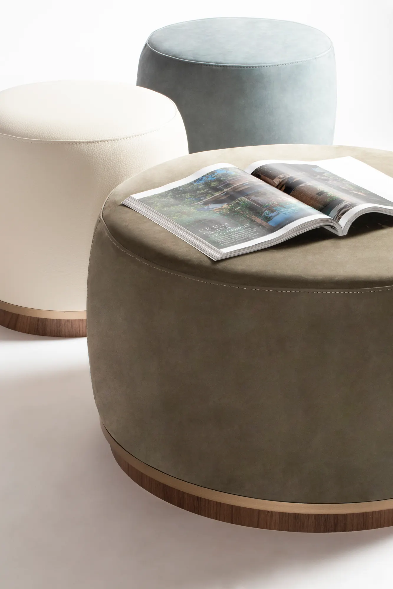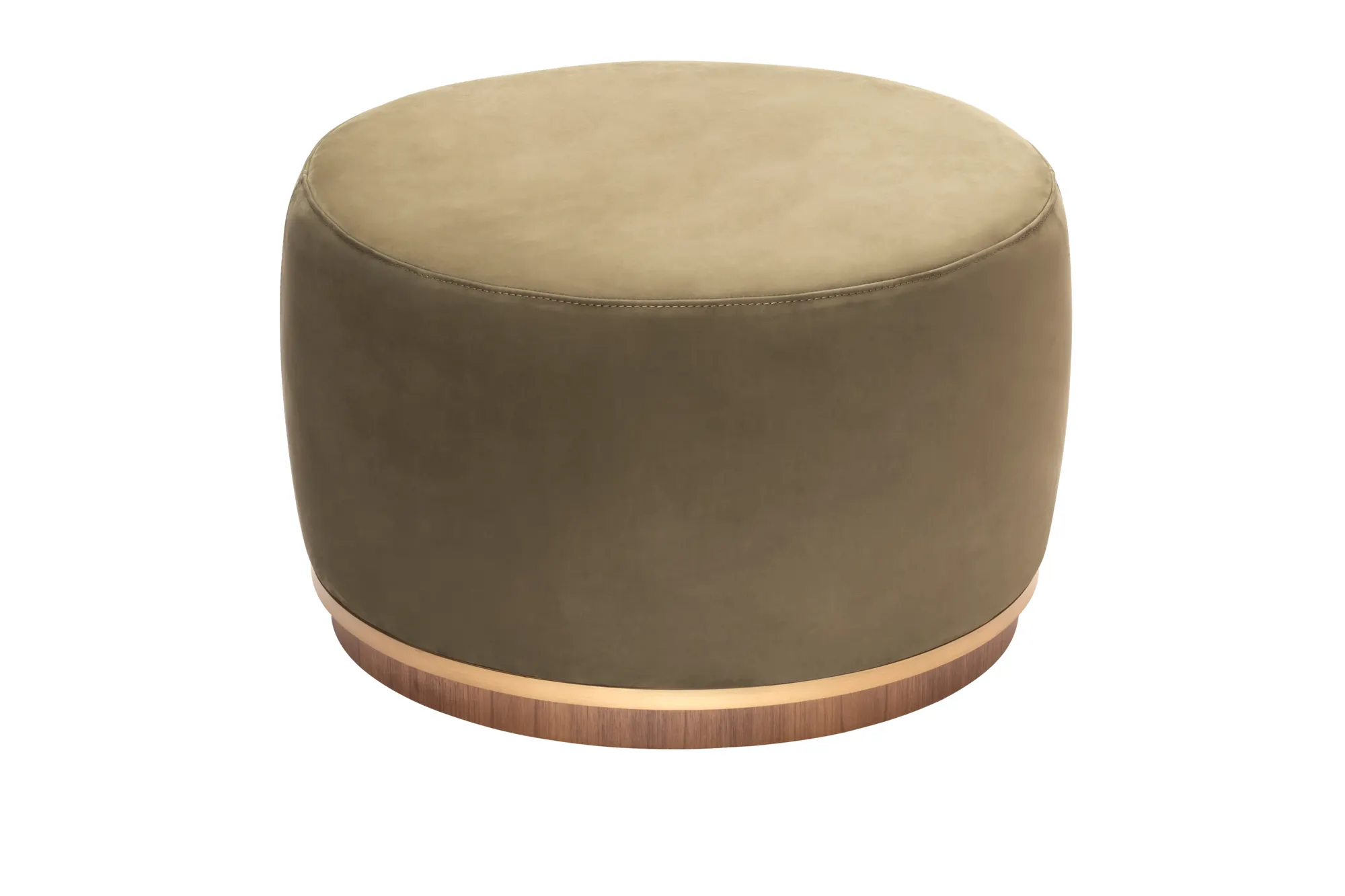 Upholstered leather pouf featuring a wooden base decorated with a fine metal ring.