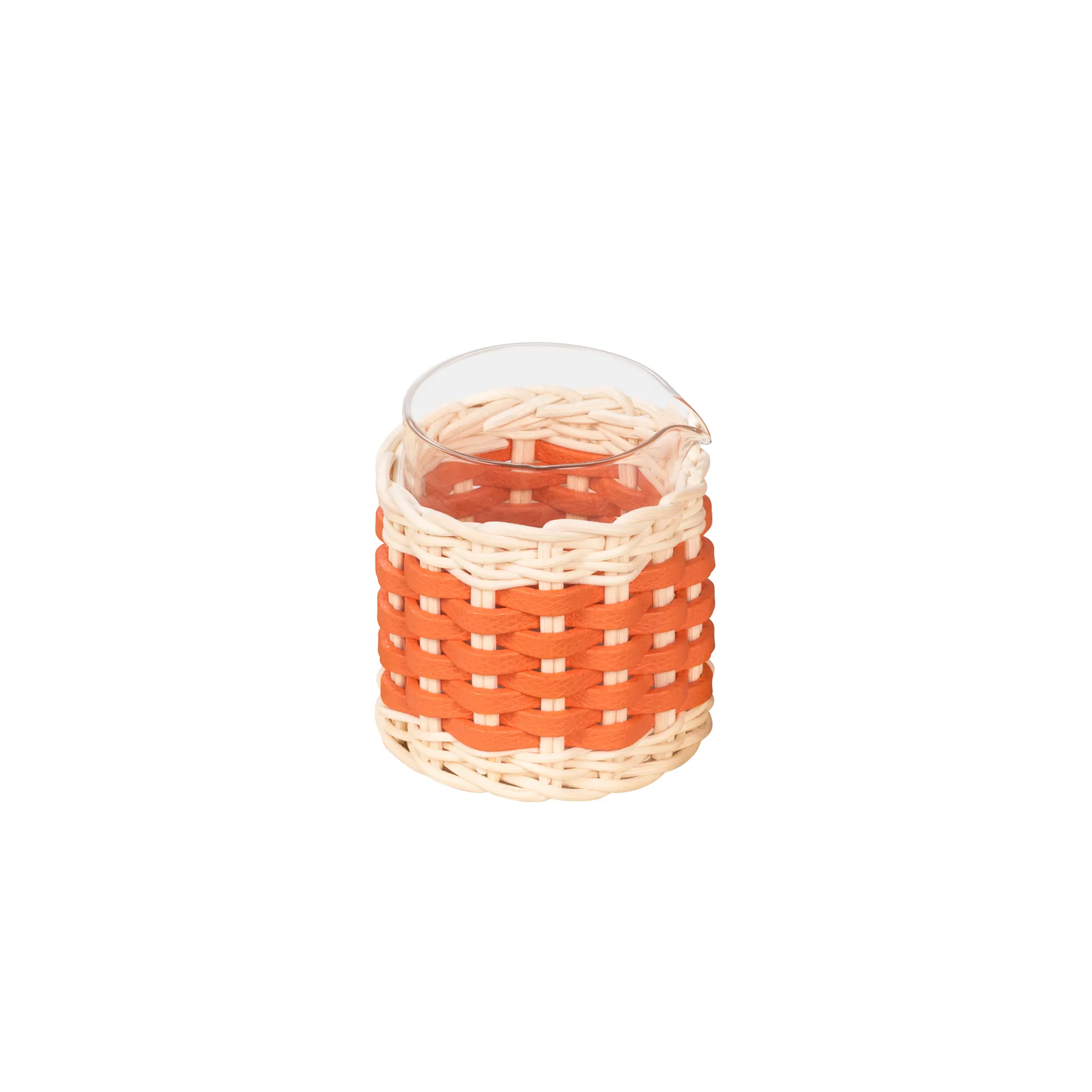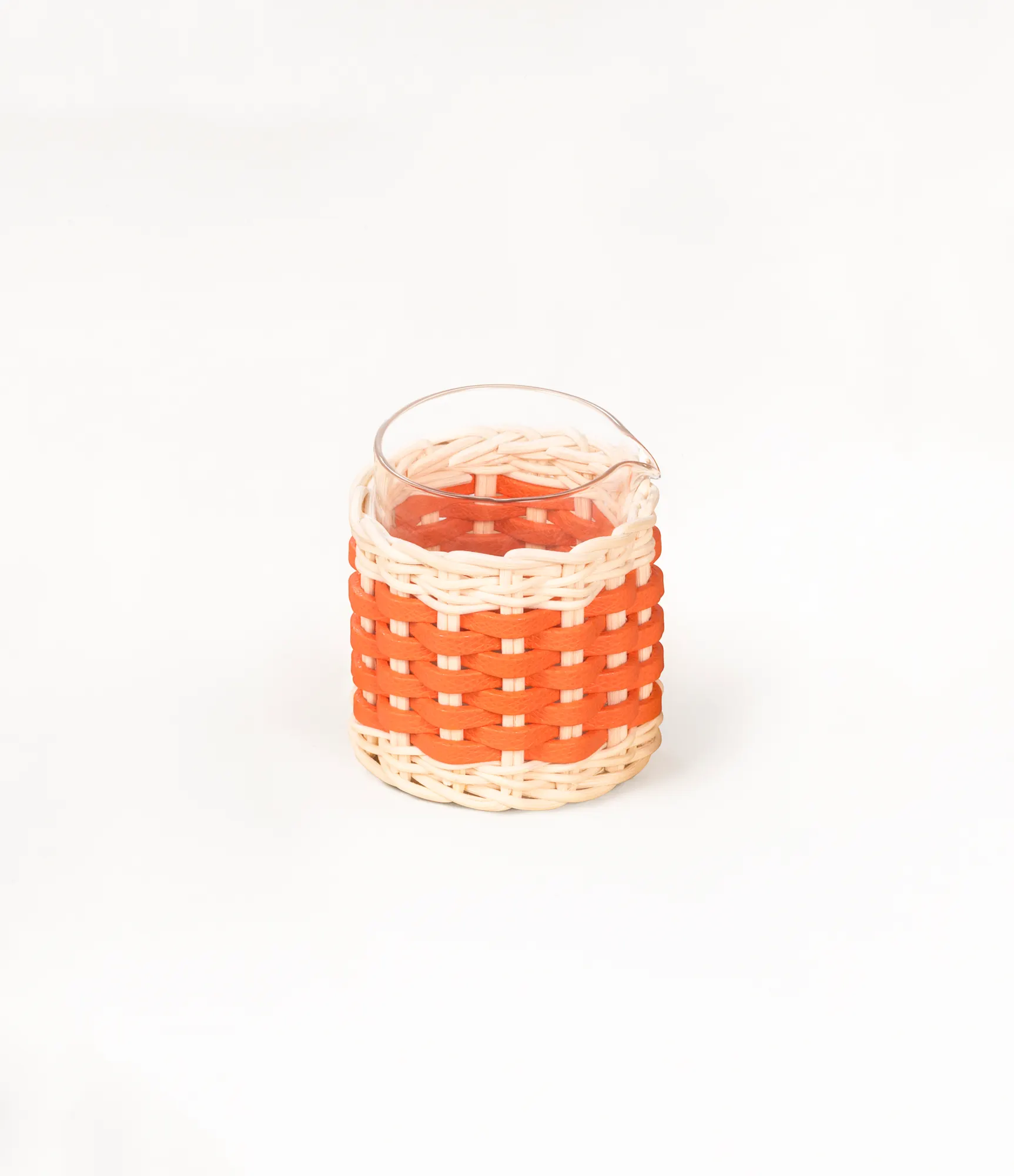Transparent borosilicate glass partially dressed in woven leather and rattan.