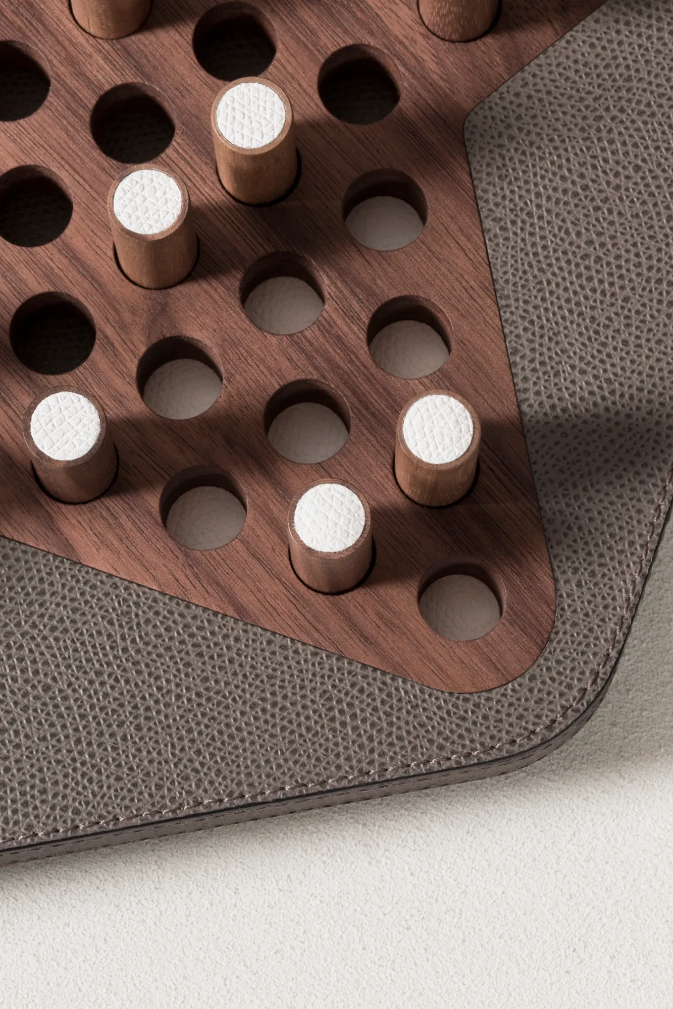 Partially leather-covered wood structure. The set is equipped with wood pieces featuring leather inserts.