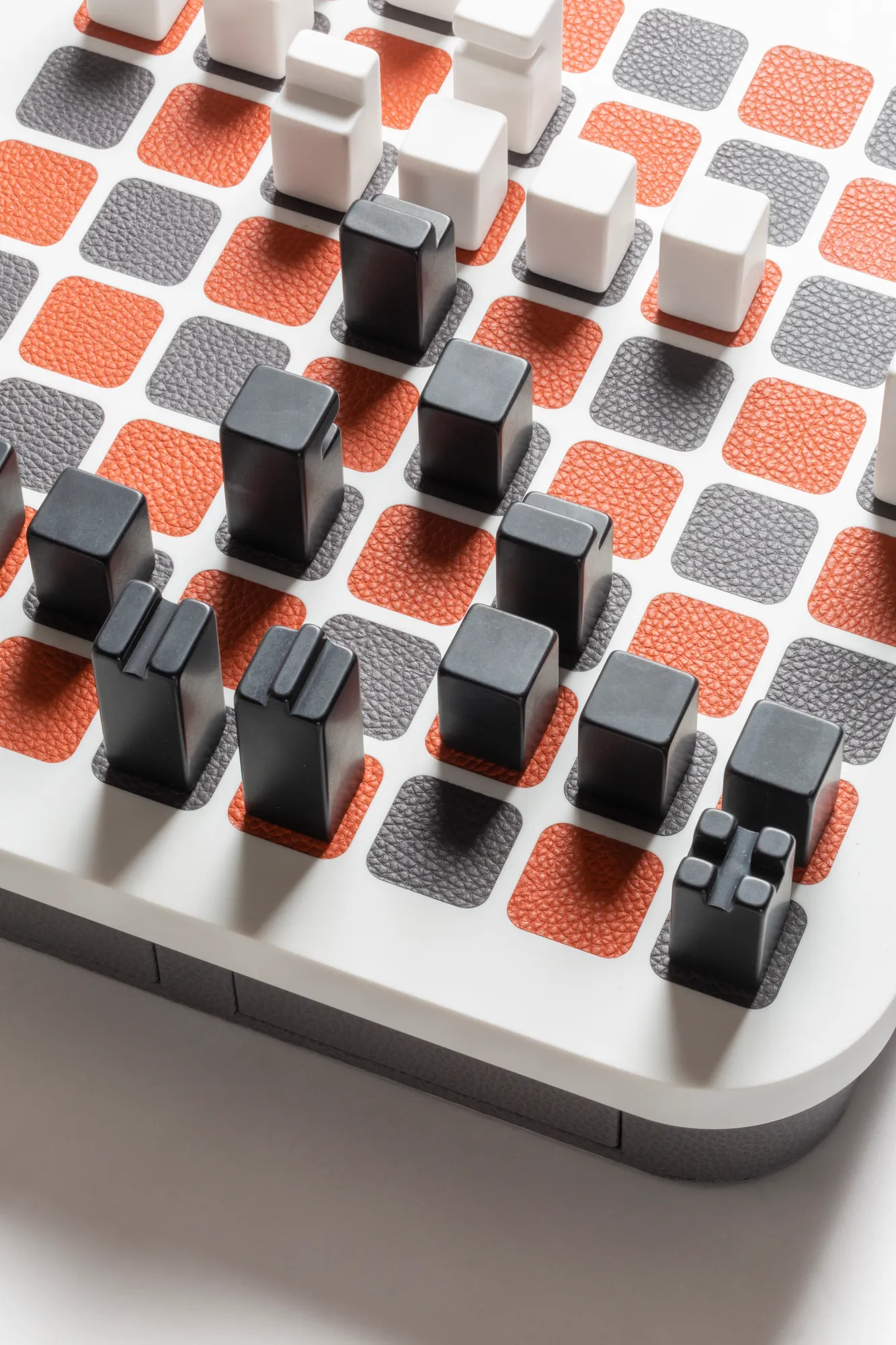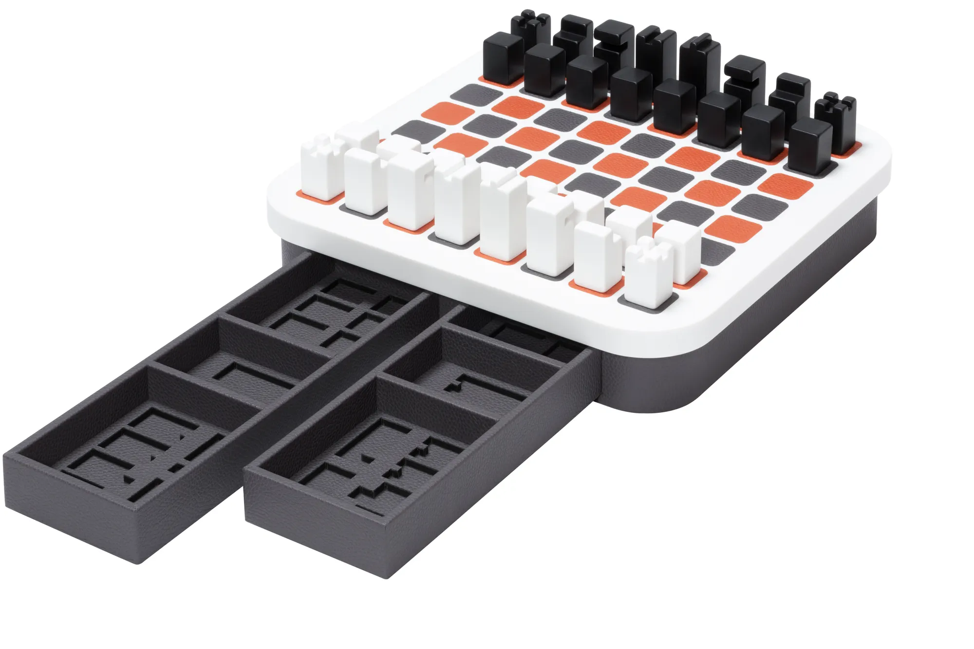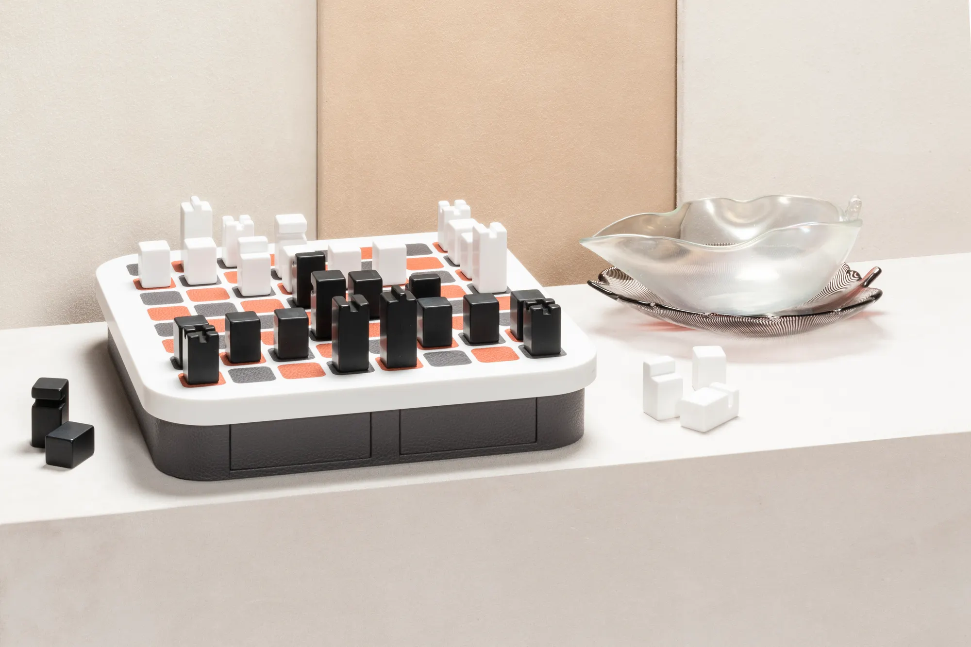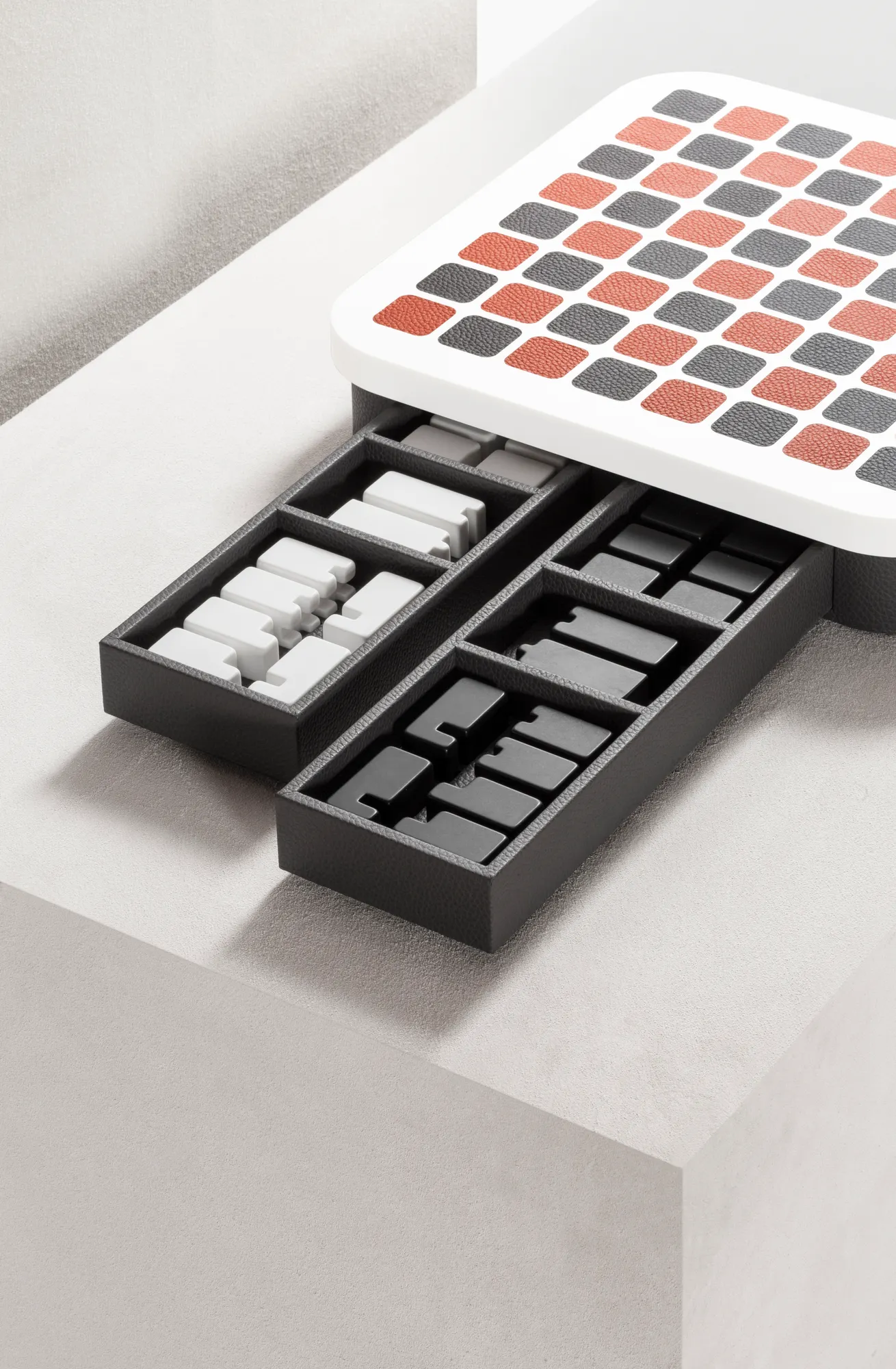 Corian® structure featuring fine leather inserts on top and a leather base provided with magnetic drawers with spaces to store playing pieces. The set is equipped with high-quality Corian® black and white pieces paired together.