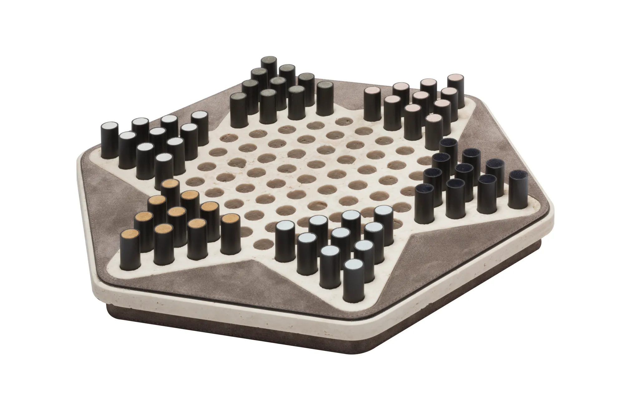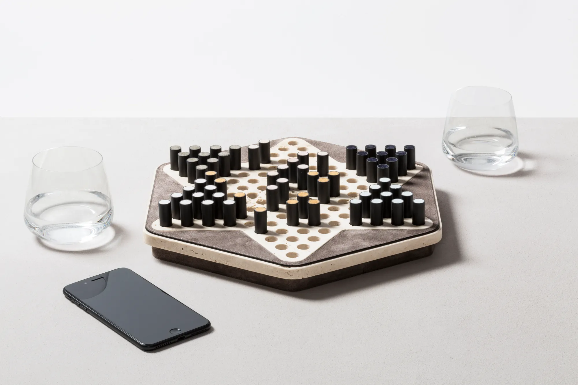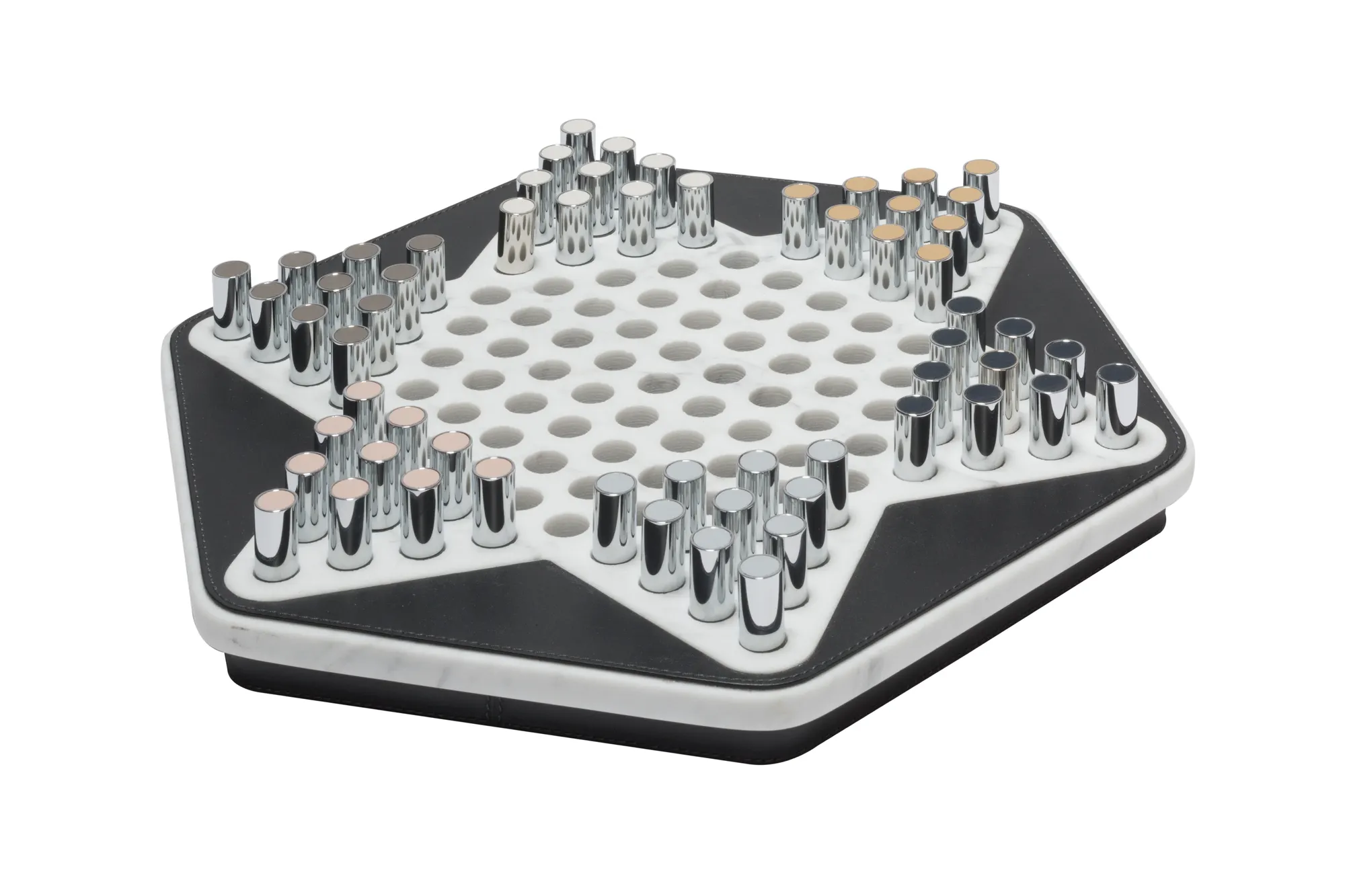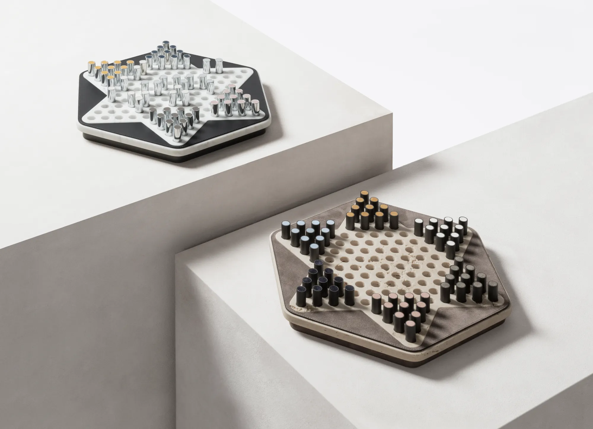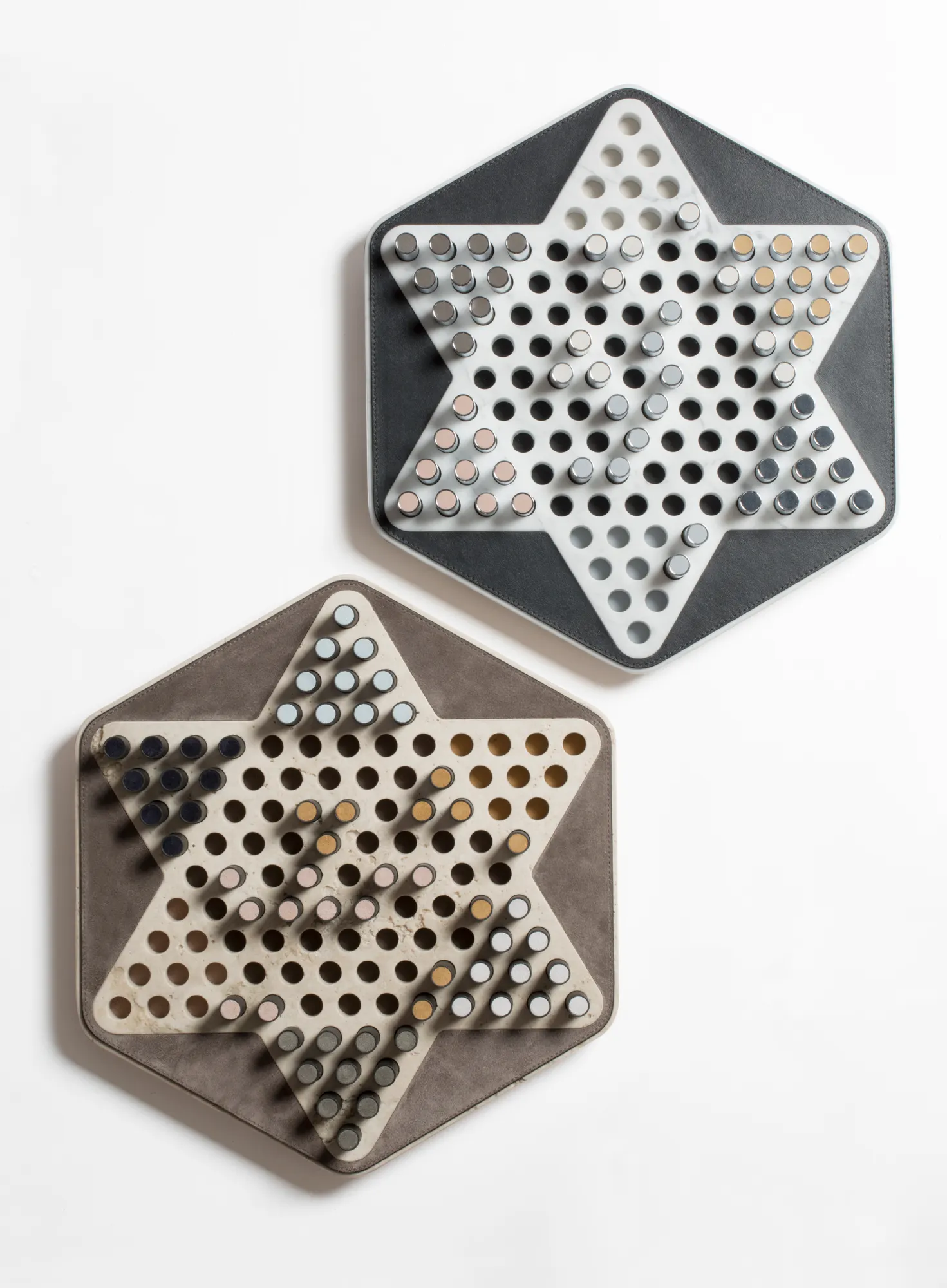 Partially leather-covered marble structure available in different finishes. The set is equipped with metal pieces featuring leather inserts.