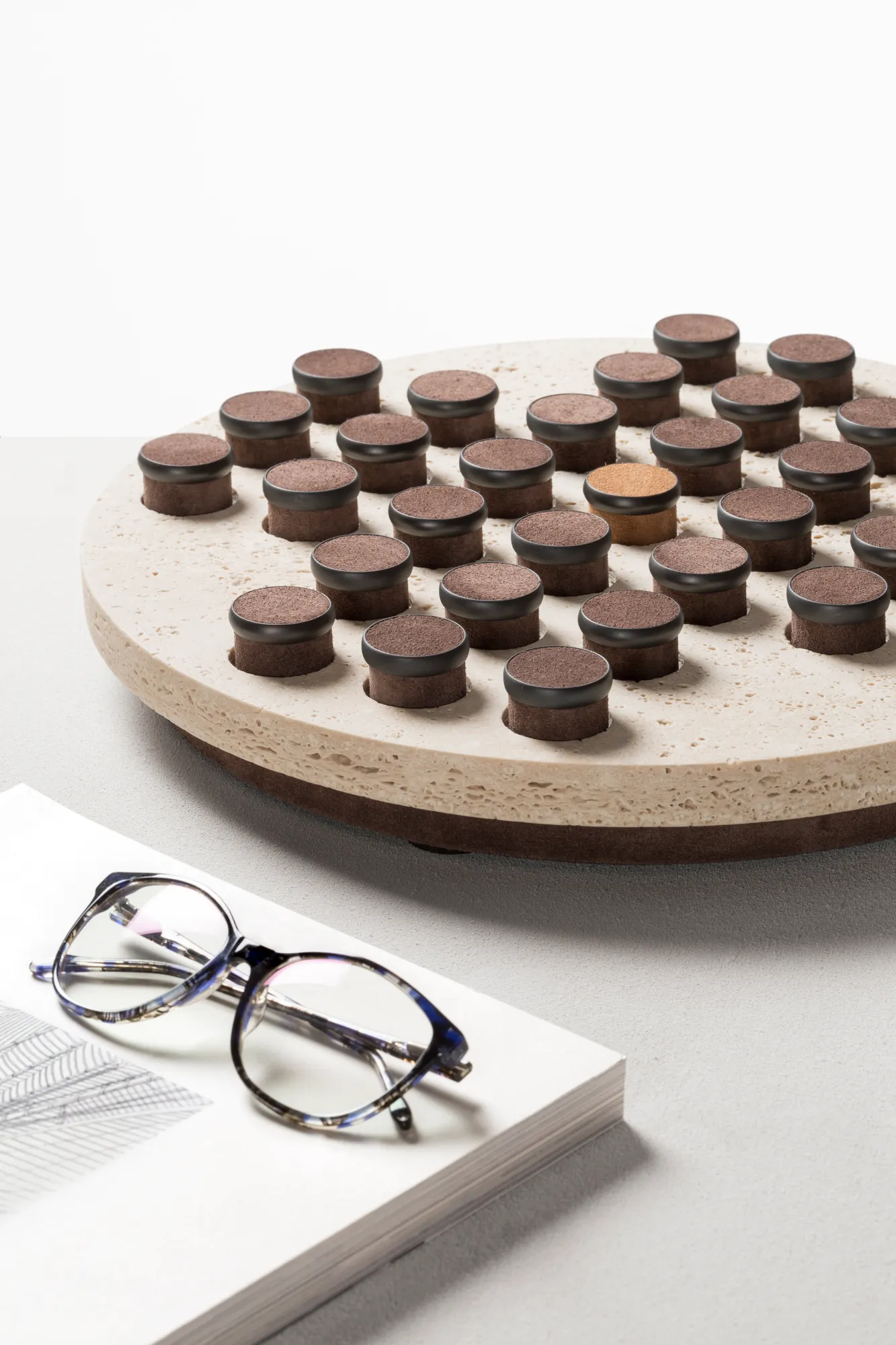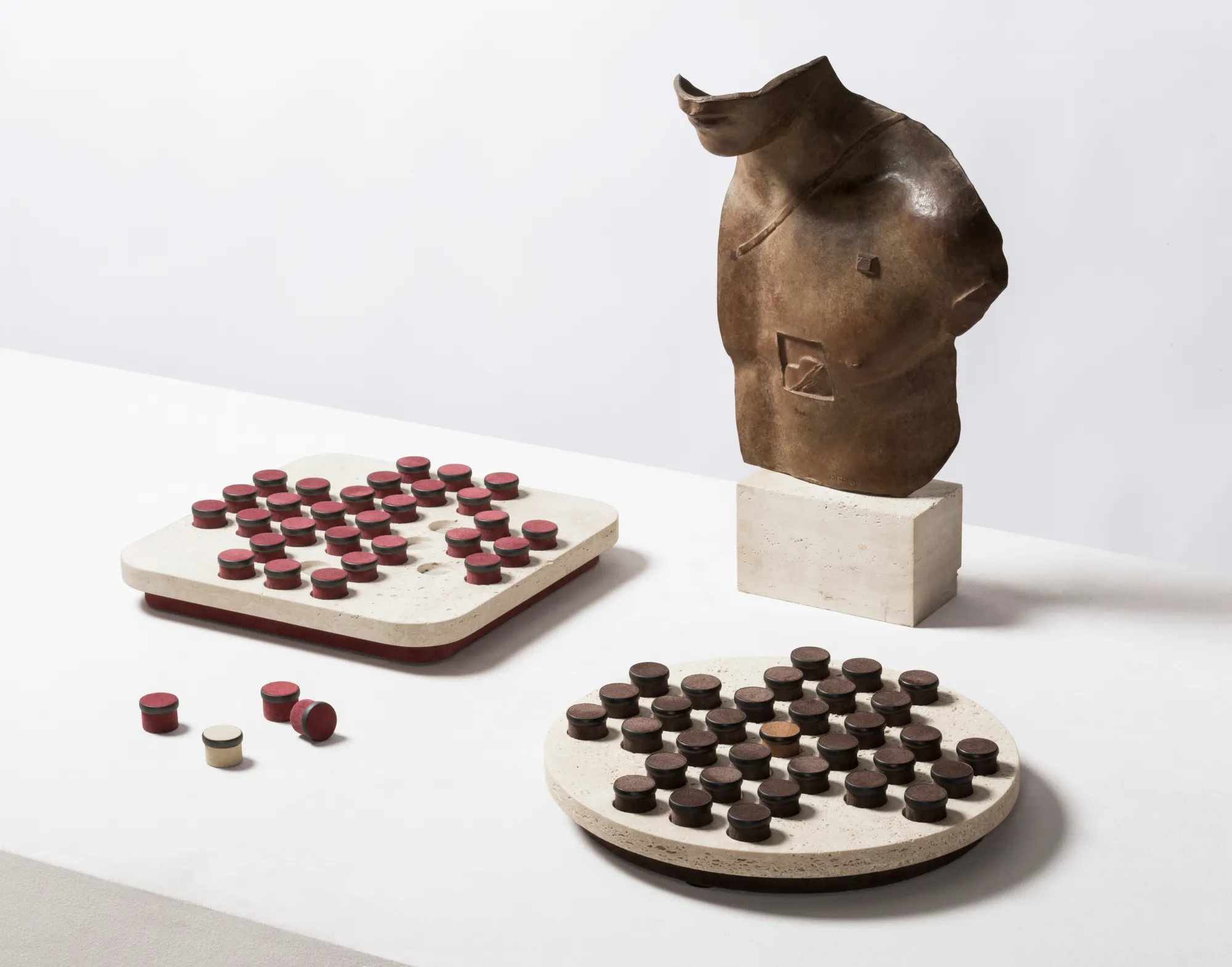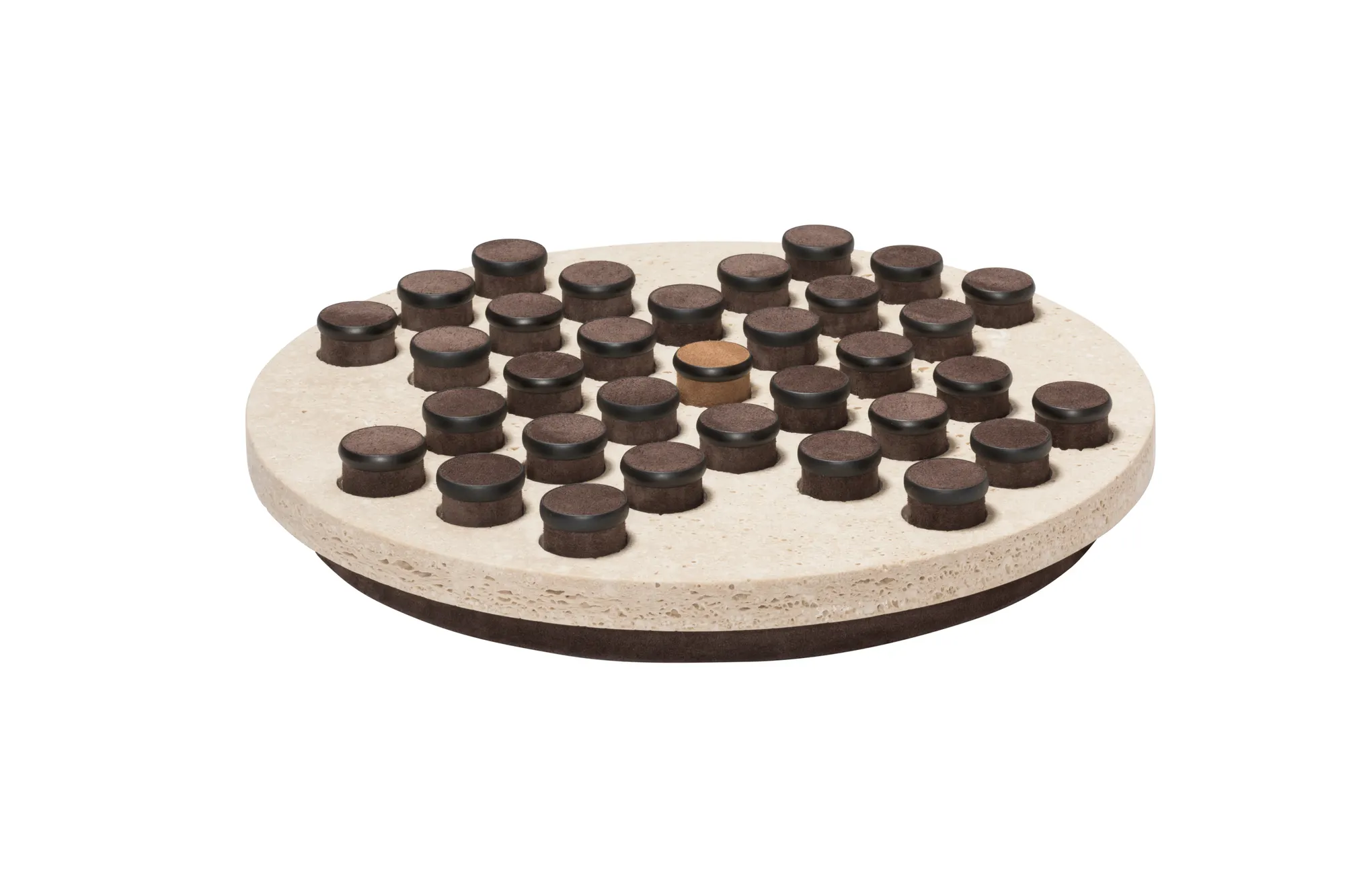 Marble playing field featuring a fine leather base. The set is equipped with metal pieces with leather inserts.