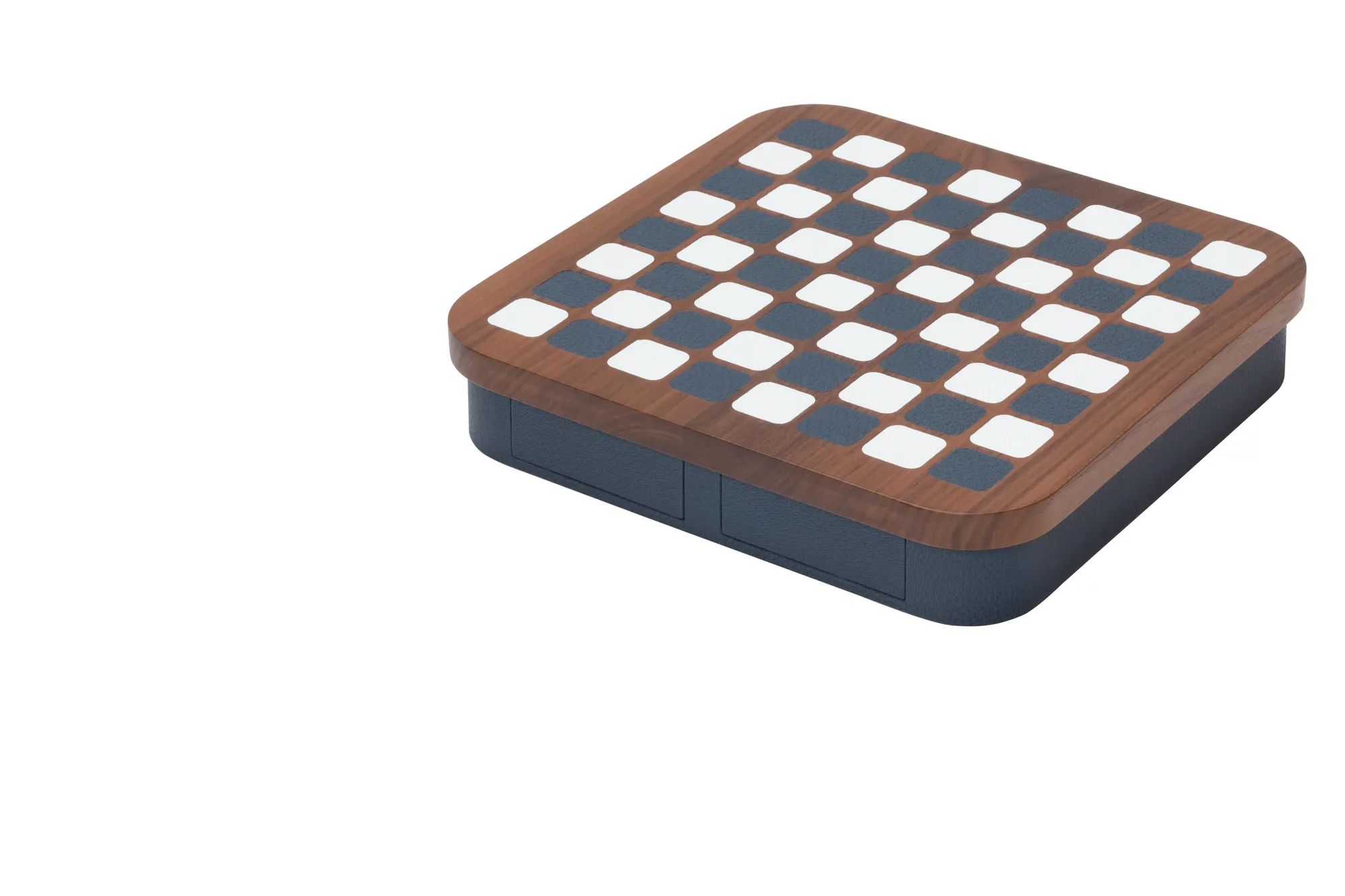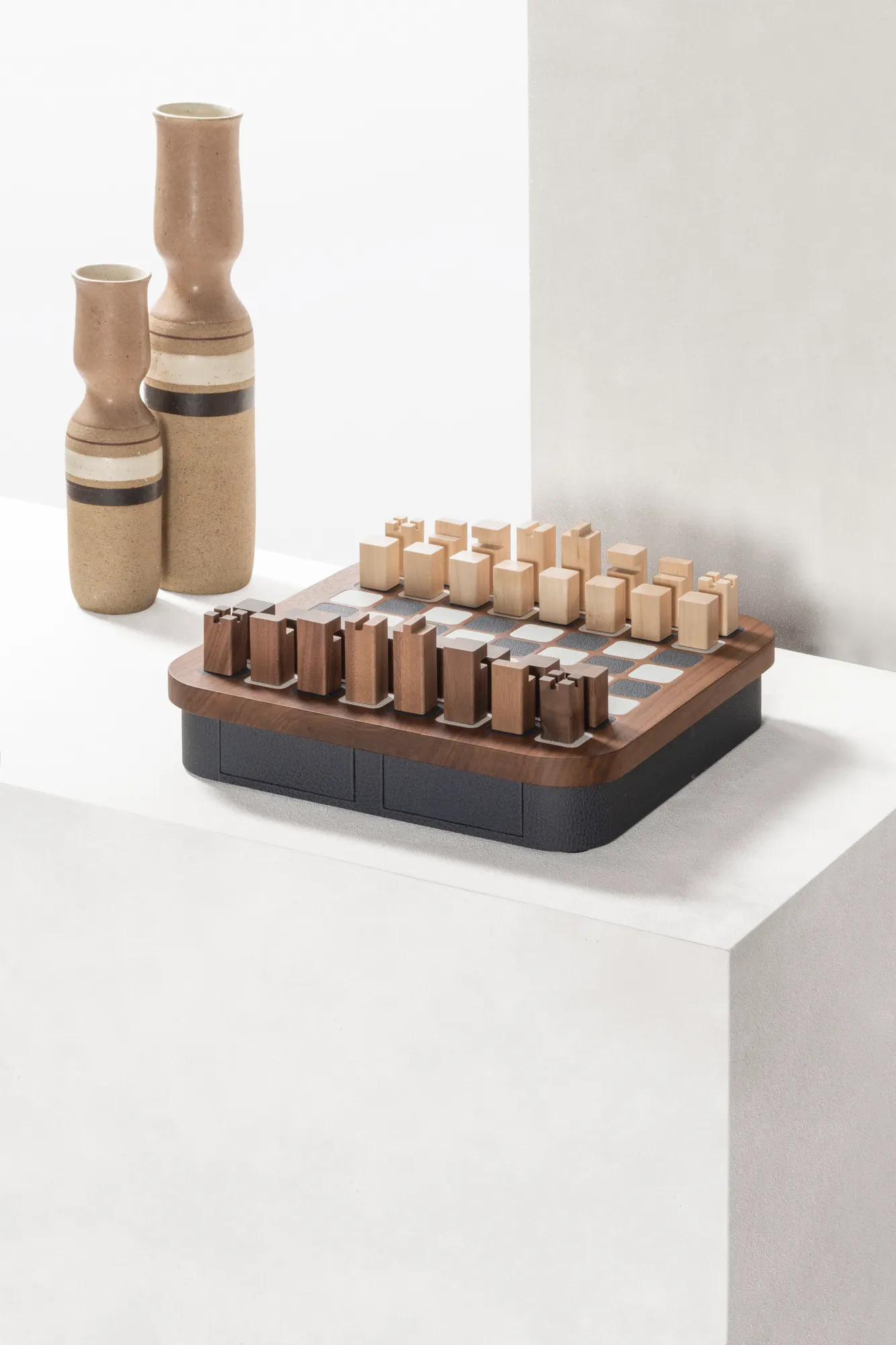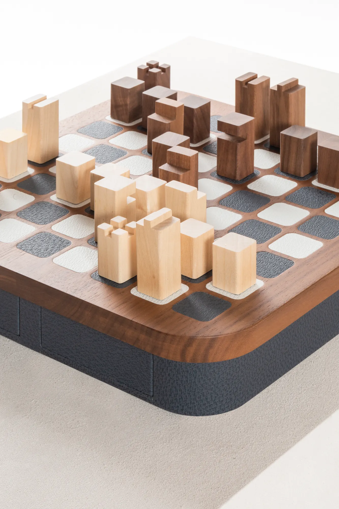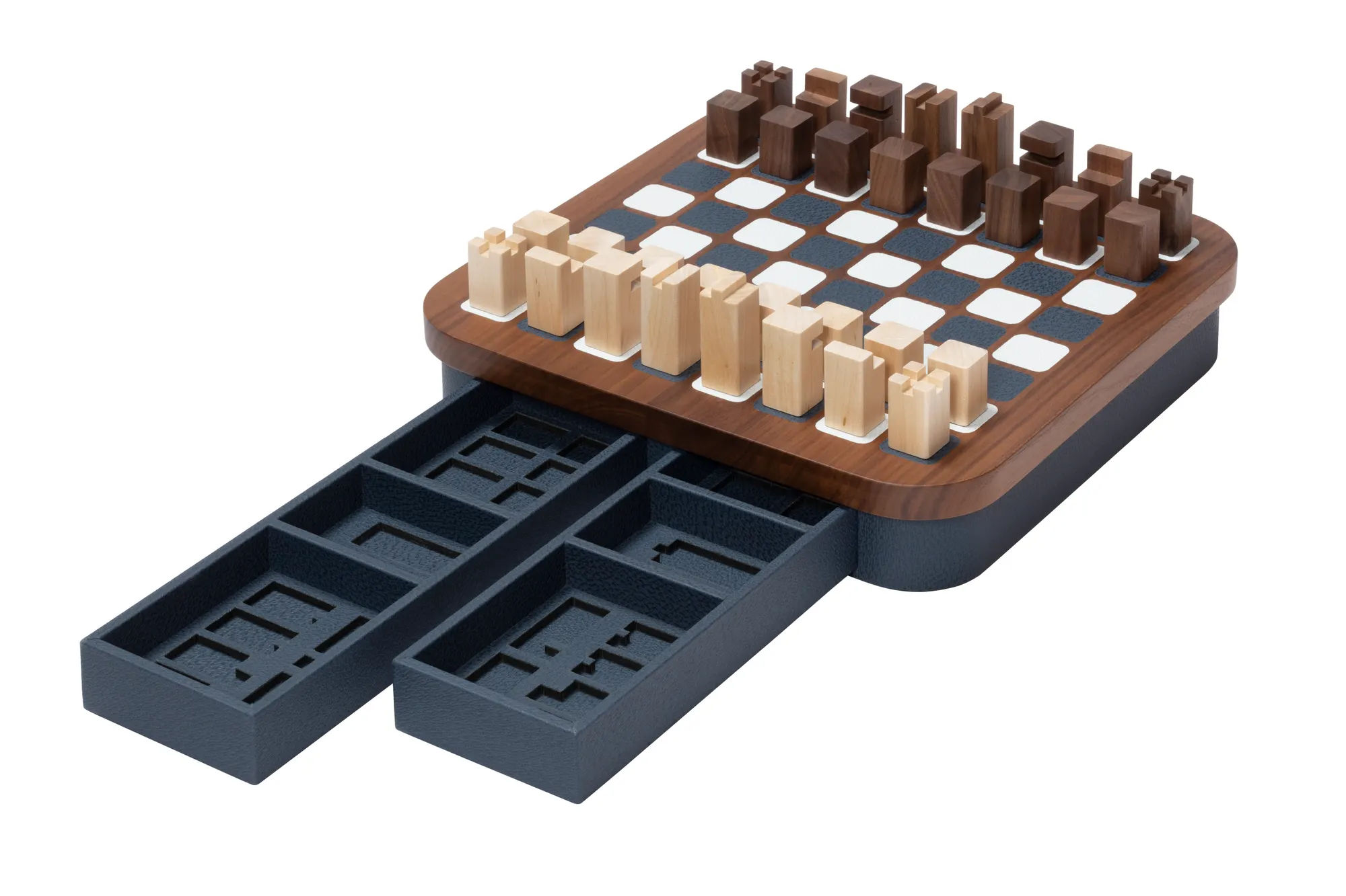 Wood structure featuring fine leather inserts on top and a leather base provided with magnetic drawers with spaces to store playing pieces. The set is equipped with high-quality wood pieces with walnut and maple finishes paired together.
