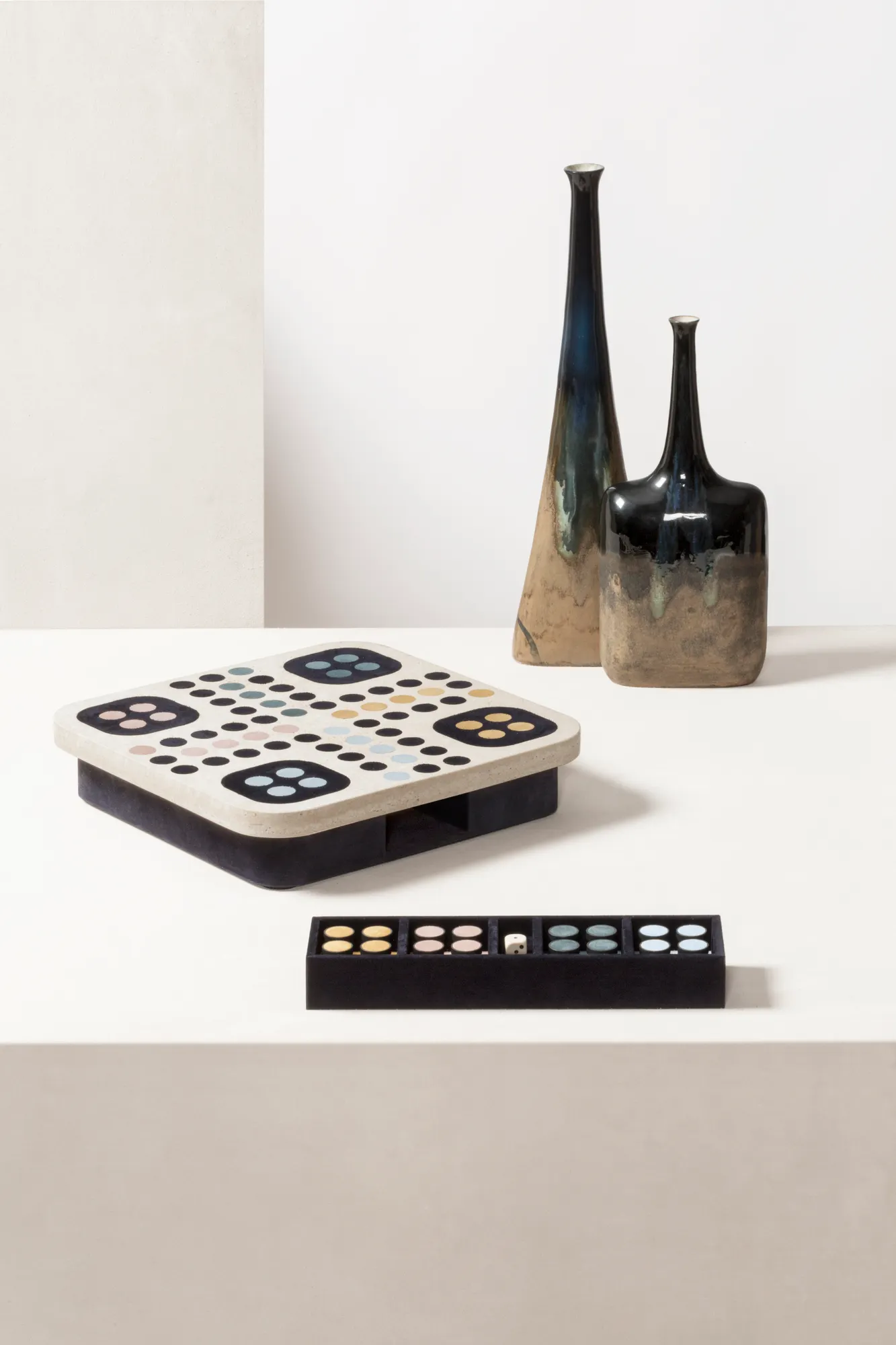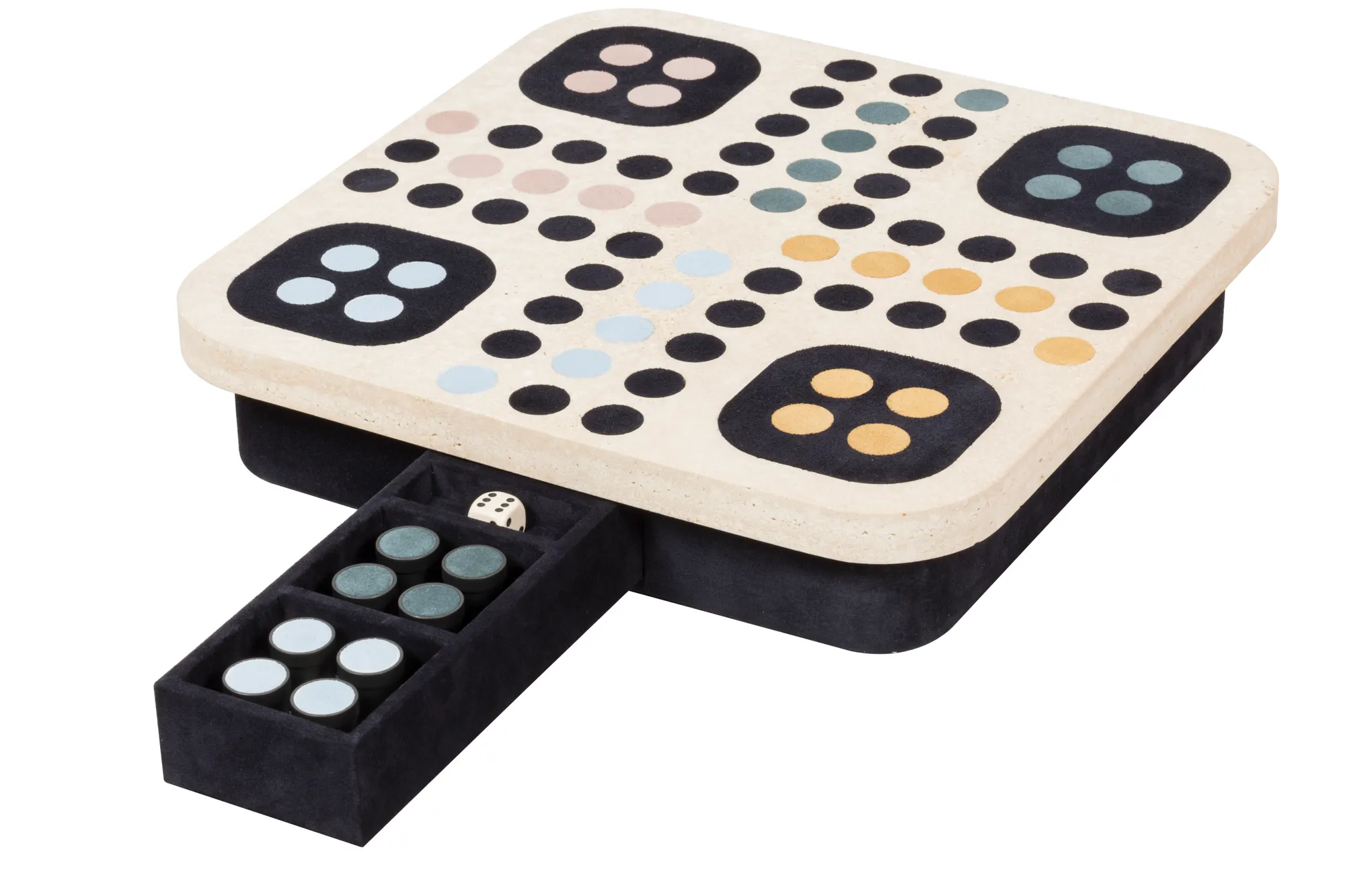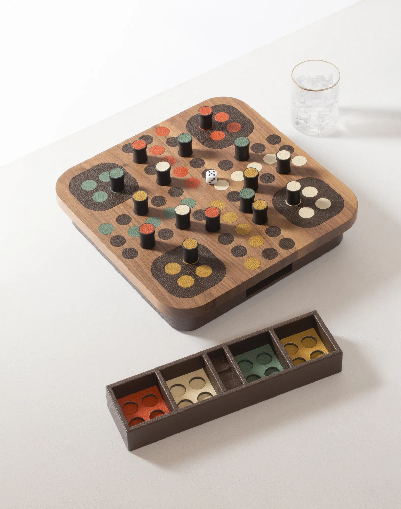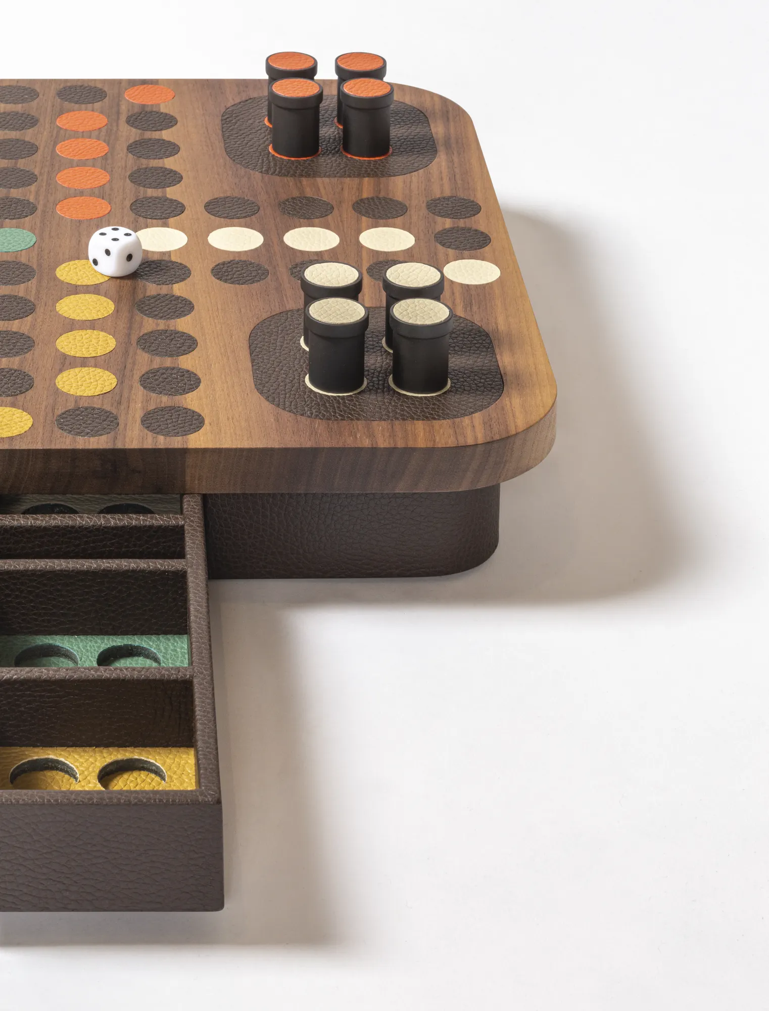 Walnut wood playing field featuring fine leather top inserts and base. The set is equipped with metal pieces with leather inserts matching the colors of the playing field. Provided with a removable drawer that hosts the playing pieces and dice when not used.