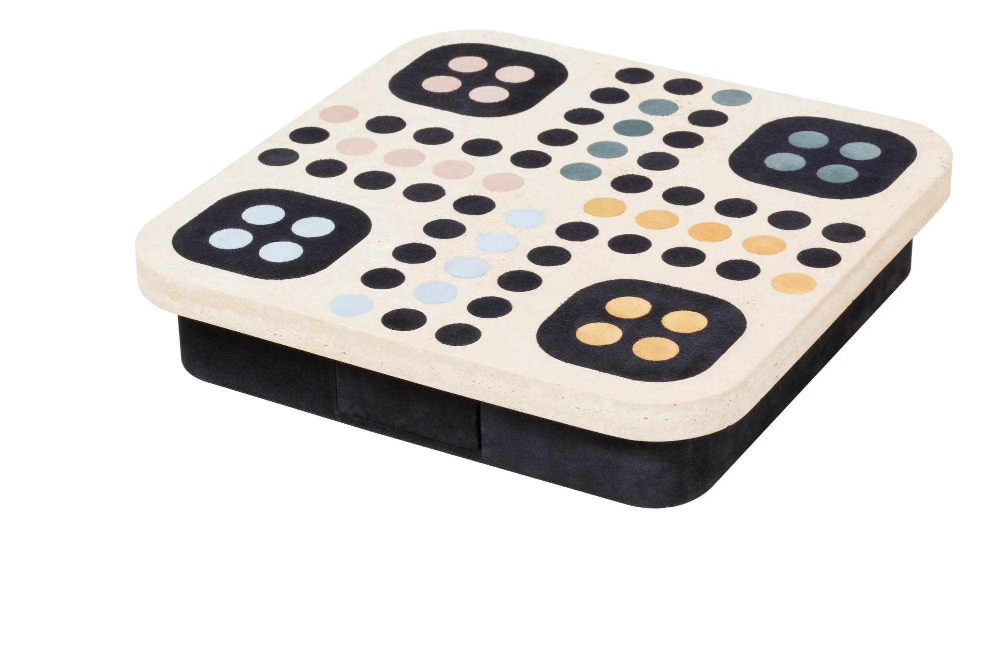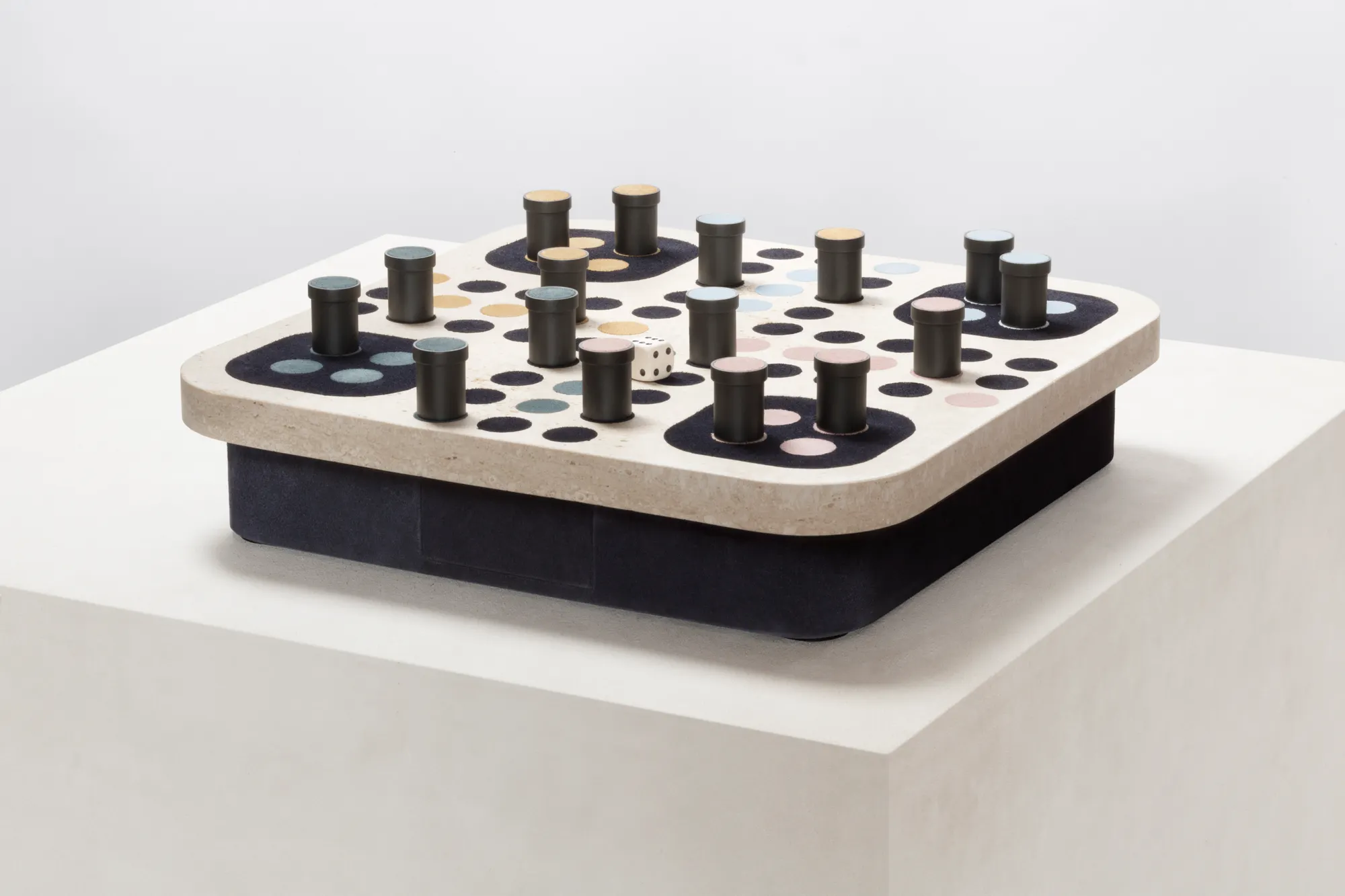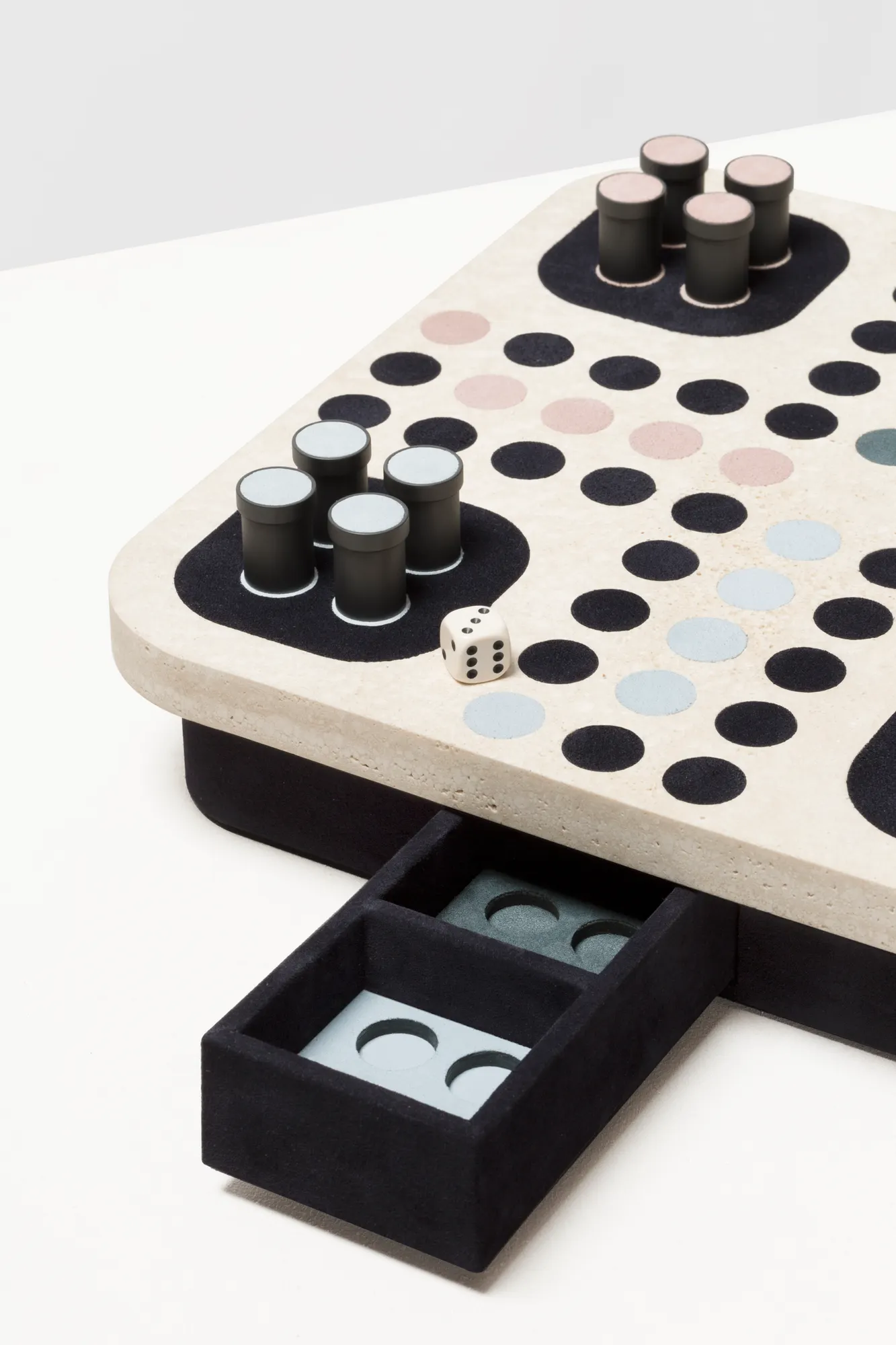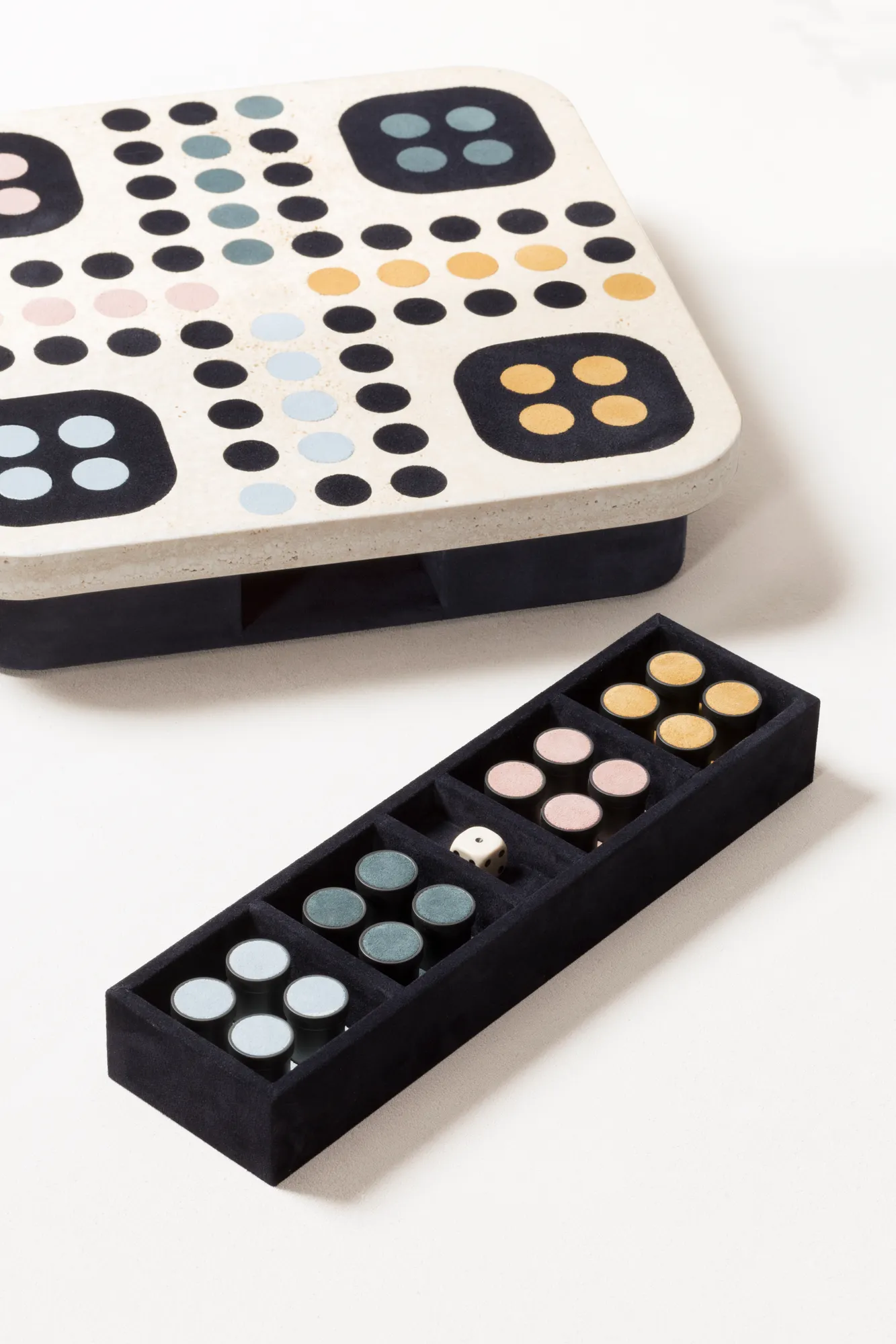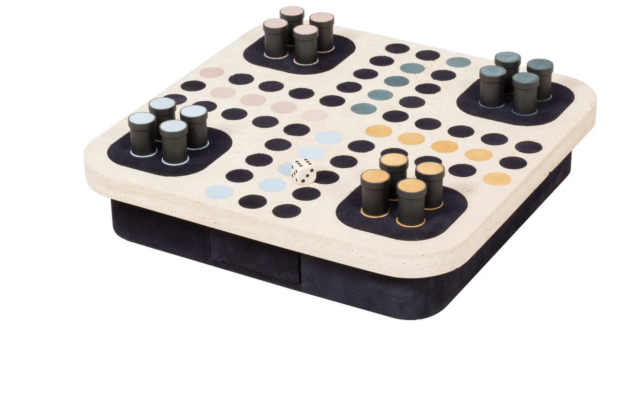 Walnut wood playing field featuring fine leather top inserts and base. The set is equipped with metal pieces with leather inserts matching the colors of the playing field. Provided with a removable drawer that hosts the playing pieces and dice when not used.