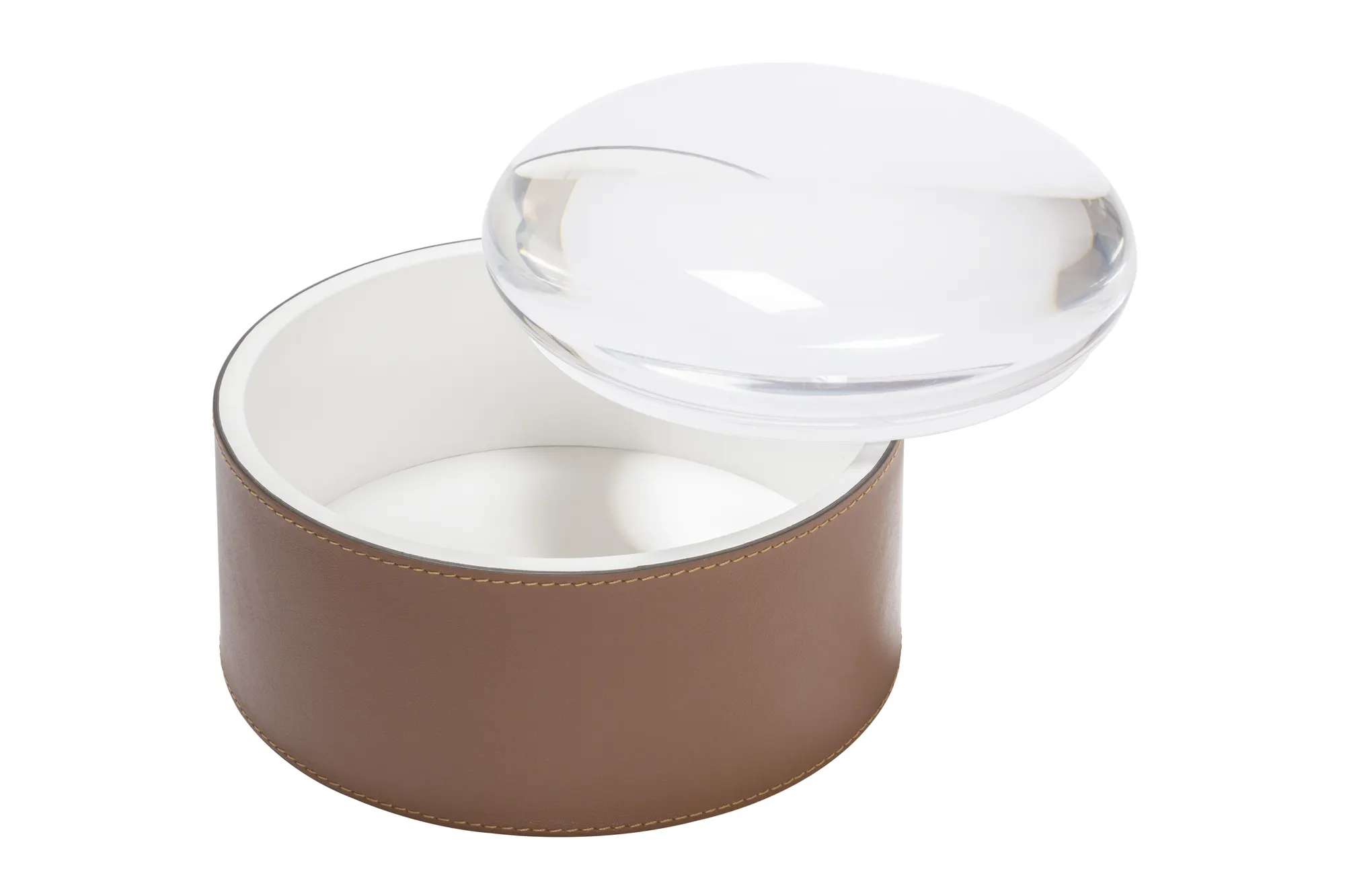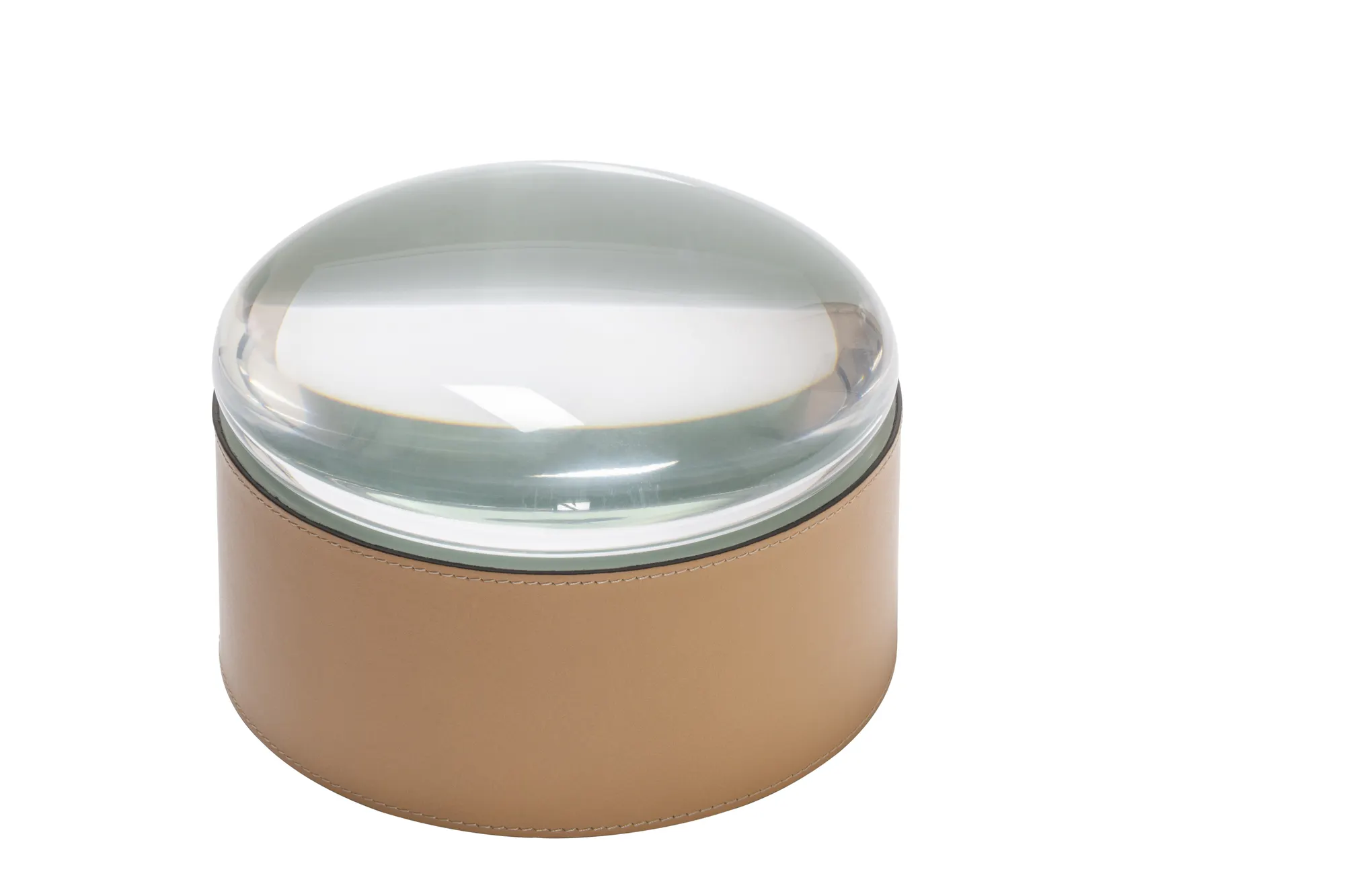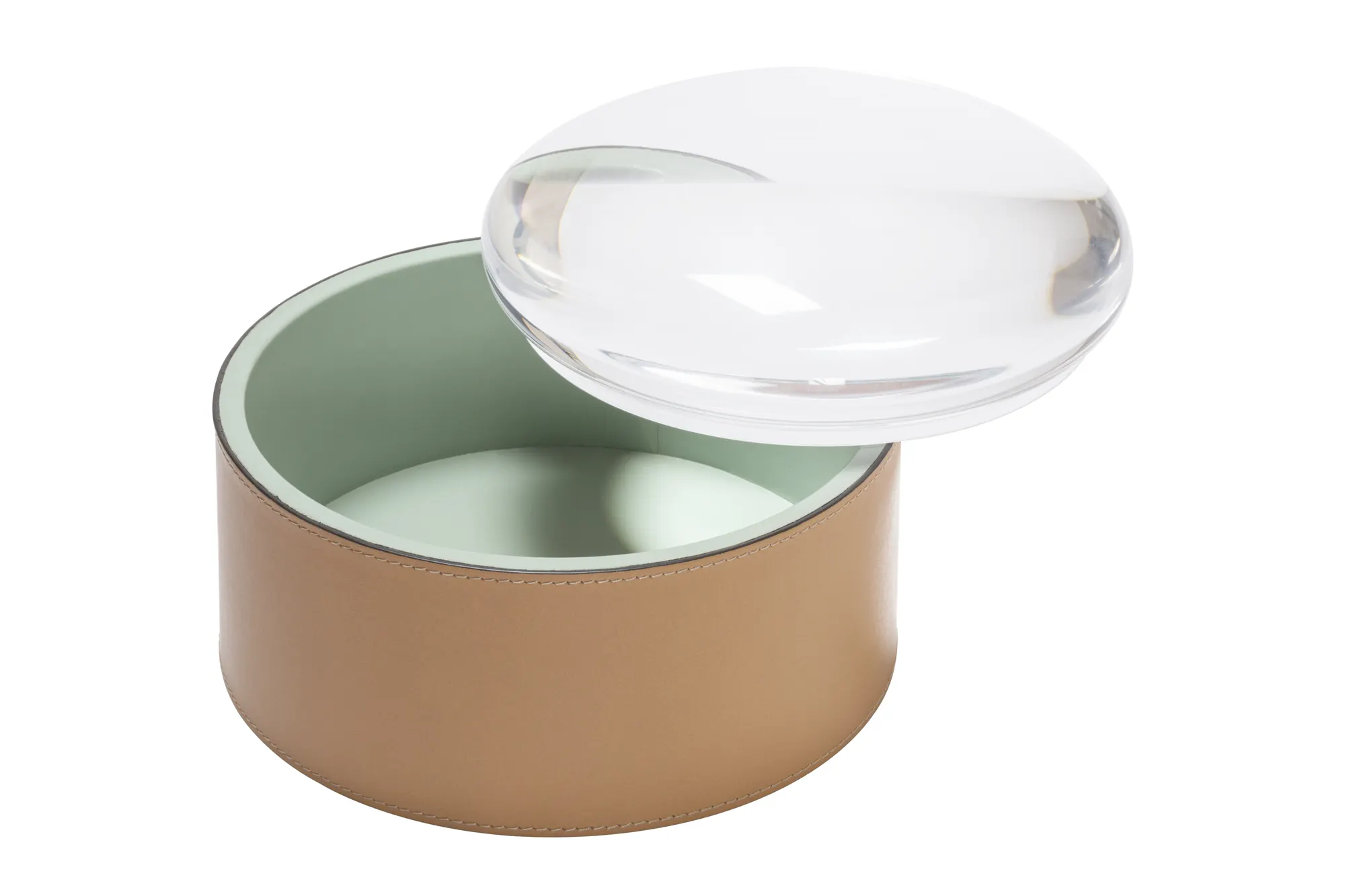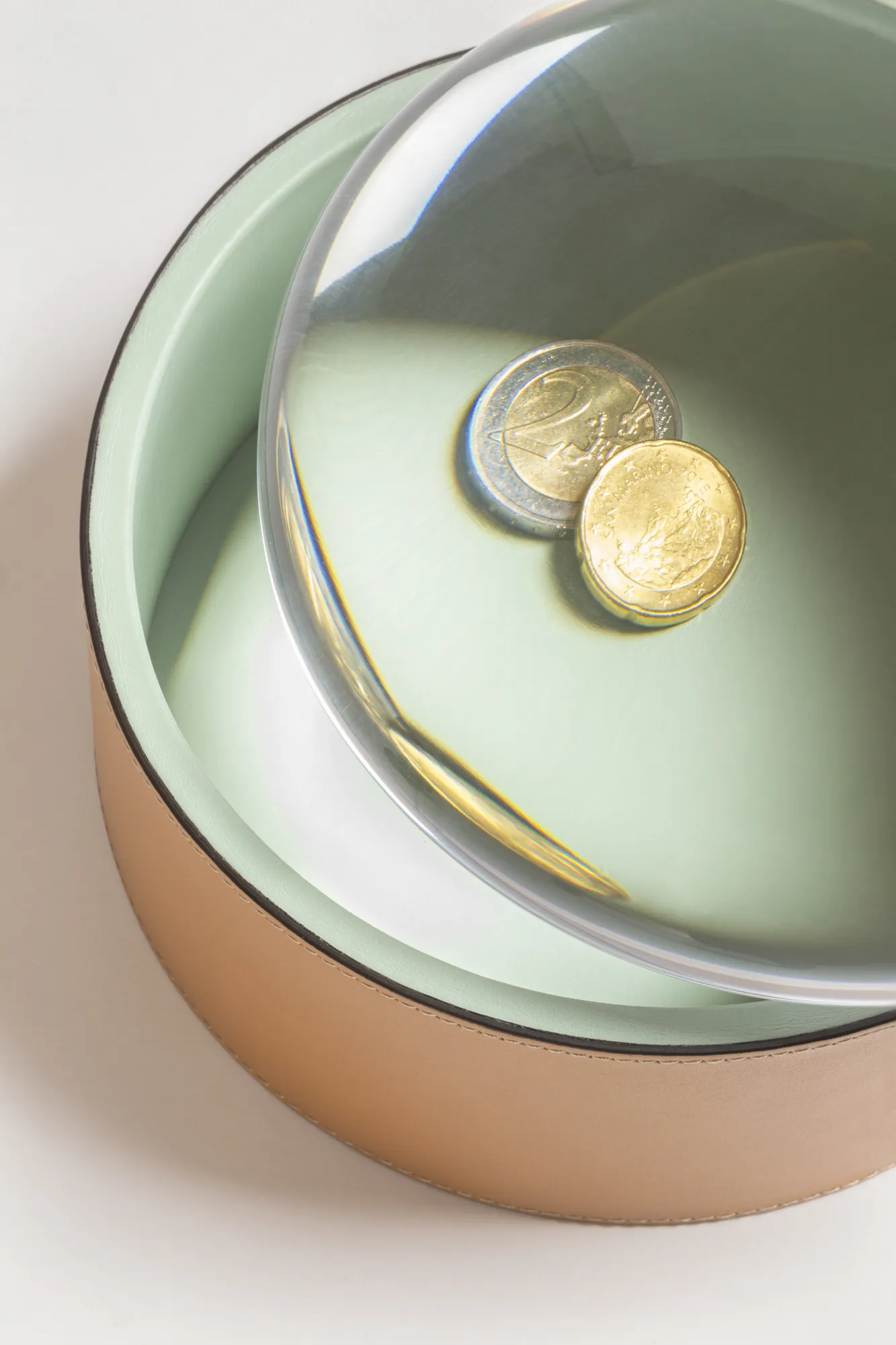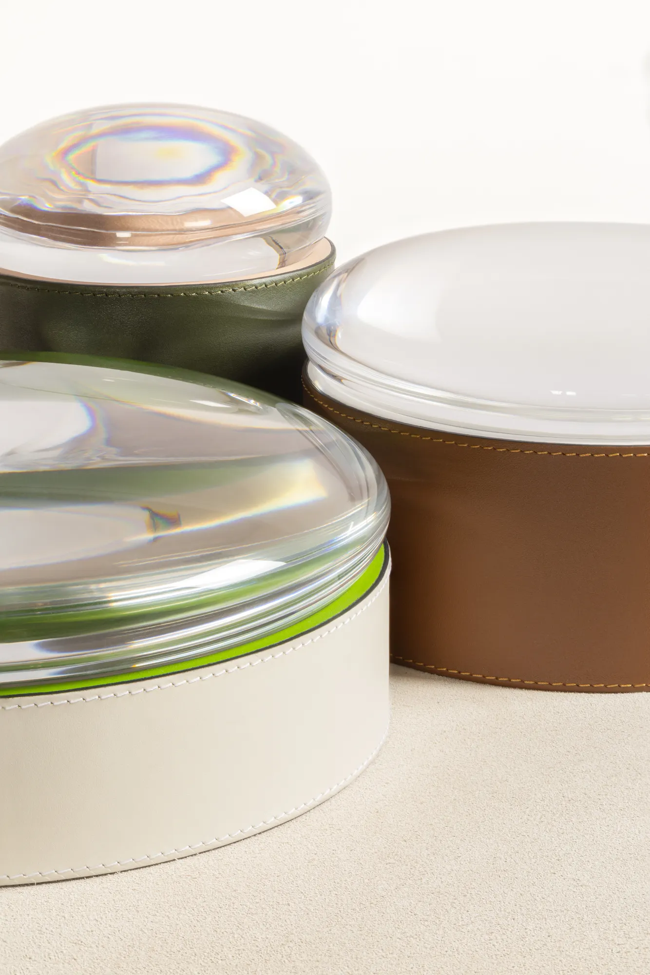 Beauty often lies in the smallest details. Dew is a captivating series of round trinket boxes that elevate the art of storage to new heights, transforming trinkets into precious jewels. A trio of trinket boxes in three different sizes, each a testament to meticulous craftsmanship. The allure of fine leather with its sumptuous texture is combined with enchanting plexiglass lids that resemble delicate dewdrops glistening in the morning sun, casting a mesmerizing magnifying lens effect over the treasures within. It is possible to choose two different colors and textures for the inside and the outside of the box for an even more unique effect.