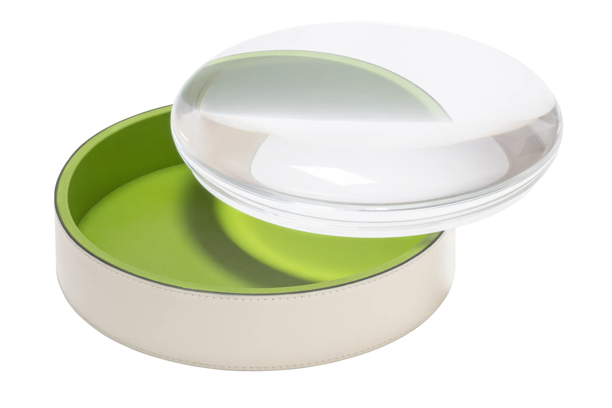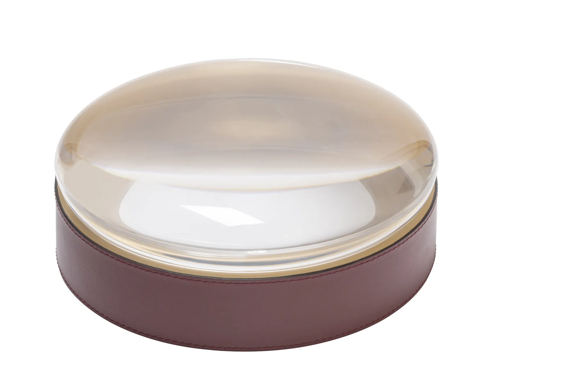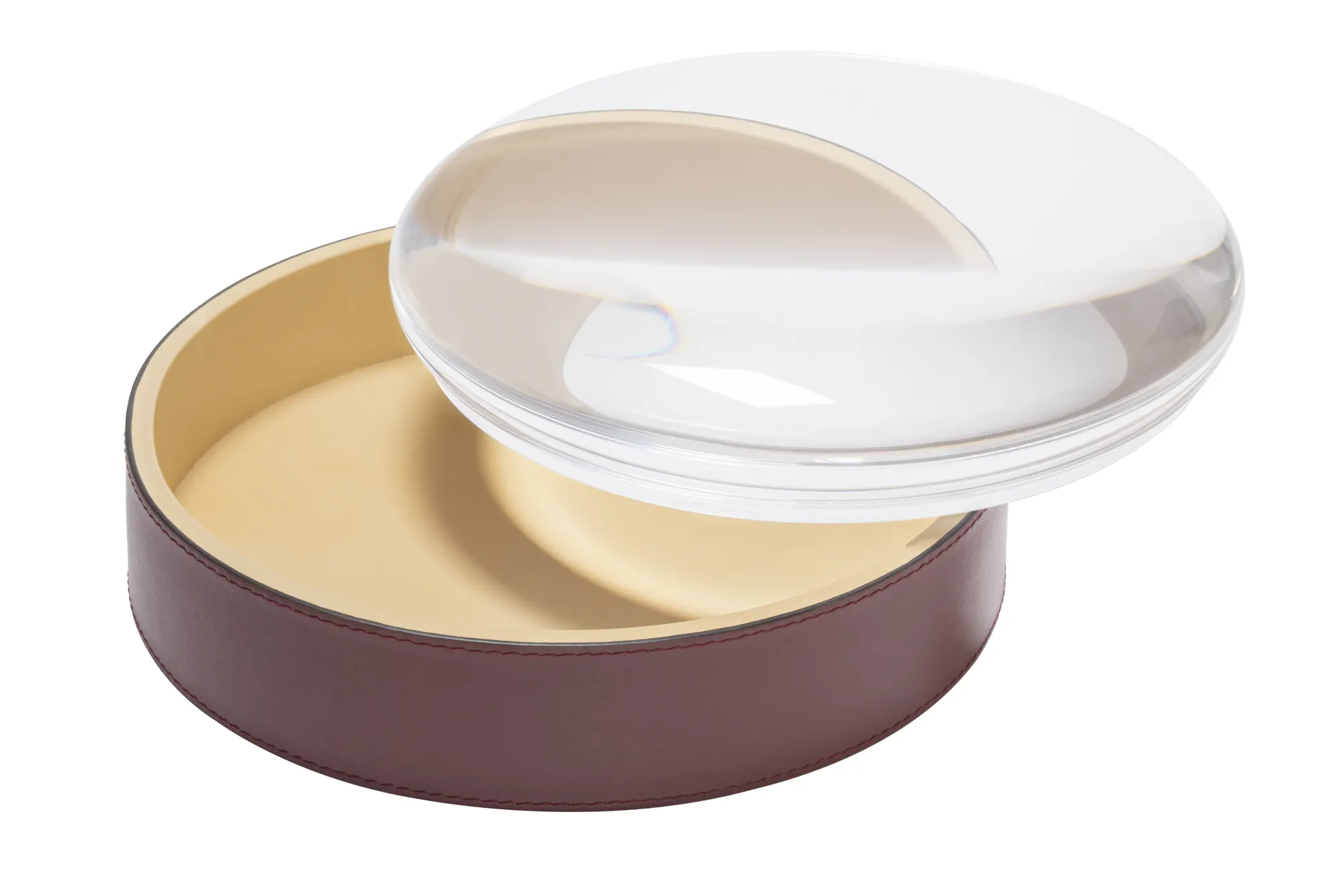 Beauty often lies in the smallest details. Dew is a captivating series of round trinket boxes that elevate the art of storage to new heights, transforming trinkets into precious jewels. A trio of trinket boxes in three different sizes, each a testament to meticulous craftsmanship. The allure of fine leather with its sumptuous texture is combined with enchanting plexiglass lids that resemble delicate dewdrops glistening in the morning sun, casting a mesmerizing magnifying lens effect over the treasures within. It is possible to choose two different colors and textures for the inside and the outside of the box for an even more unique effect.