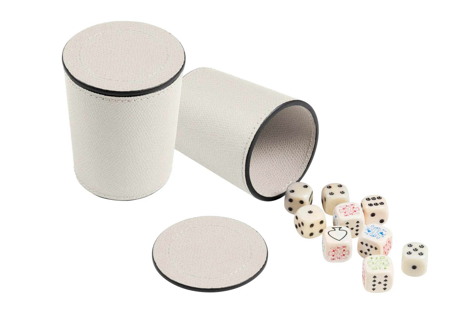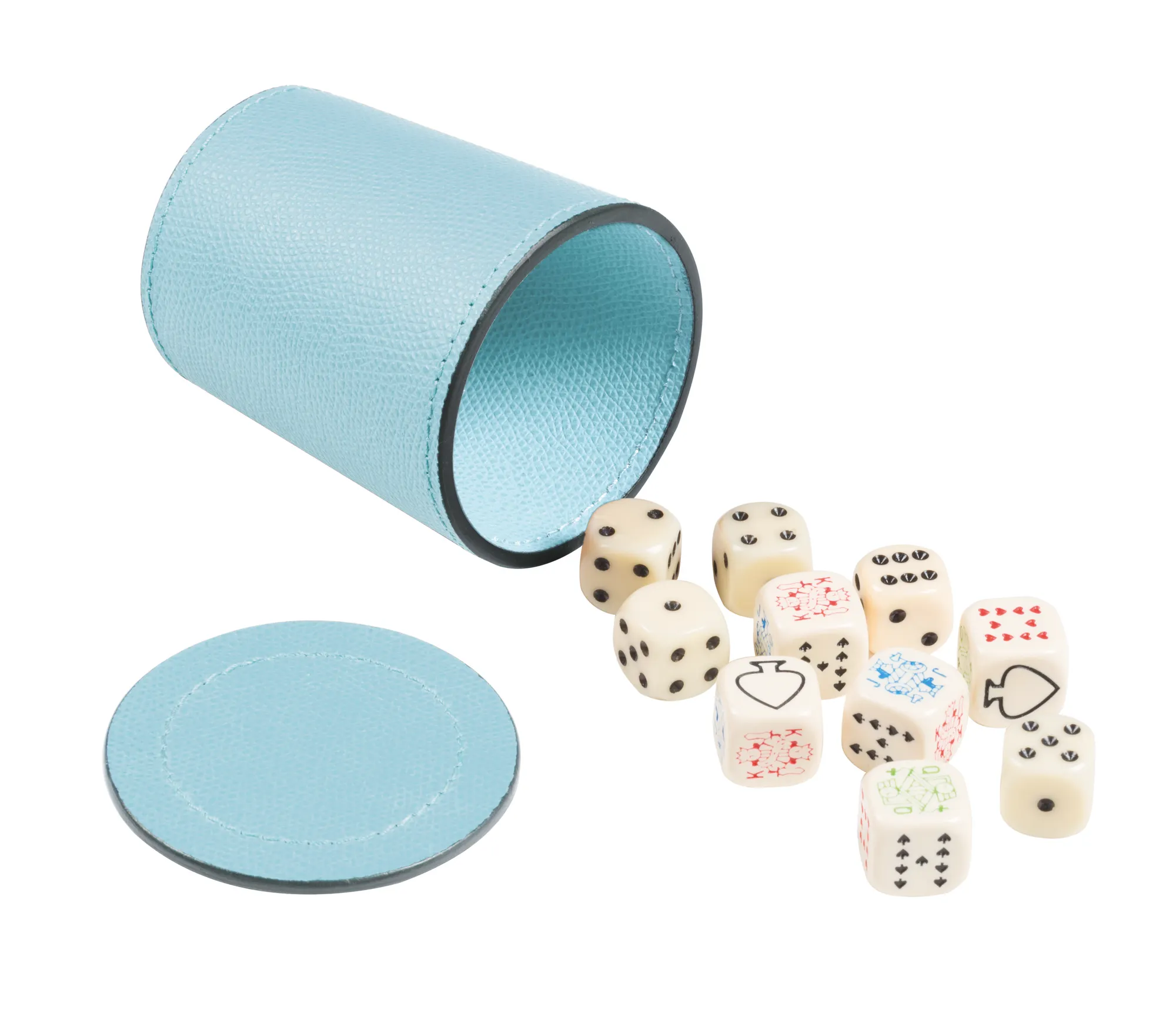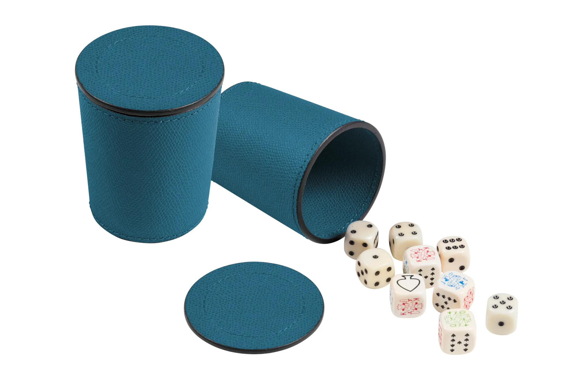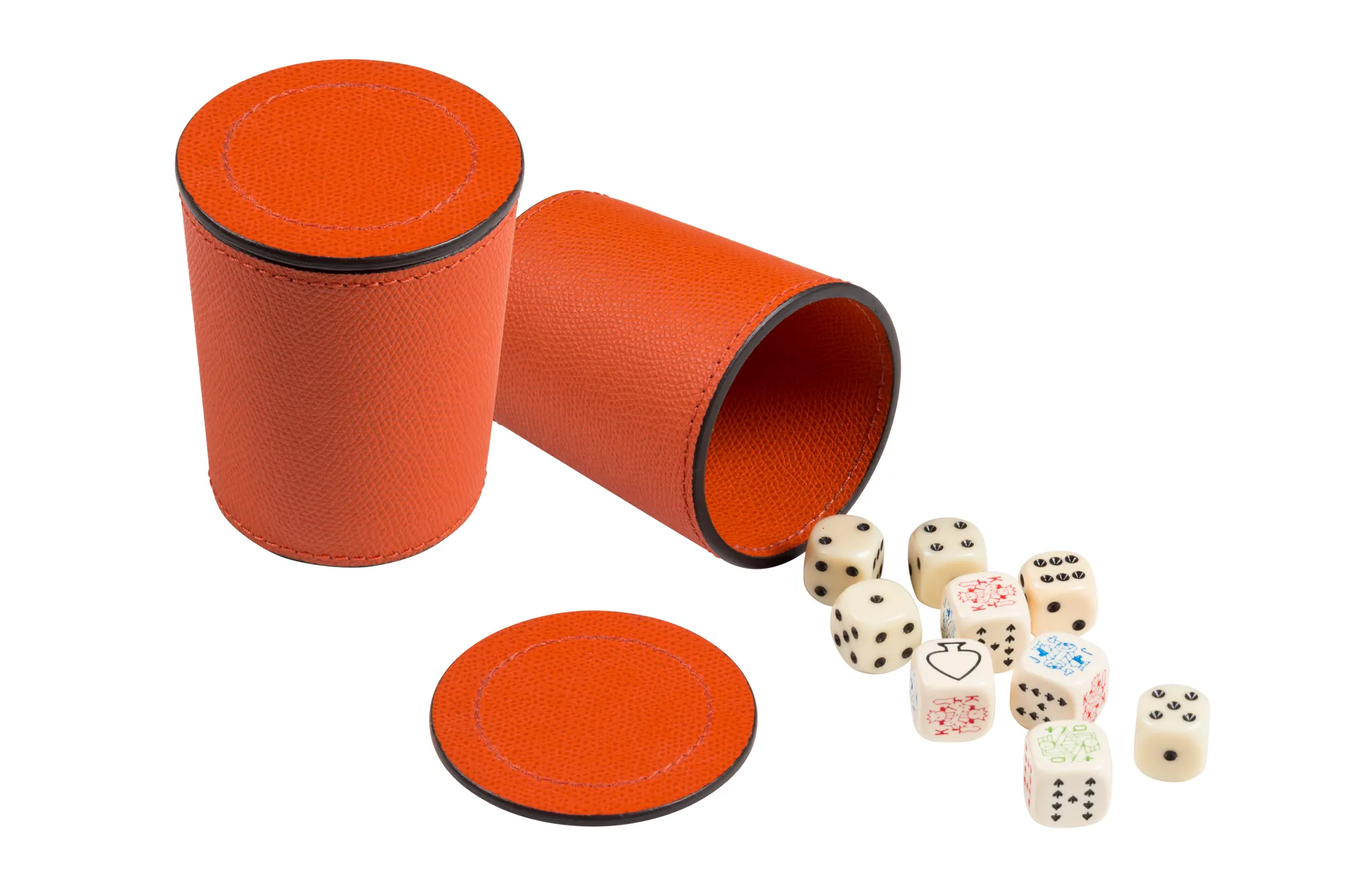All-leather structure. Comes with 5 standard dice and 5 poker dice.