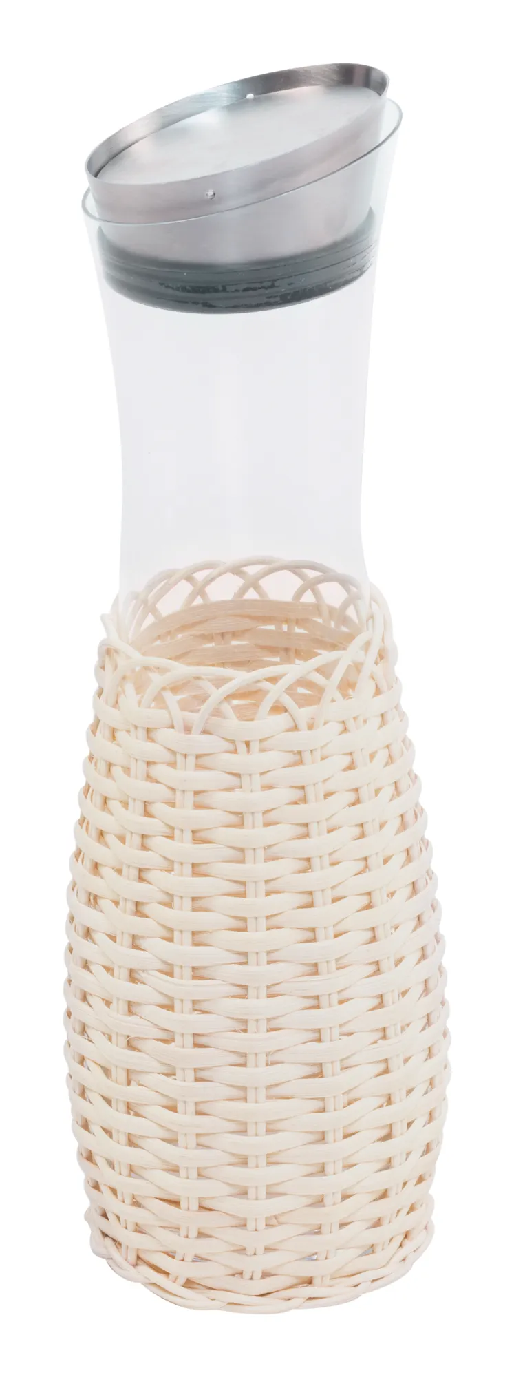 Partially rattan covered carafe made of fine crystal. Available with a stainless steel swing top lid with built-in icestopper and silicone seal. Capacity: 1 LT