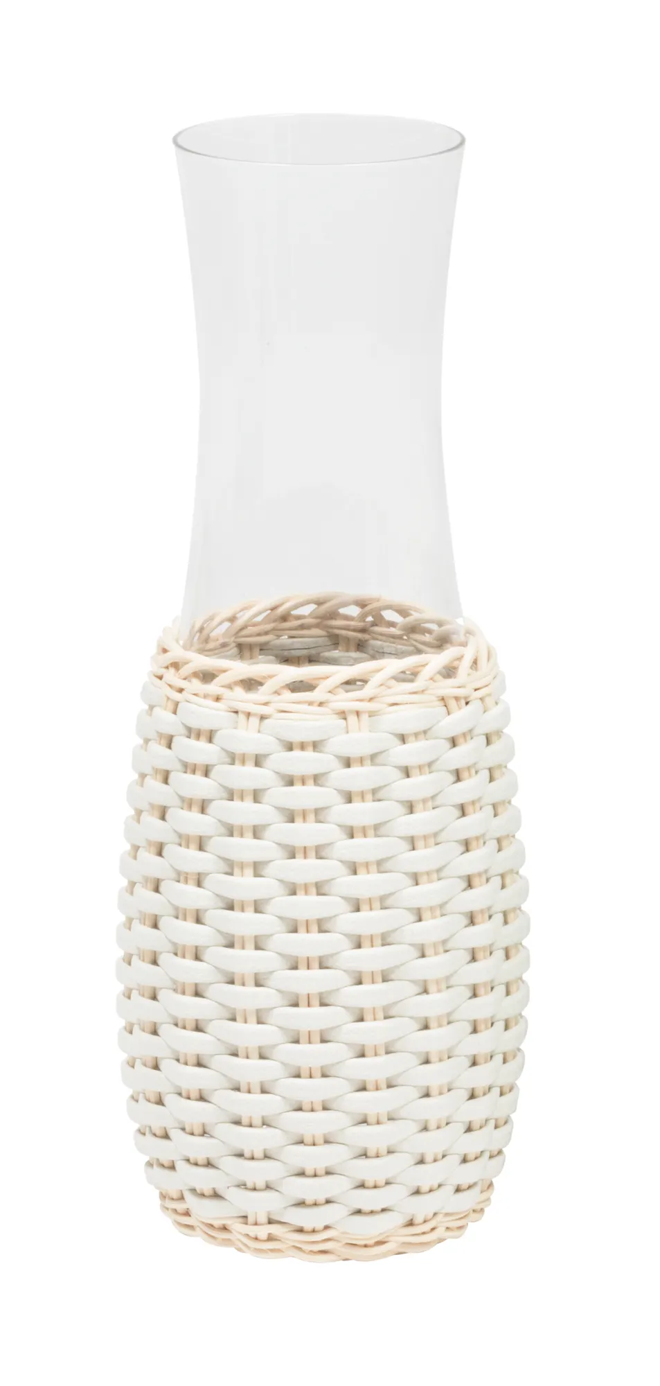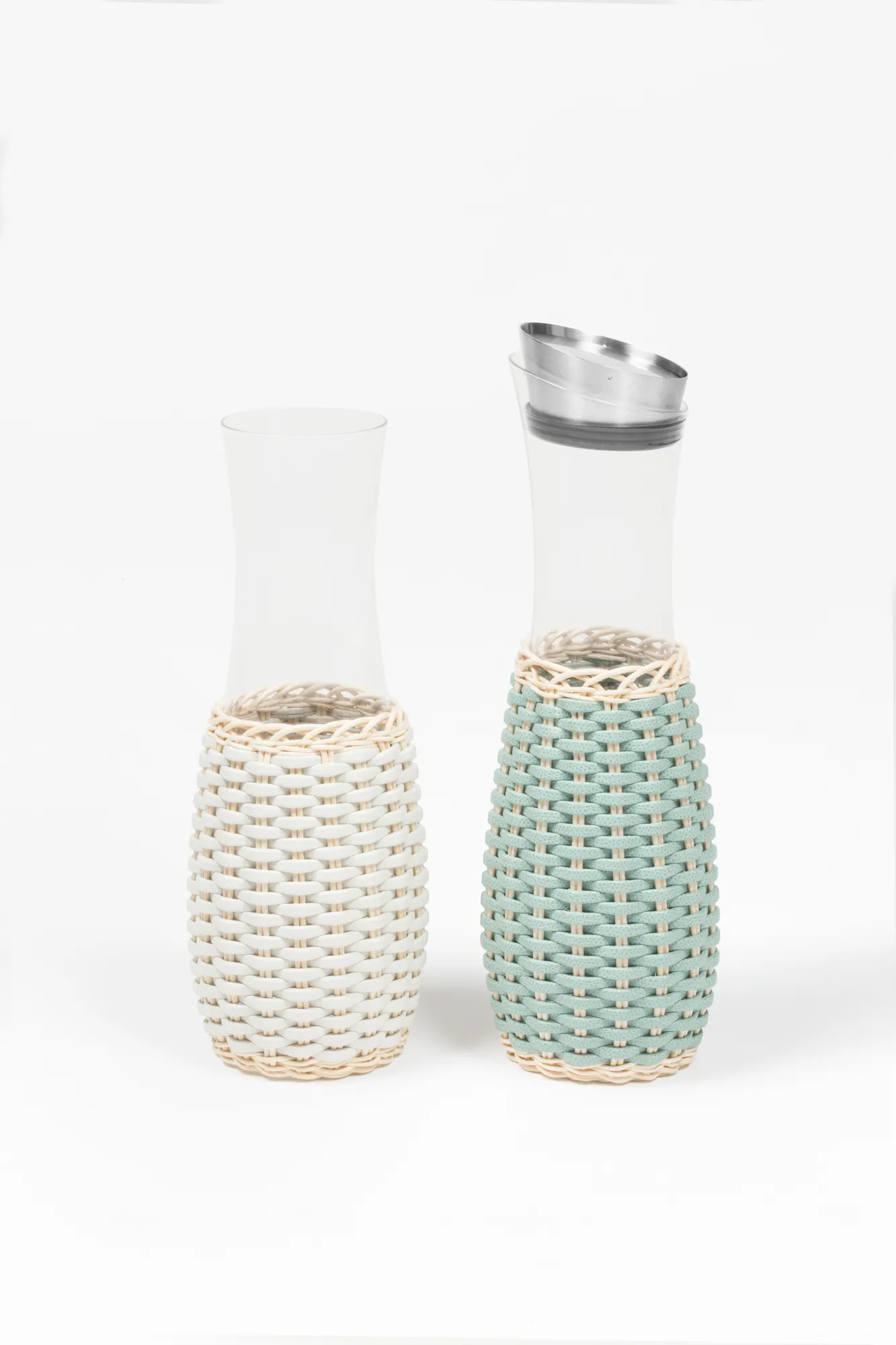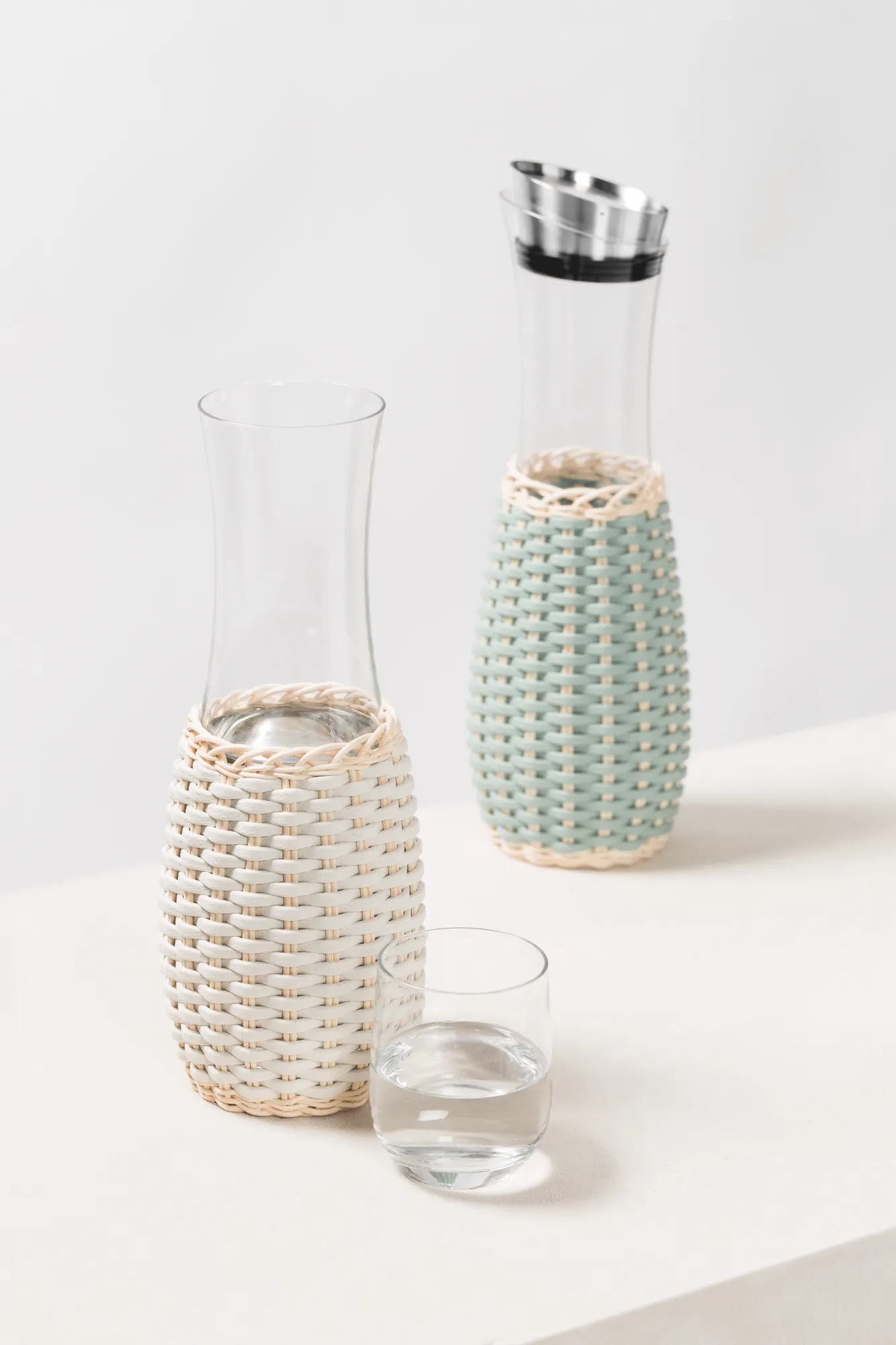 Fine crystal carafe partially covered in woven leather and rattan. Available with a stainless steel swing top lid with built-in icestopper and silicone seal.