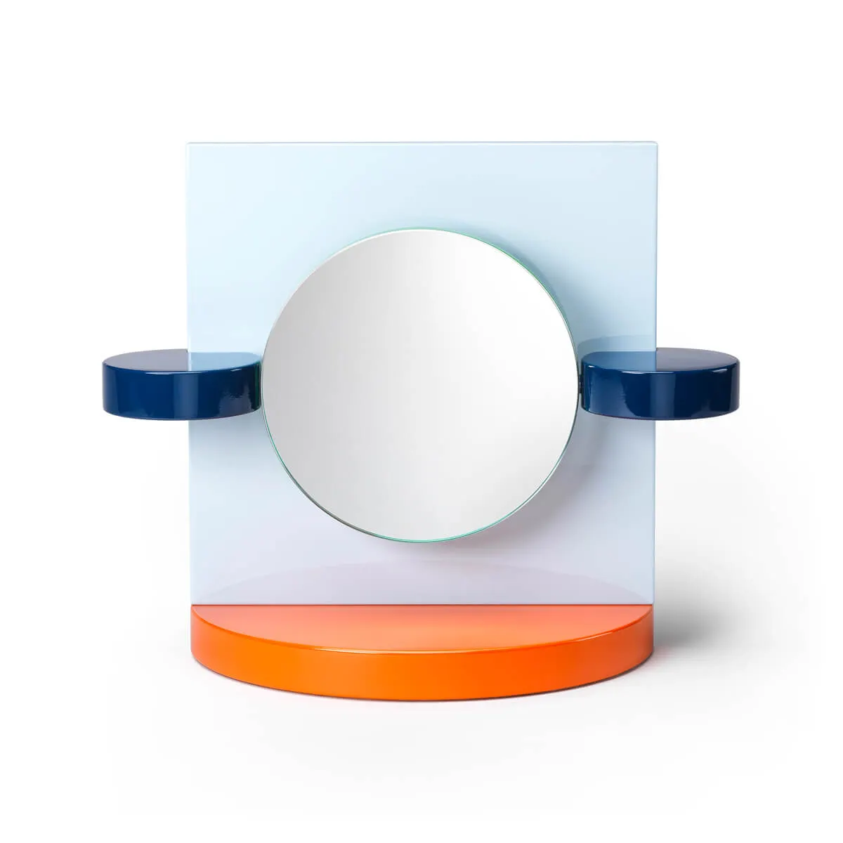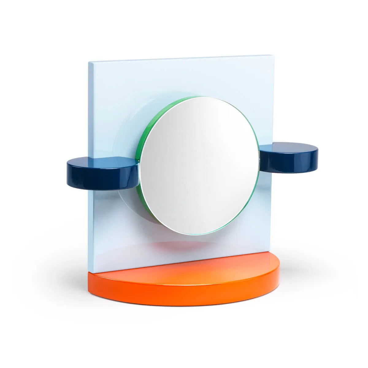 In 1985, for the magazine Donna, Michele De Lucchi designed a table mirror as a special Christmas gift. That mirror would become the inspiration for the projects Dorian and Ionian, which were then inserted in the Memphis production catalogue. Dorian and Ionian are two small mirrors in painted wood; in both, the mirror is mounted on a hinge that allows it to rotate as needed or desired. Two variations on the table mirror: in Dorian the reflecting surface is circular, mounted on a square support, while in Ionian the mirror is a square placed over a circle. A round or rectangular orange base links up with the form of the mirror, whose border is green.