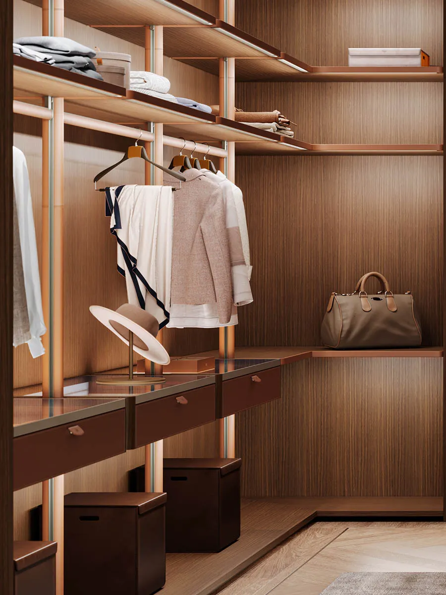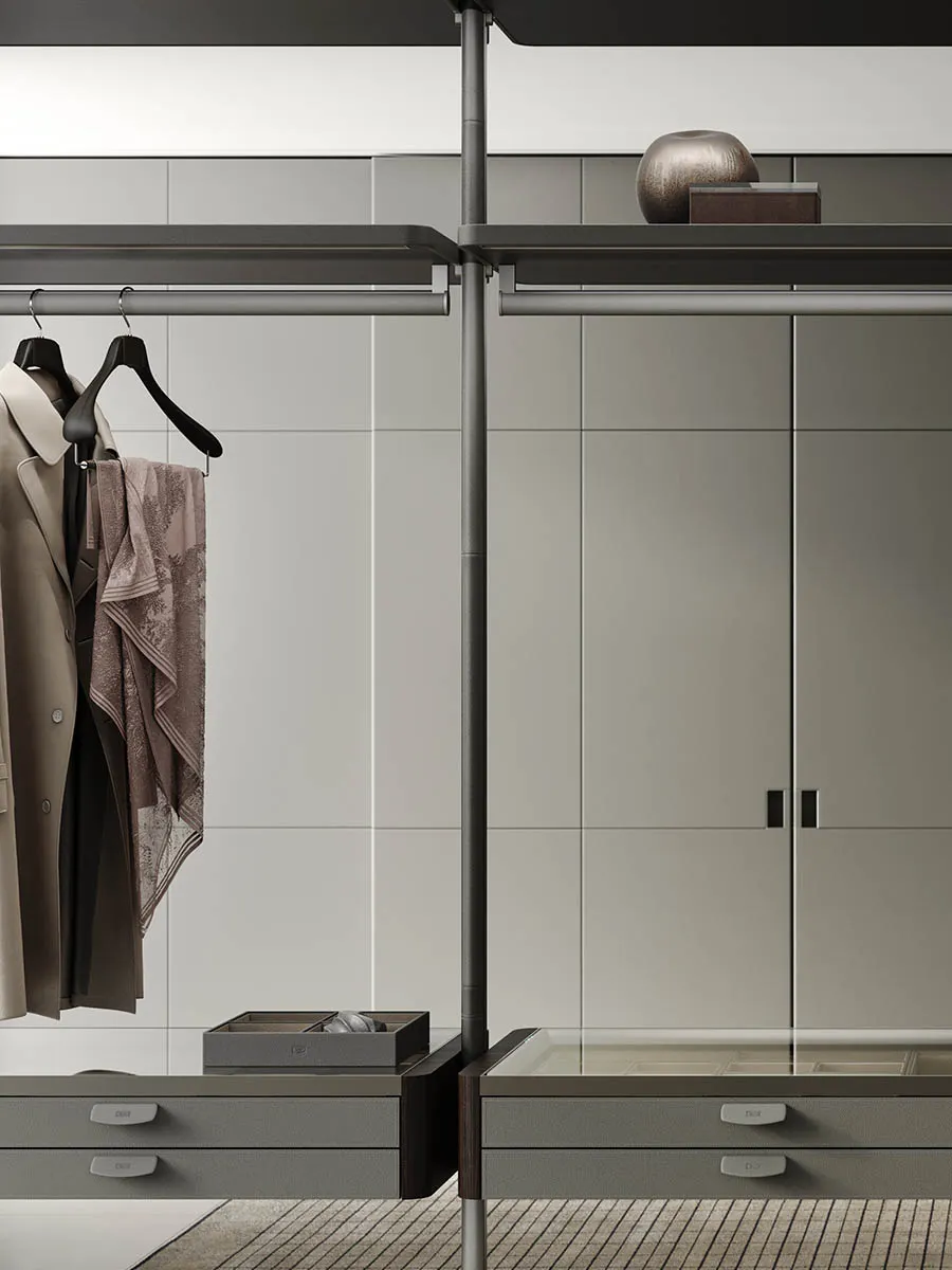 The wardrobe accessories are designed to elegantly complete Poltrona Frau’s bedroom solutions. Hangers, boxes and other handcrafted accessories are made using premium materials that enrich both traditional and walk-in wardrobes, making them even more functional.