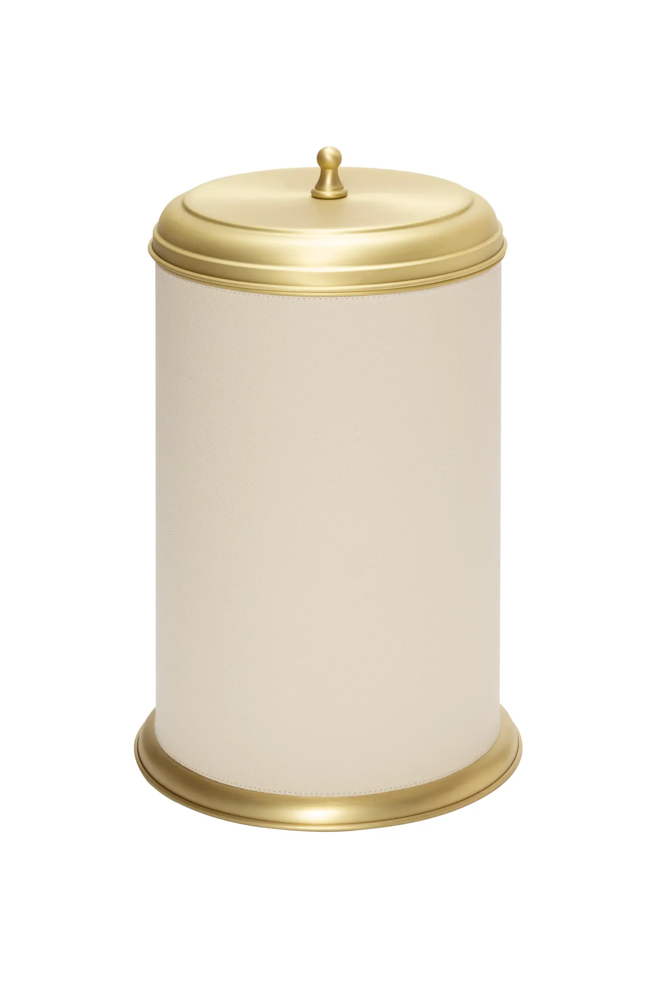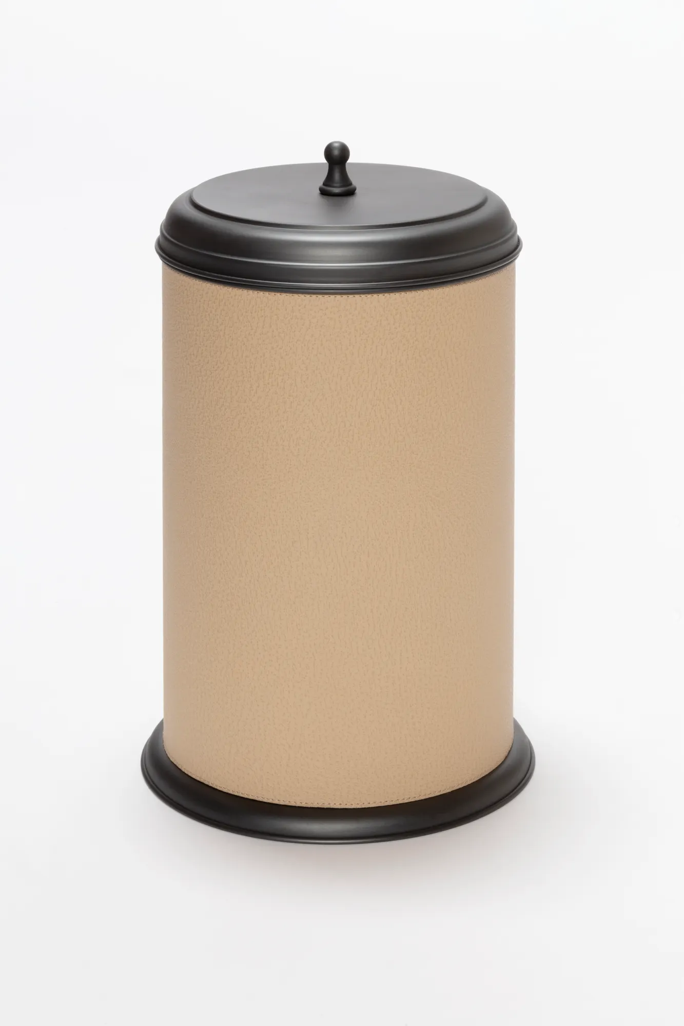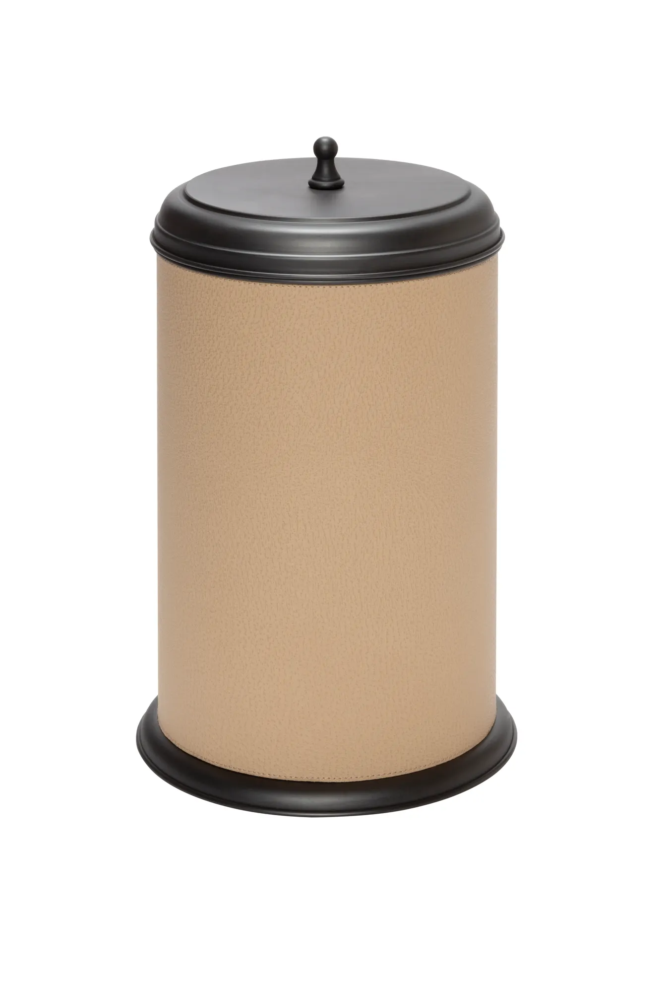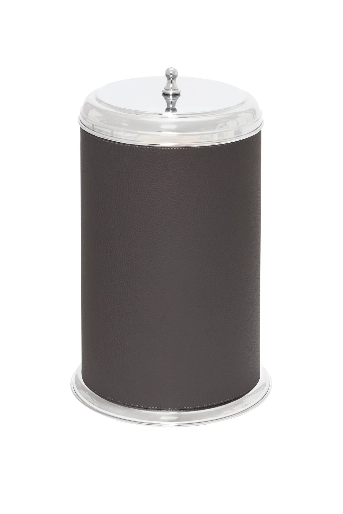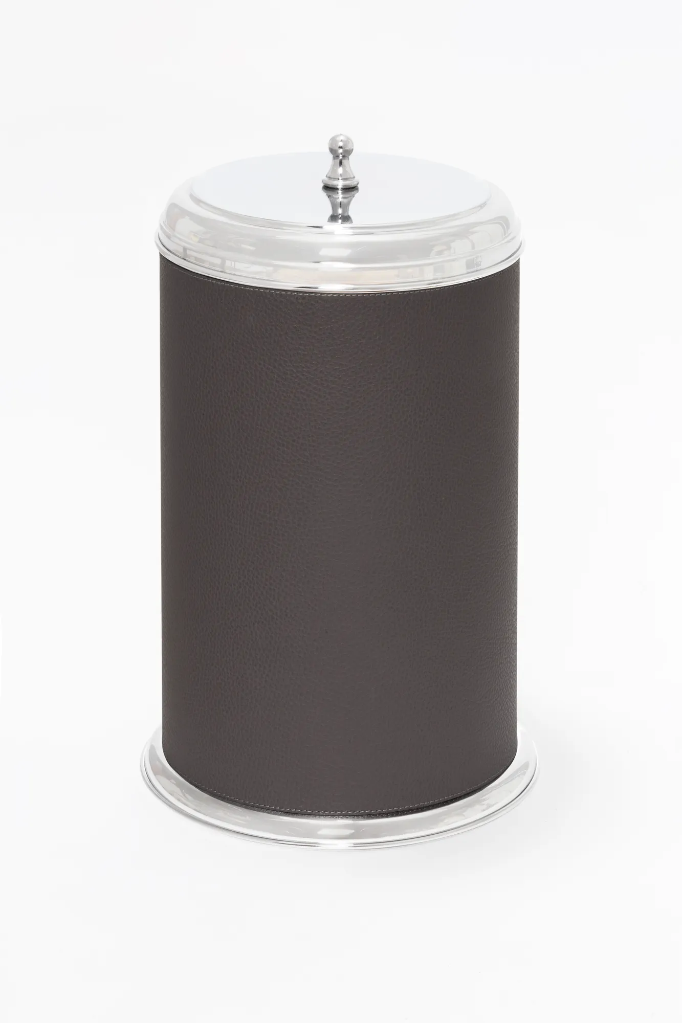 The pieces belonging to this bathroom set boast a characterizing inverted truncated cone metal structure with fine leather inserts. Featuring a series of decorative protrusions and indentations, the Manhattan collection retains a typically modern architectural appeal. Partially leather-covered metal structure provided with removable inner dark-stained metal container. Non-slip waterproof rubber base underneath.