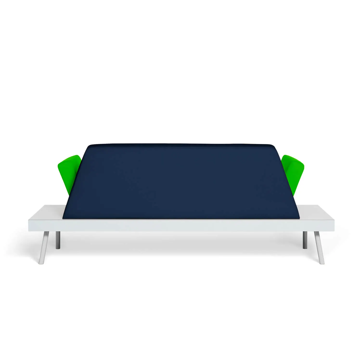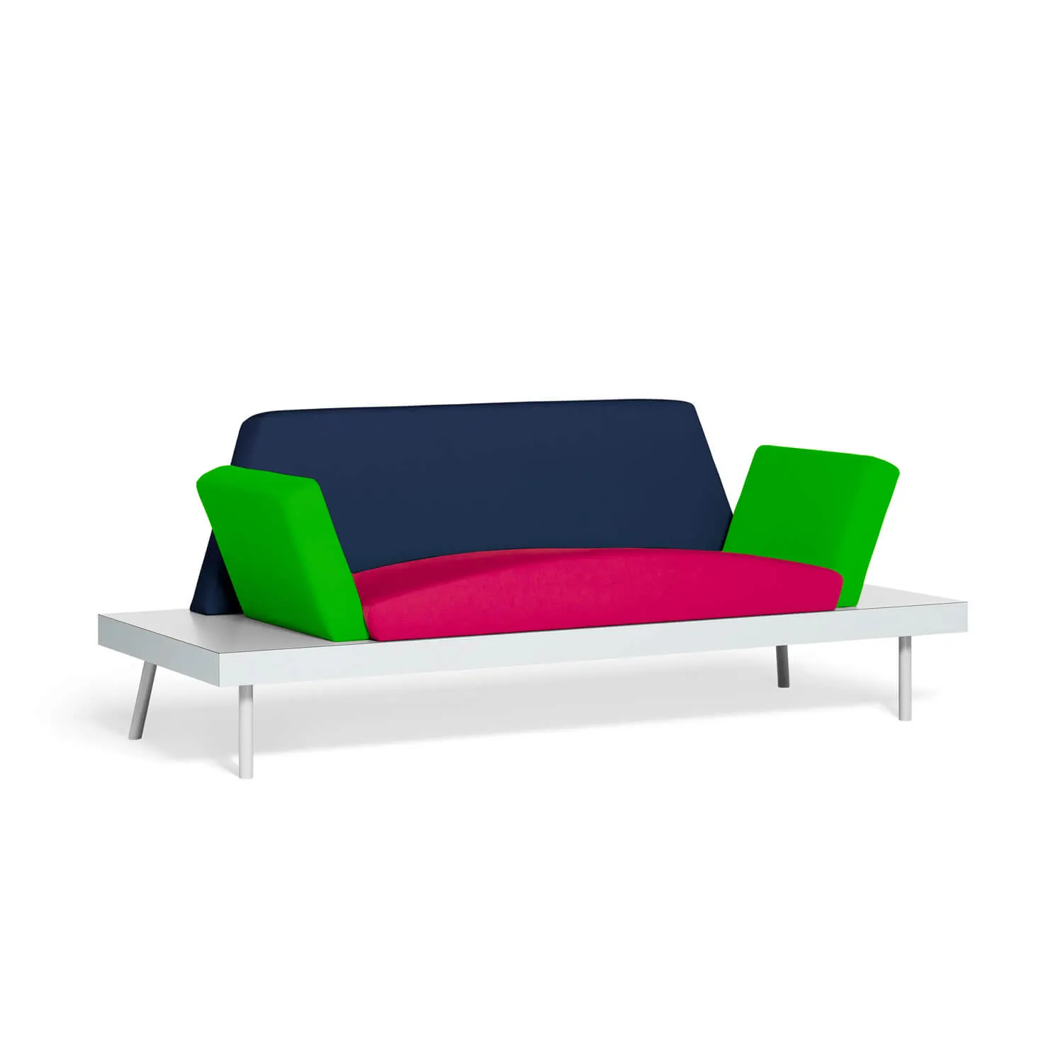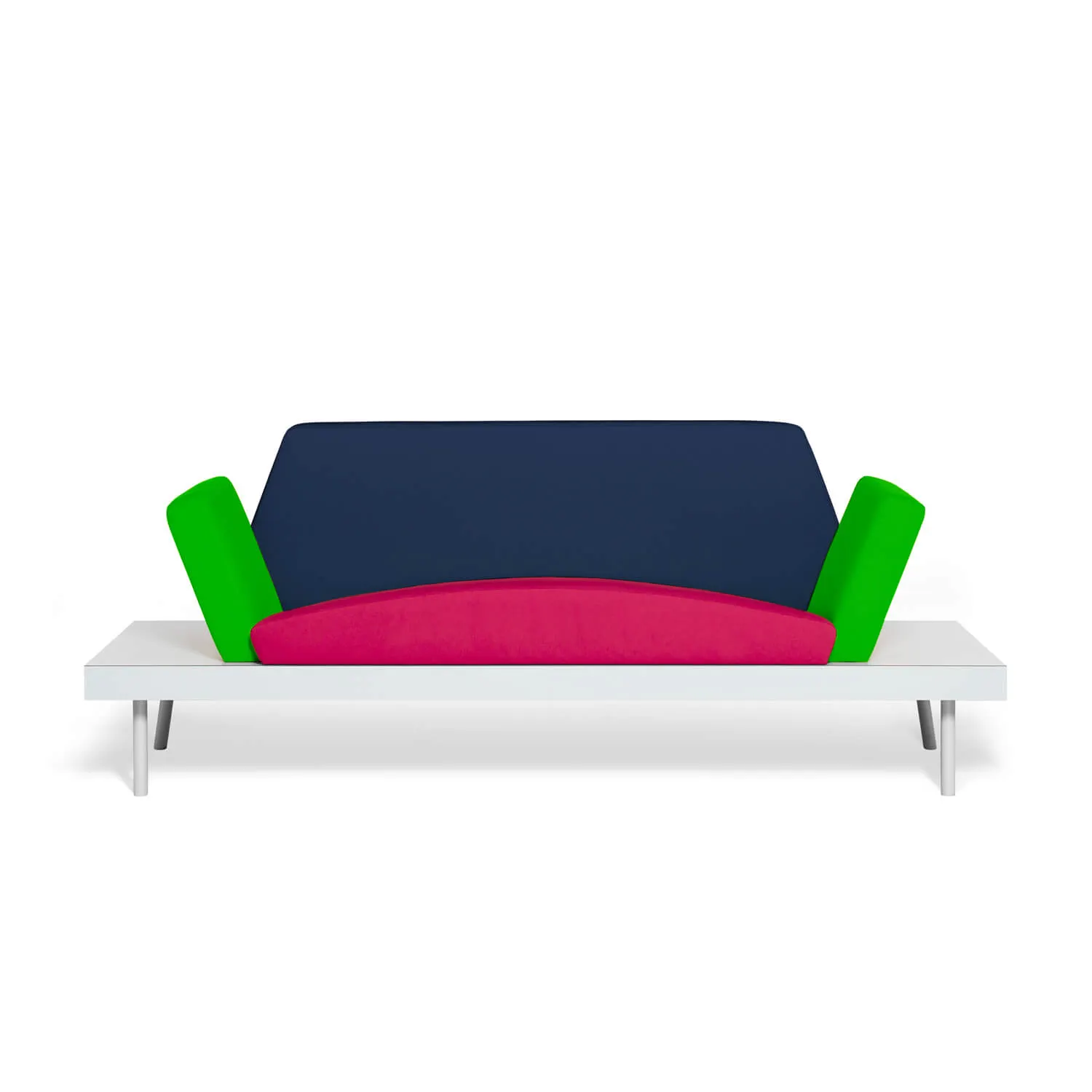 Futuristic design and lively colors are the characteristics of Dublin, the sofa created by Marco Zanini for Memphis in 1981. Since the early 1980s, Dublin is also offered in a combination of colors, juxtaposing green armrests and a pink seat with the blue of the back: this version of the elegant sofa by Marco Zanini was created for the legendary apartment of Karl Lagerfeld in Monaco, completely furnished with the finest creations of Memphis. Wooden sofa covered with decorative laminate, painted metal legs, fabric upholstery. Limited edition of 10 pieces.