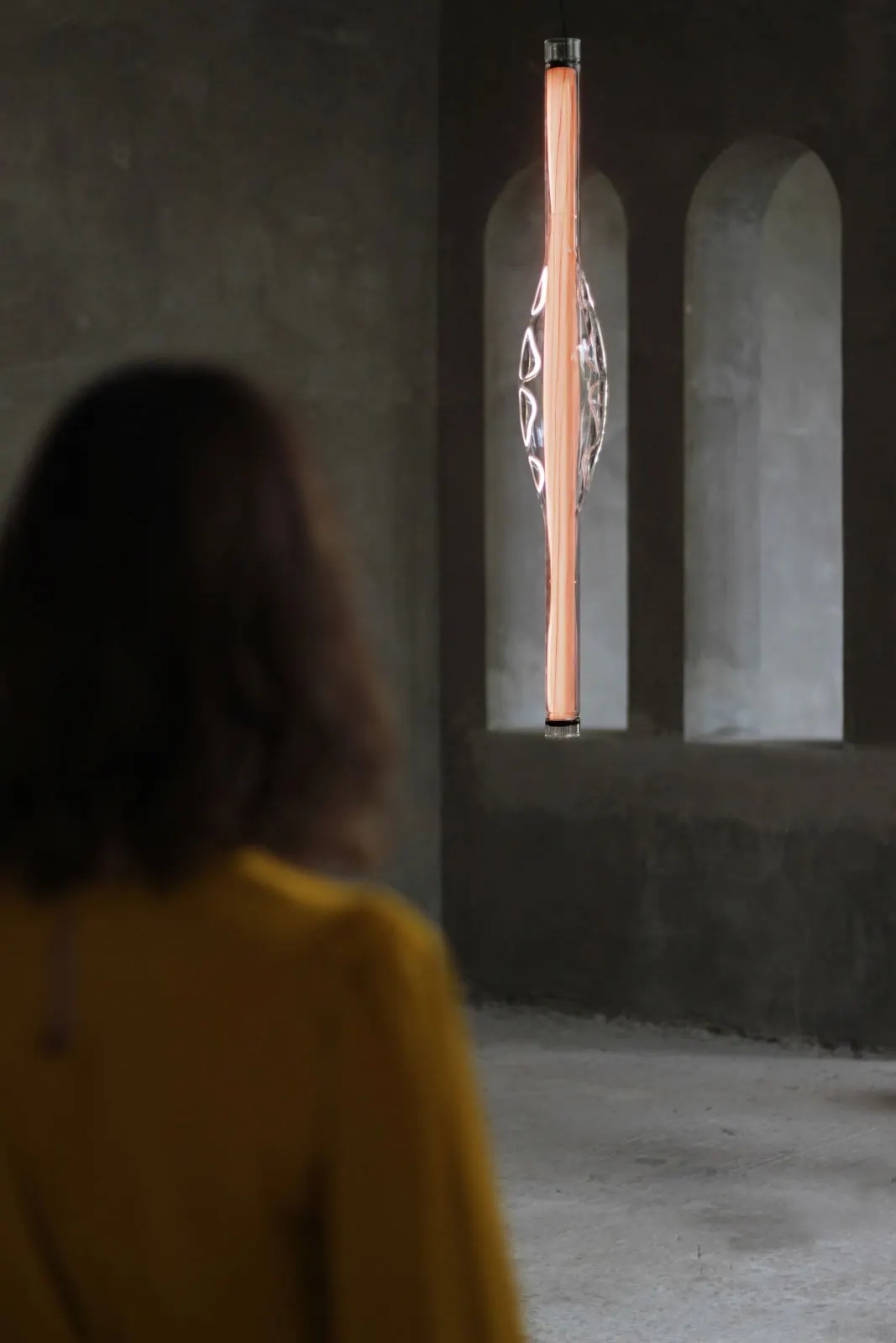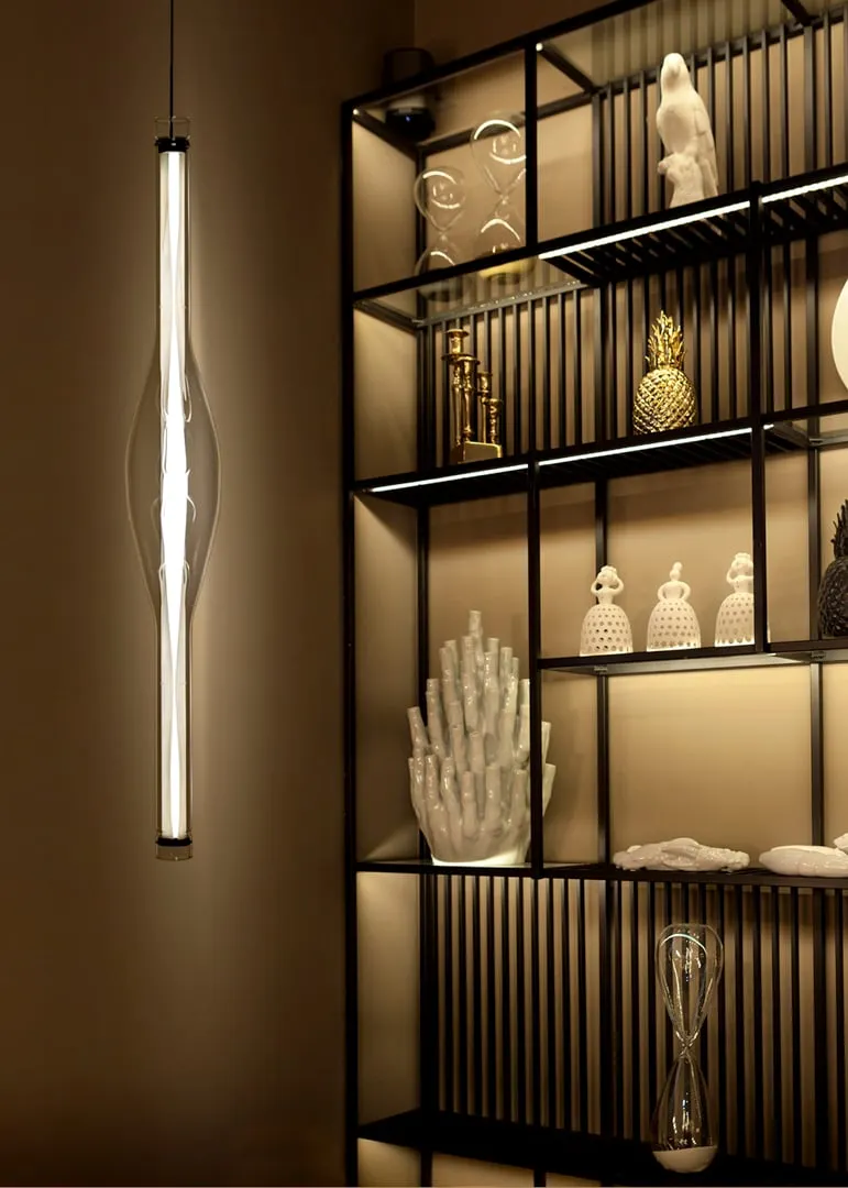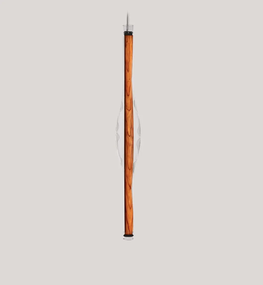 DUNE VERTICAL THE AMORPHOUS LIGHT. The award-winning Dune, imaginatively designed by Mayice, is now available in a striking vertical version. When the vertical Dune extends toward the floor, the complexity of its design is further evidenced. Hand-blown by master craftsman Eduard Garuti, Dune's distinctive bulb-shaped lamp center is especially unique. By encapsulating LZF's wood veneer in a borosilicate glass diffuser, Dune appears gloriously vivid and warm. The vertical Dune is available in several wood colors: Ivory White, Natural Cherry, Natural Beech, Pale Pink and Sea Blue.